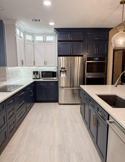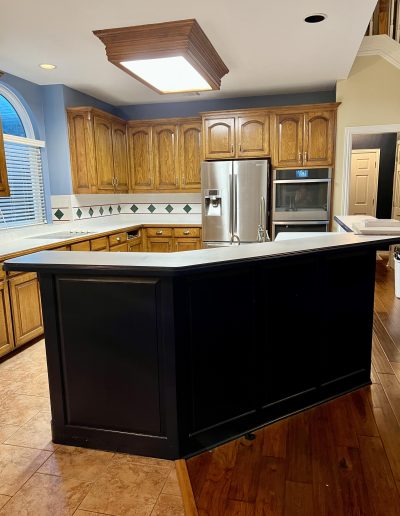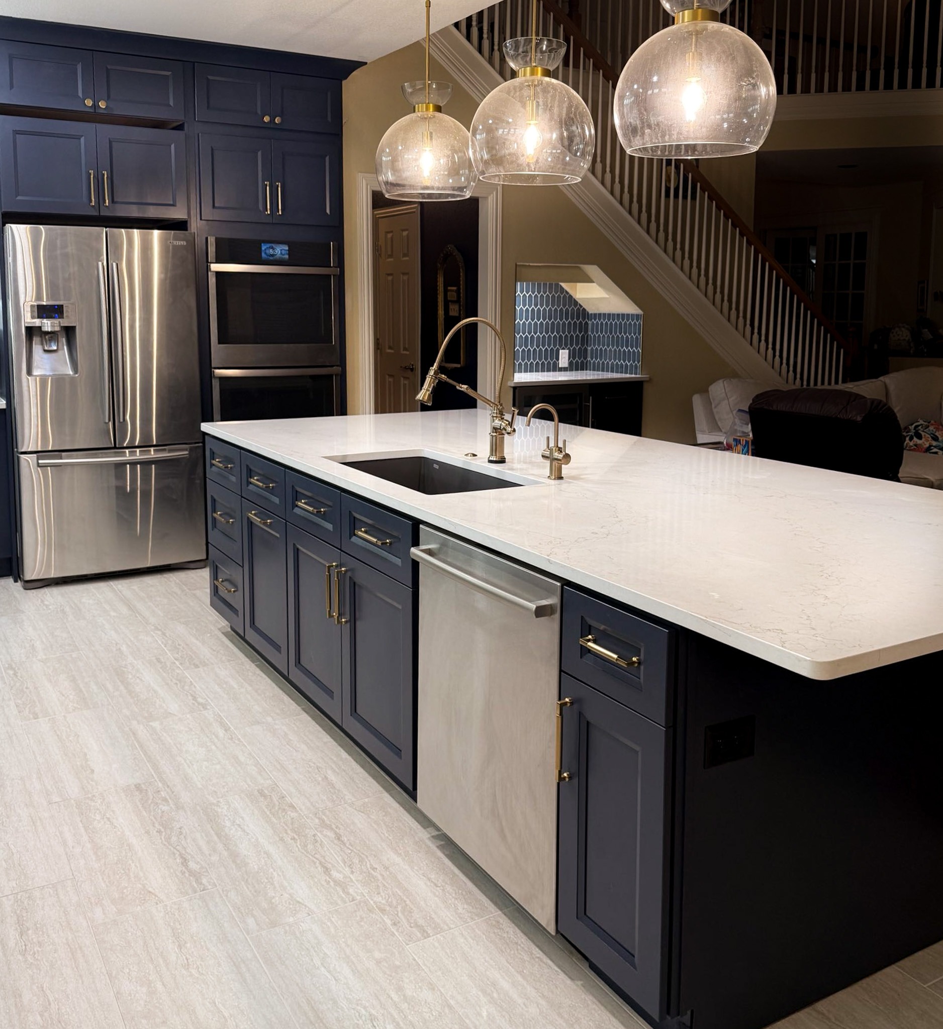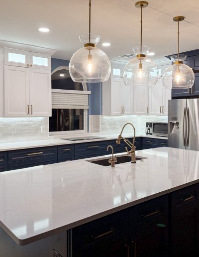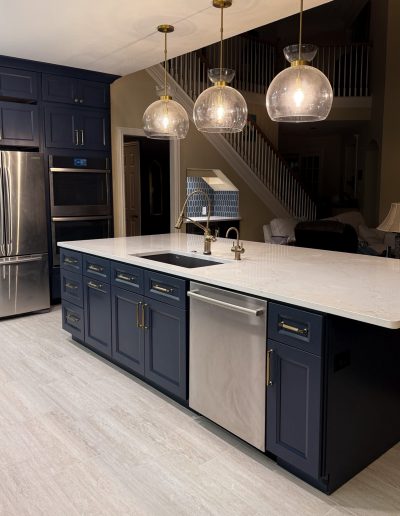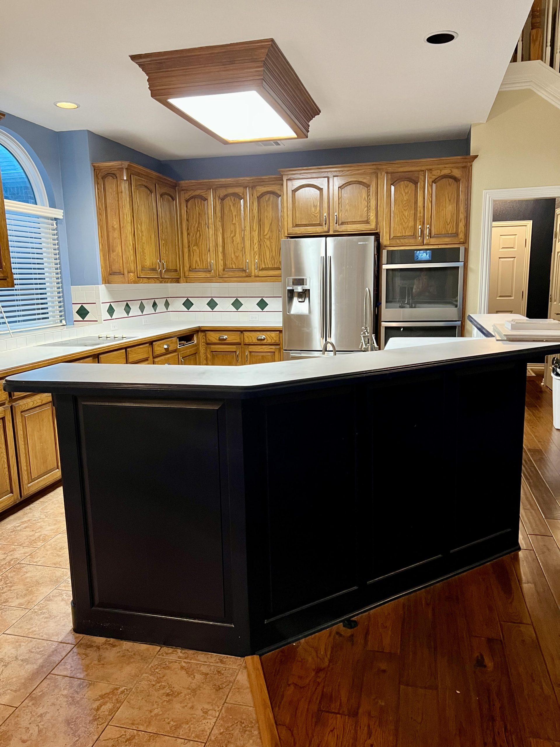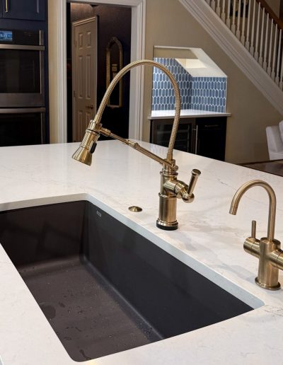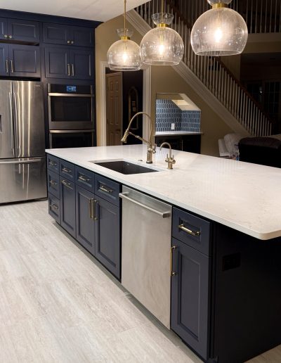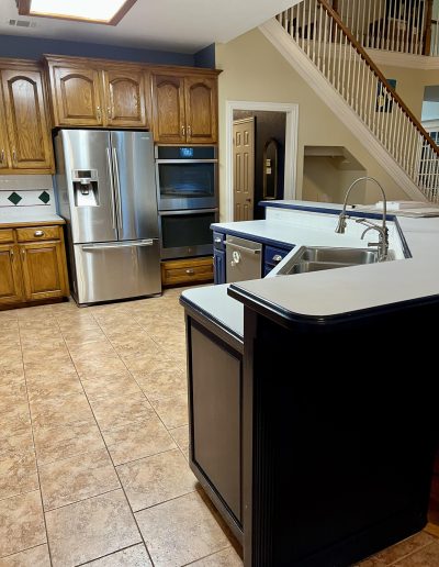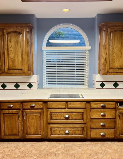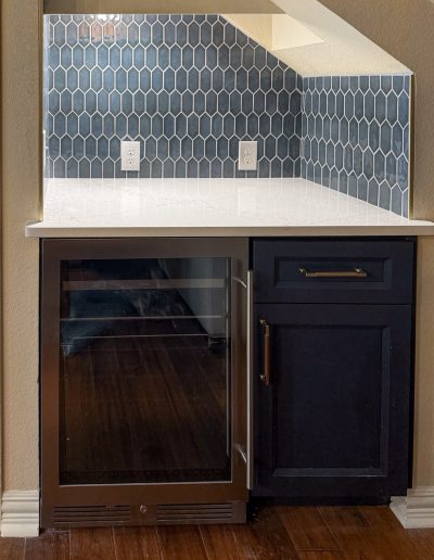 This kitchen in Bedford was showing its age, with the traditional-style cabinets, diamond tile and the multi-level island. We helped to transform this kitchen by replacing the tile floors and adding new, semi-custom cabinets, quartz countertops, and a zellige tile backsplash. This project included a small beverage center off of the living room where we installed a fun accent tile. We think that the changes in this kitchen helped it feel much brighter and more modern.