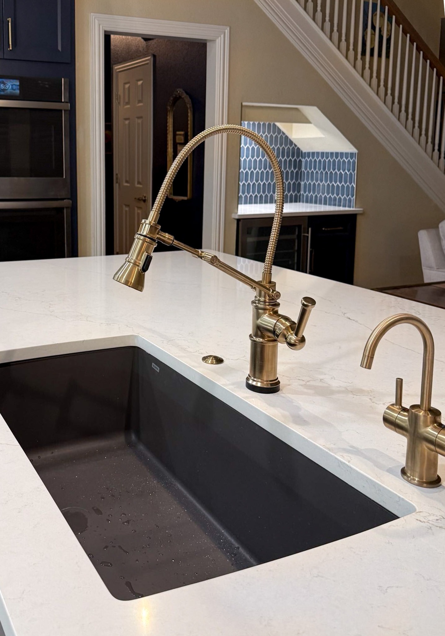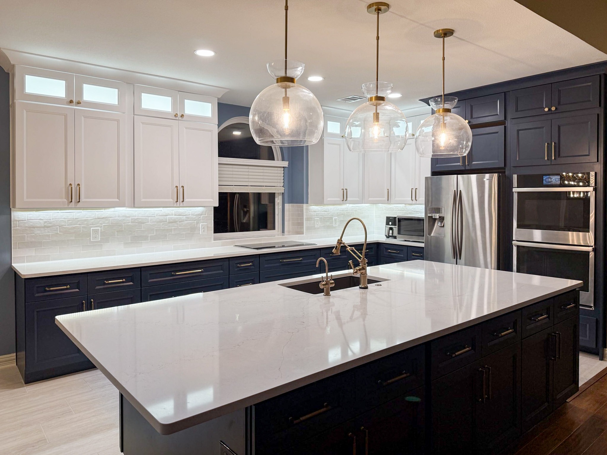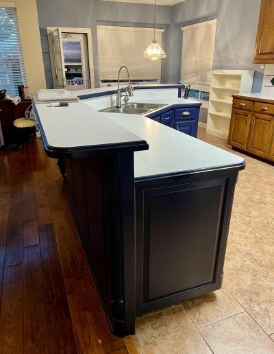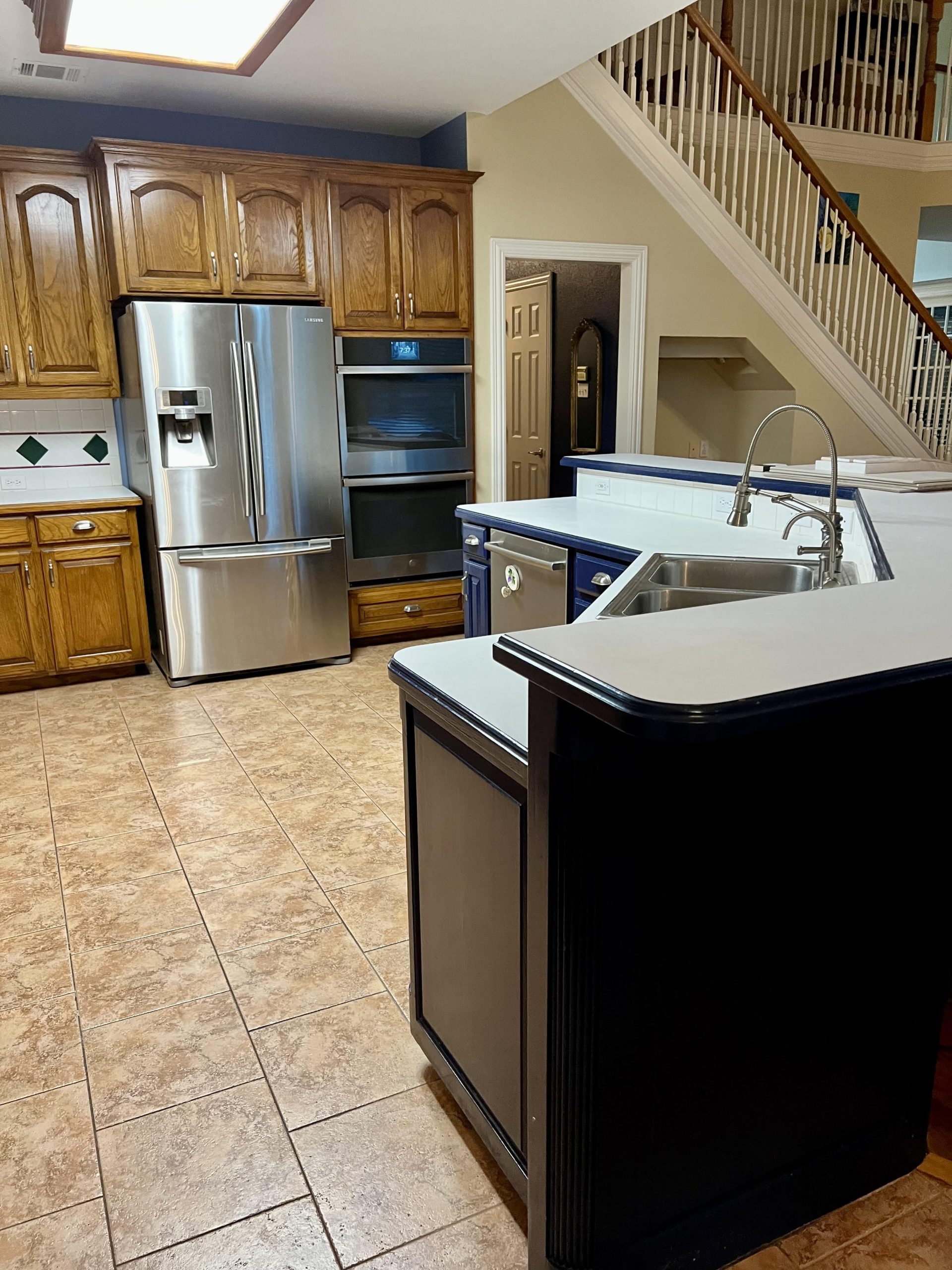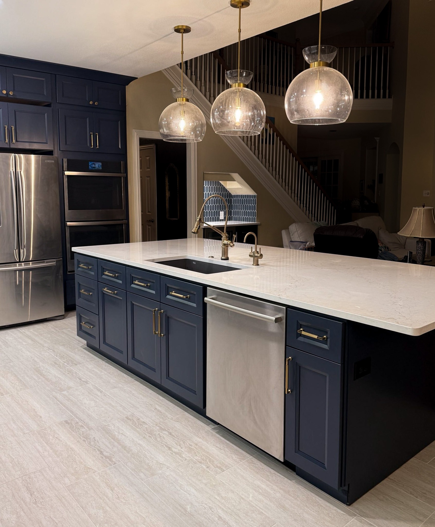 This kitchen in Bedford was showing its age, with the traditional-style cabinets, diamond tile and the multi-level island. We helped to transform this kitchen by replacing the tile floors and adding new, semi-custom cabinets, quartz countertops, and a zellige tile backsplash. This project included a small beverage center off of the living room where we installed a fun accent tile. We think that the changes in this kitchen helped it feel much brighter and more modern.