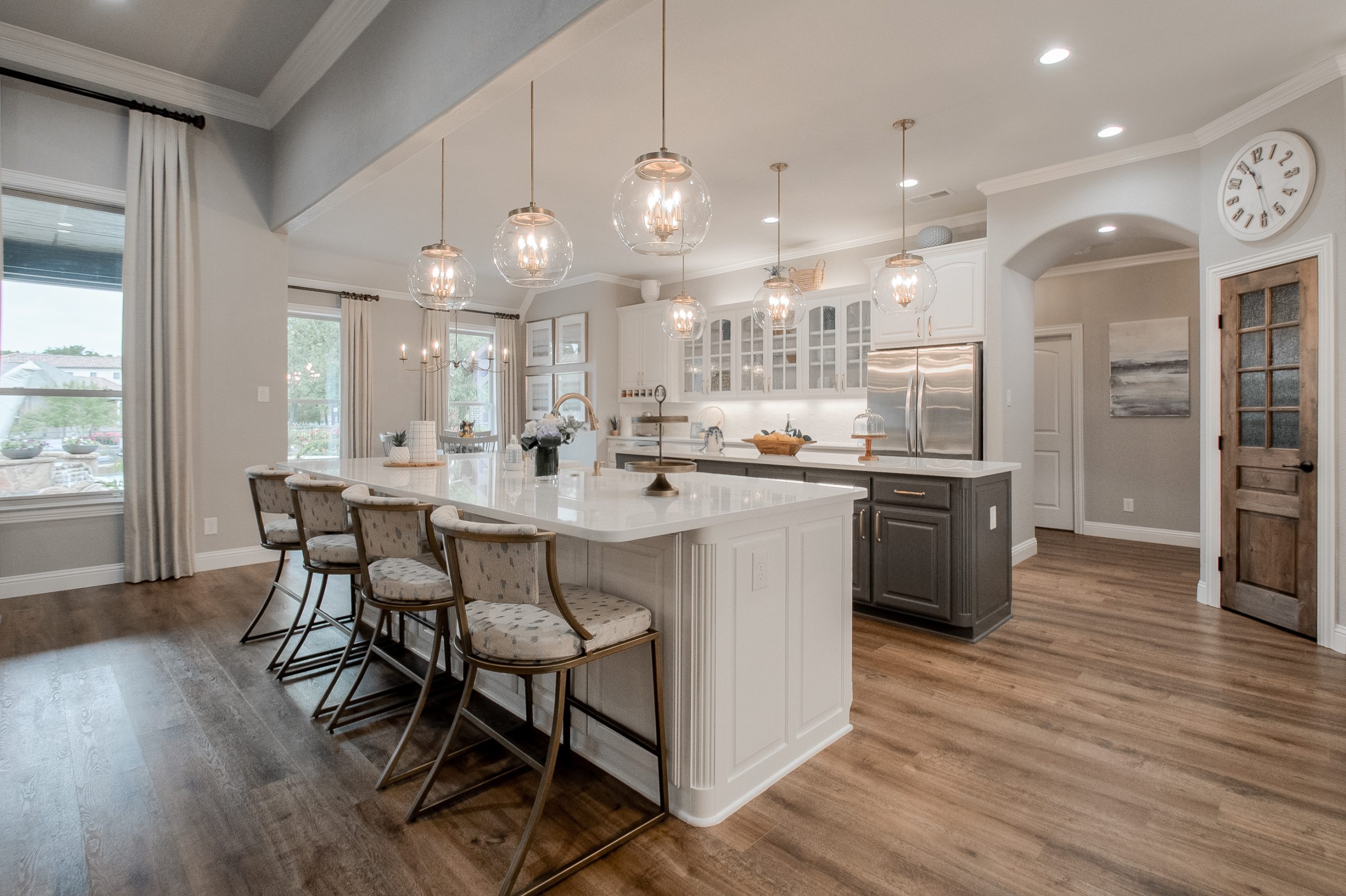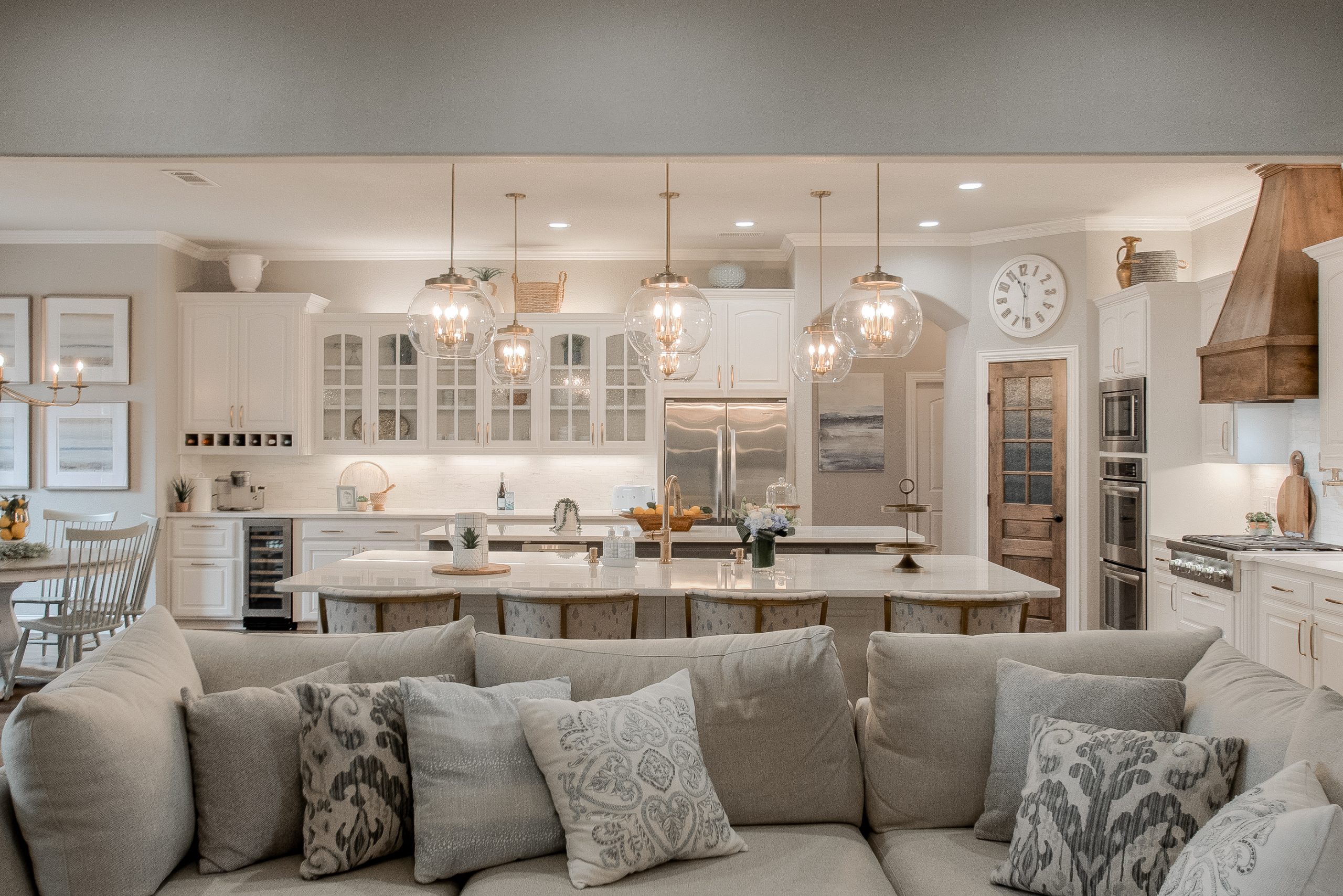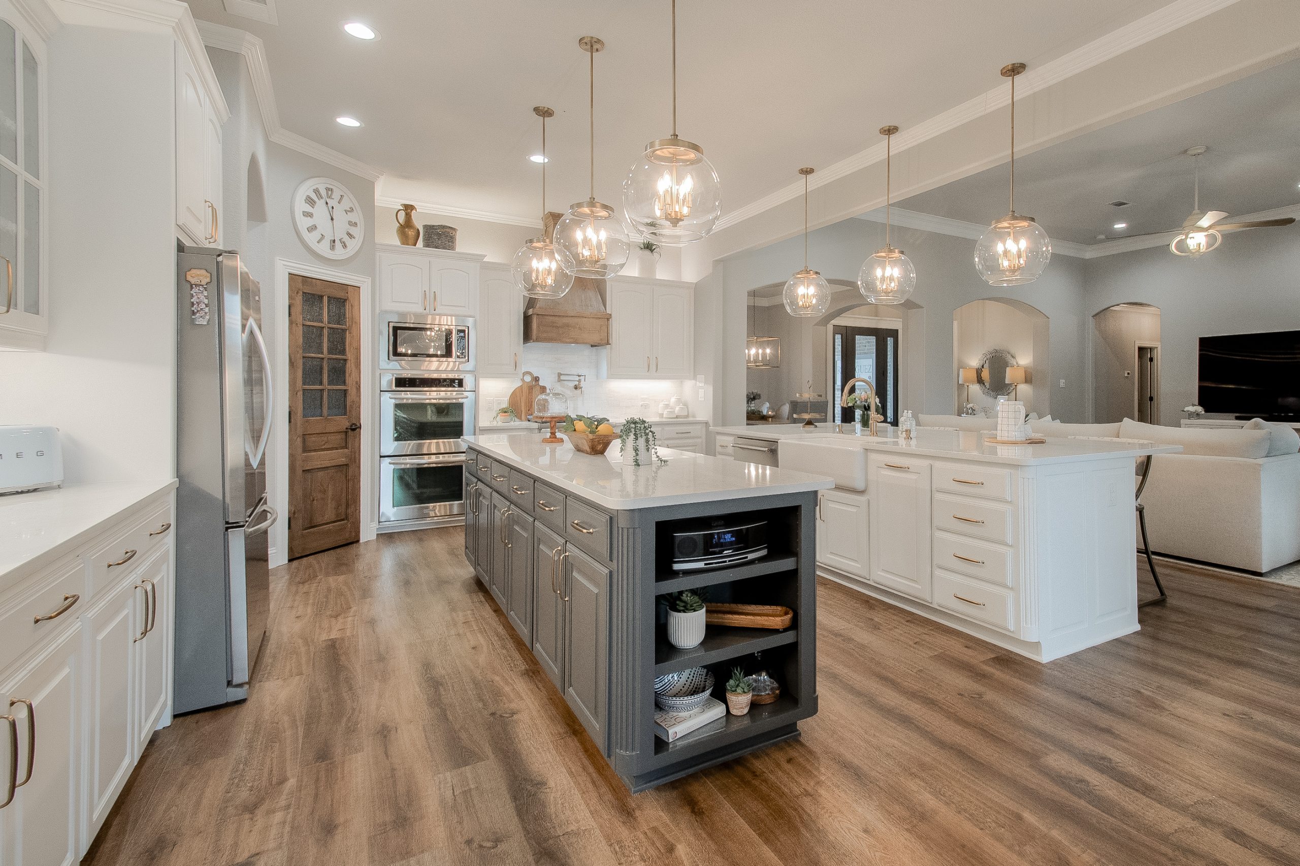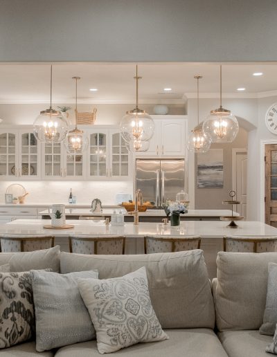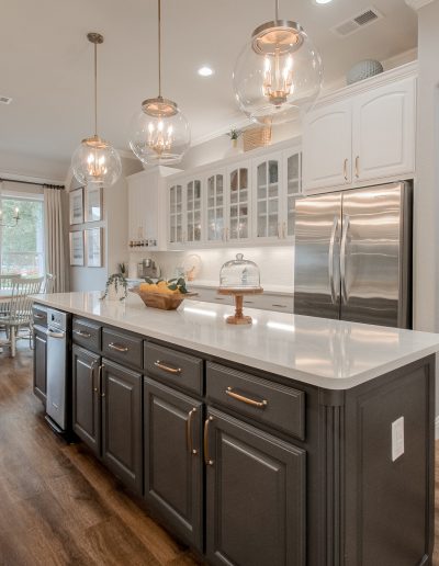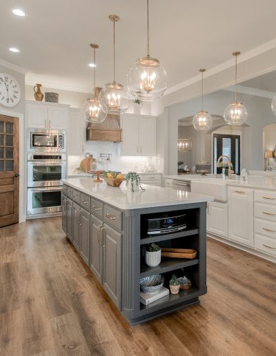 This kitchen began as dark, Tuscan-styled space, closed off from the family room. We kept the existing perimeter cabinets and painted them, and knocked down the wall between family room and kitchen to open it all up. We designed custom double islands, and installed a custom pantry door and vent hood. All materials were updated to bring in more light and make the space more functional for hosting large gatherings.