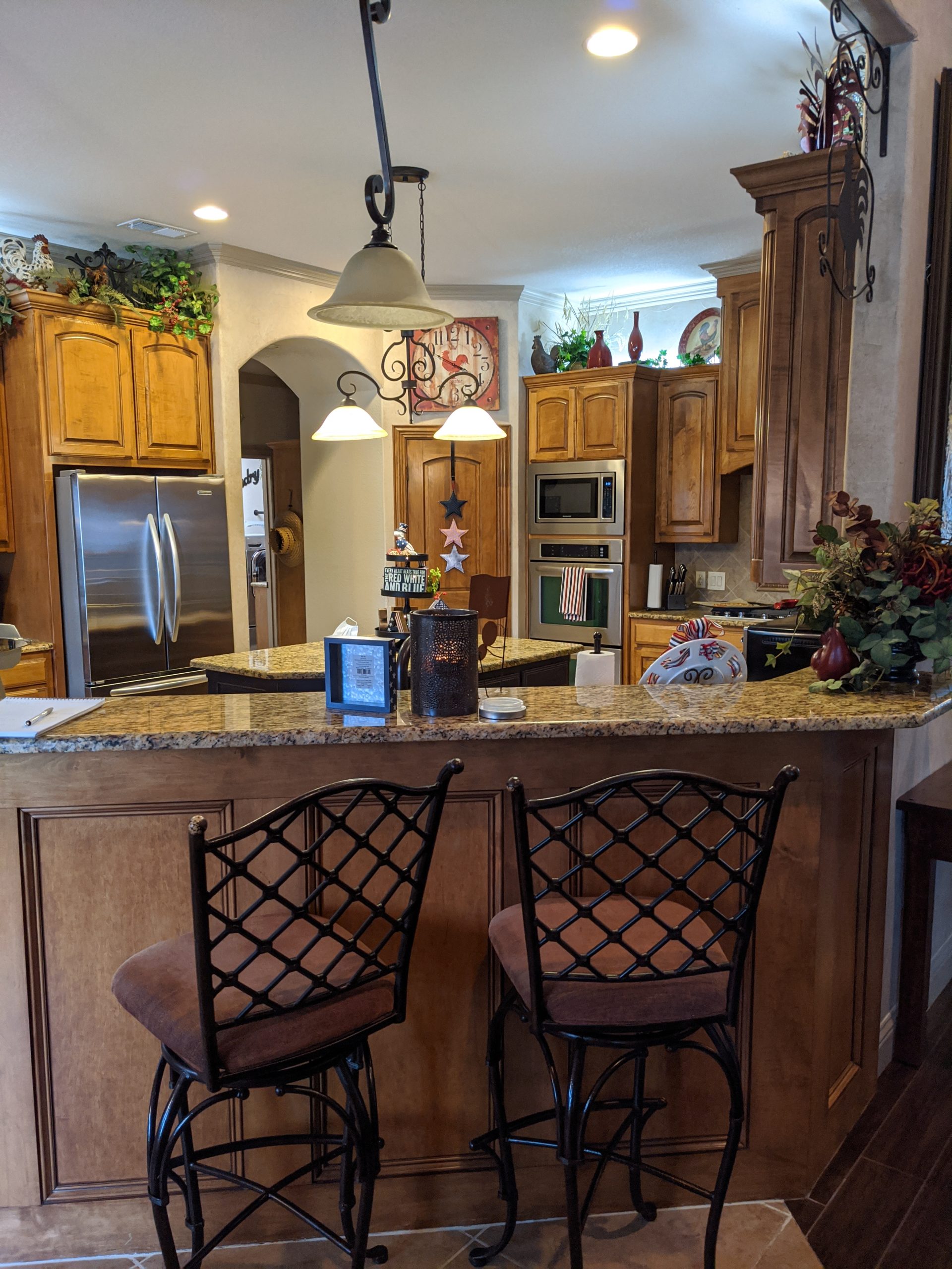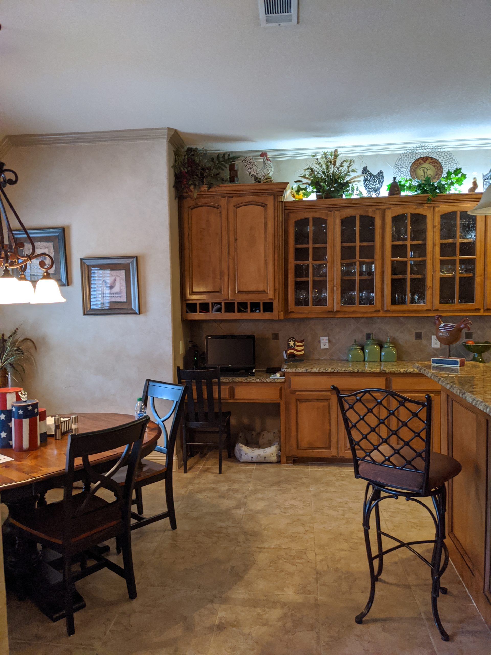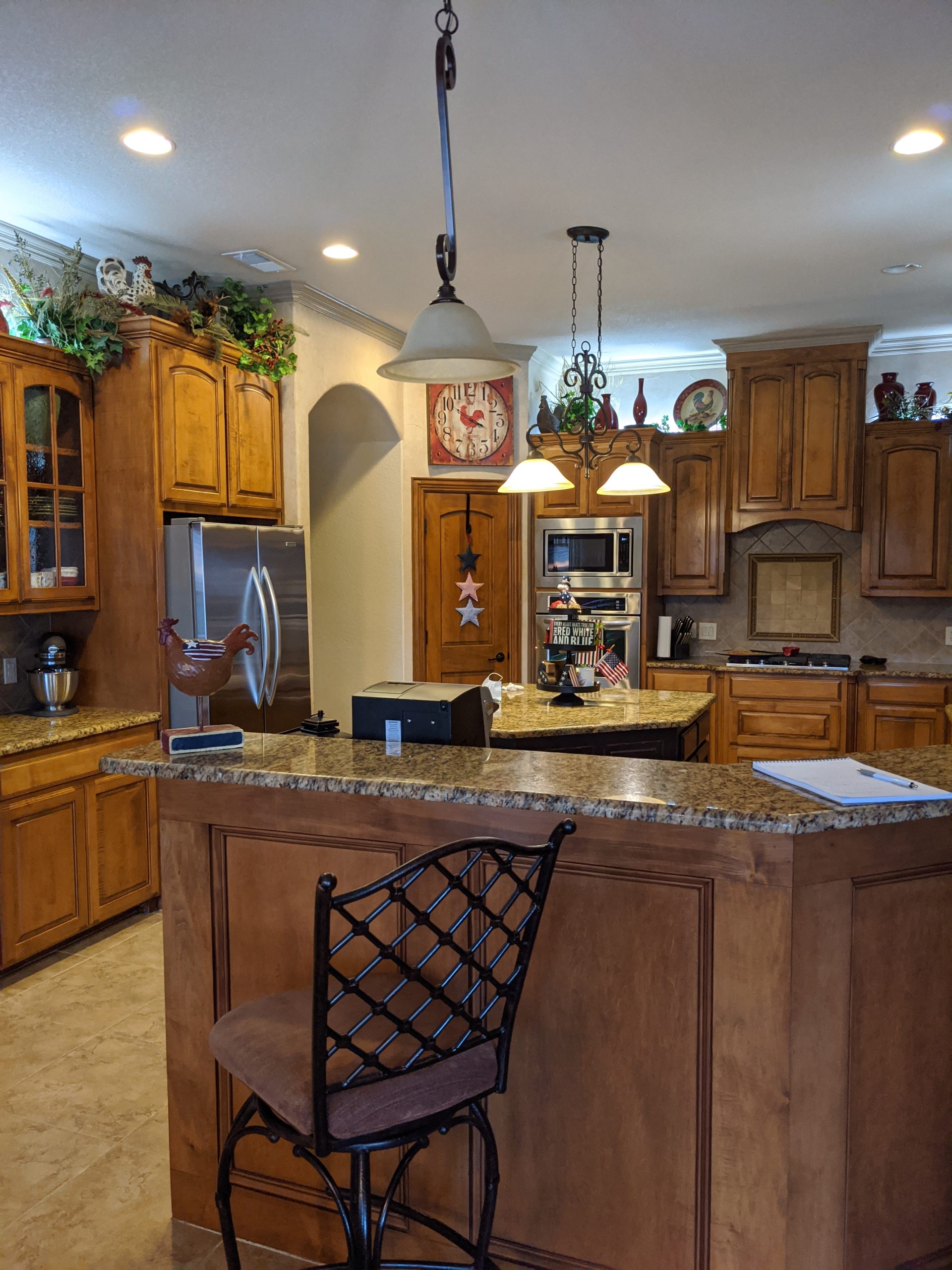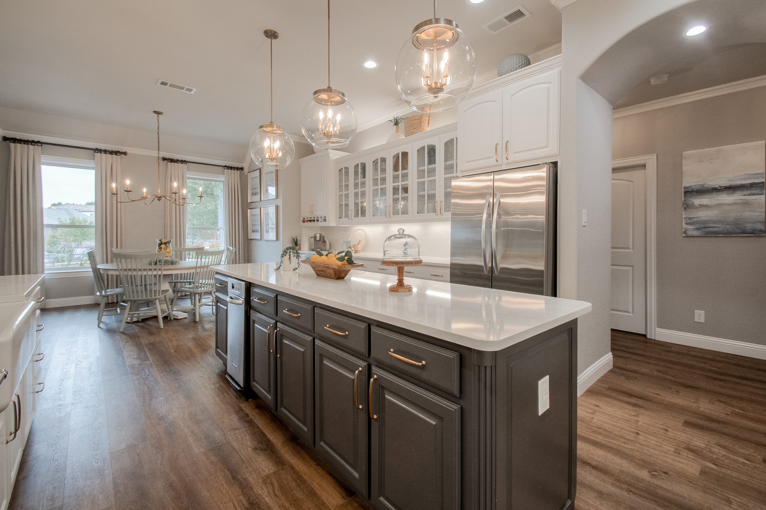 This kitchen began as dark, Tuscan-styled space, closed off from the family room. We kept the existing perimeter cabinets and painted them, and knocked down the wall between family room and kitchen to open it all up. We designed custom double islands, and installed a custom pantry door and vent hood. All materials were updated to bring in more light and make the space more functional for hosting large gatherings.