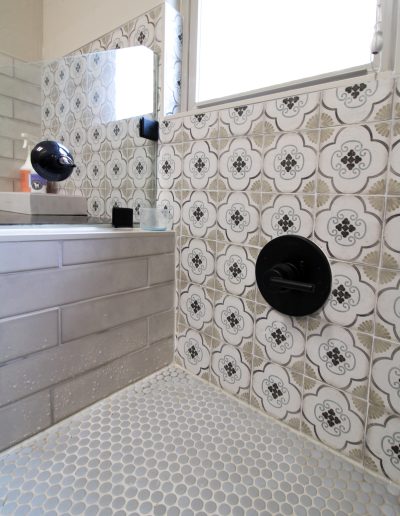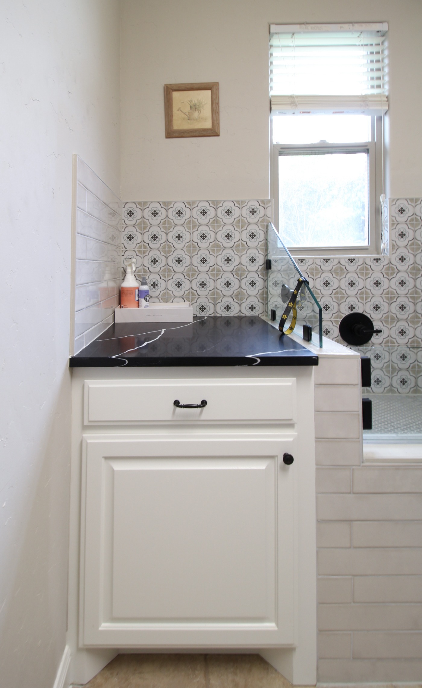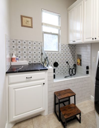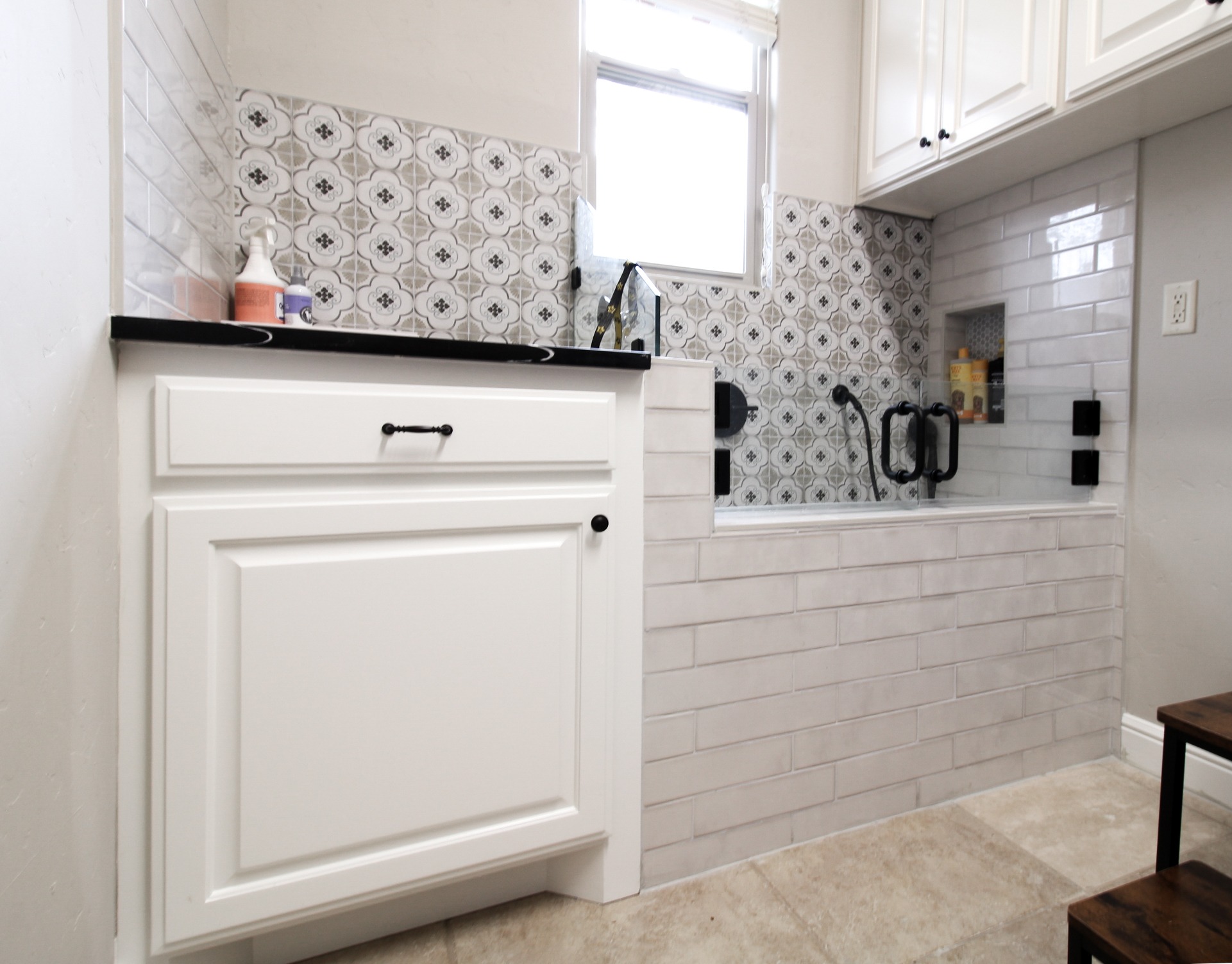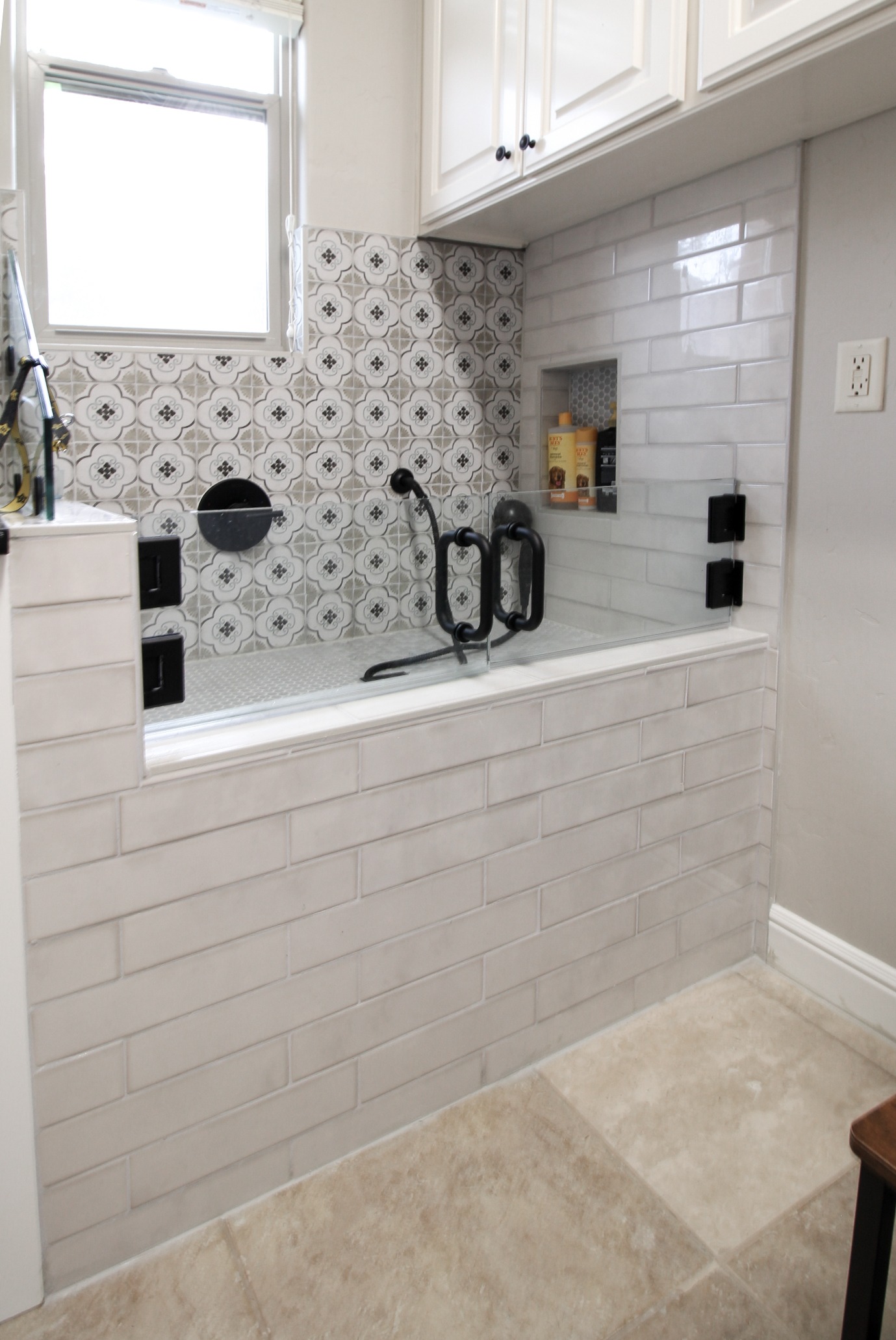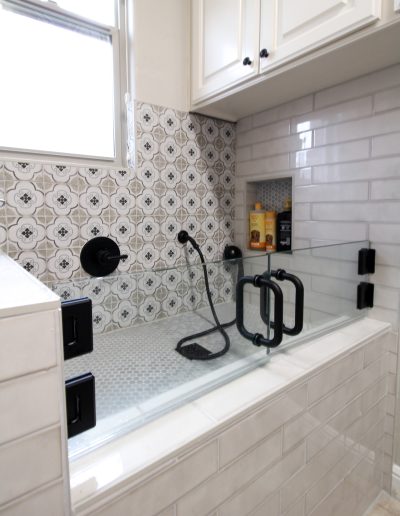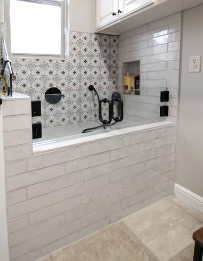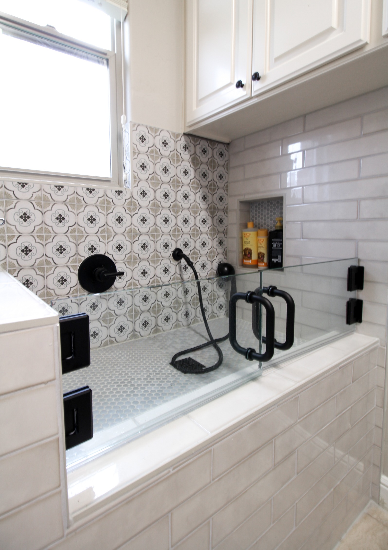 Our client Oreo (see below) needed a place to shower, and we were able to give him a functional and beautiful space. We transformed this laundry room prep space into a tiled dog shower and worked with our clients to customize it to best fit their needs.