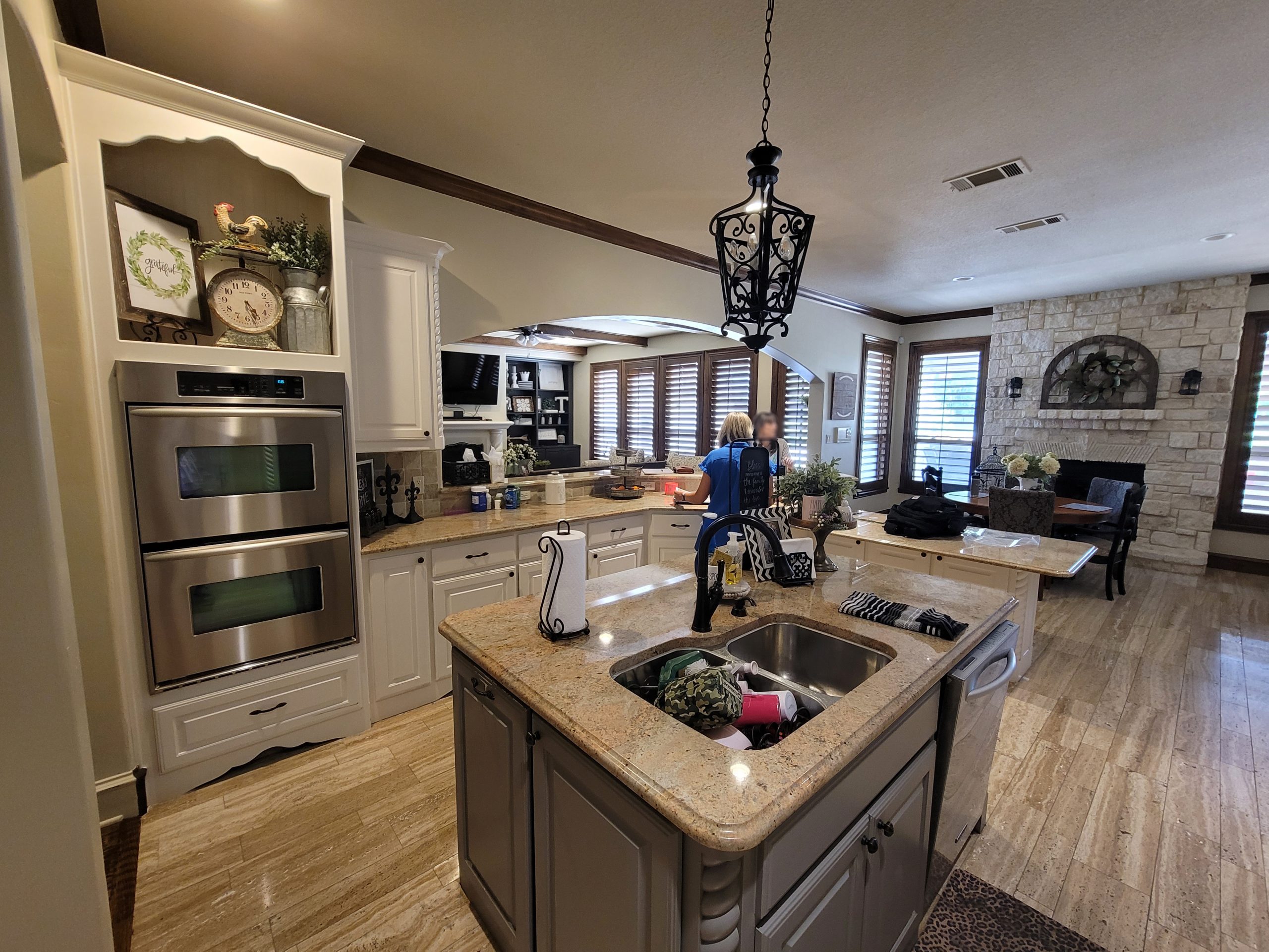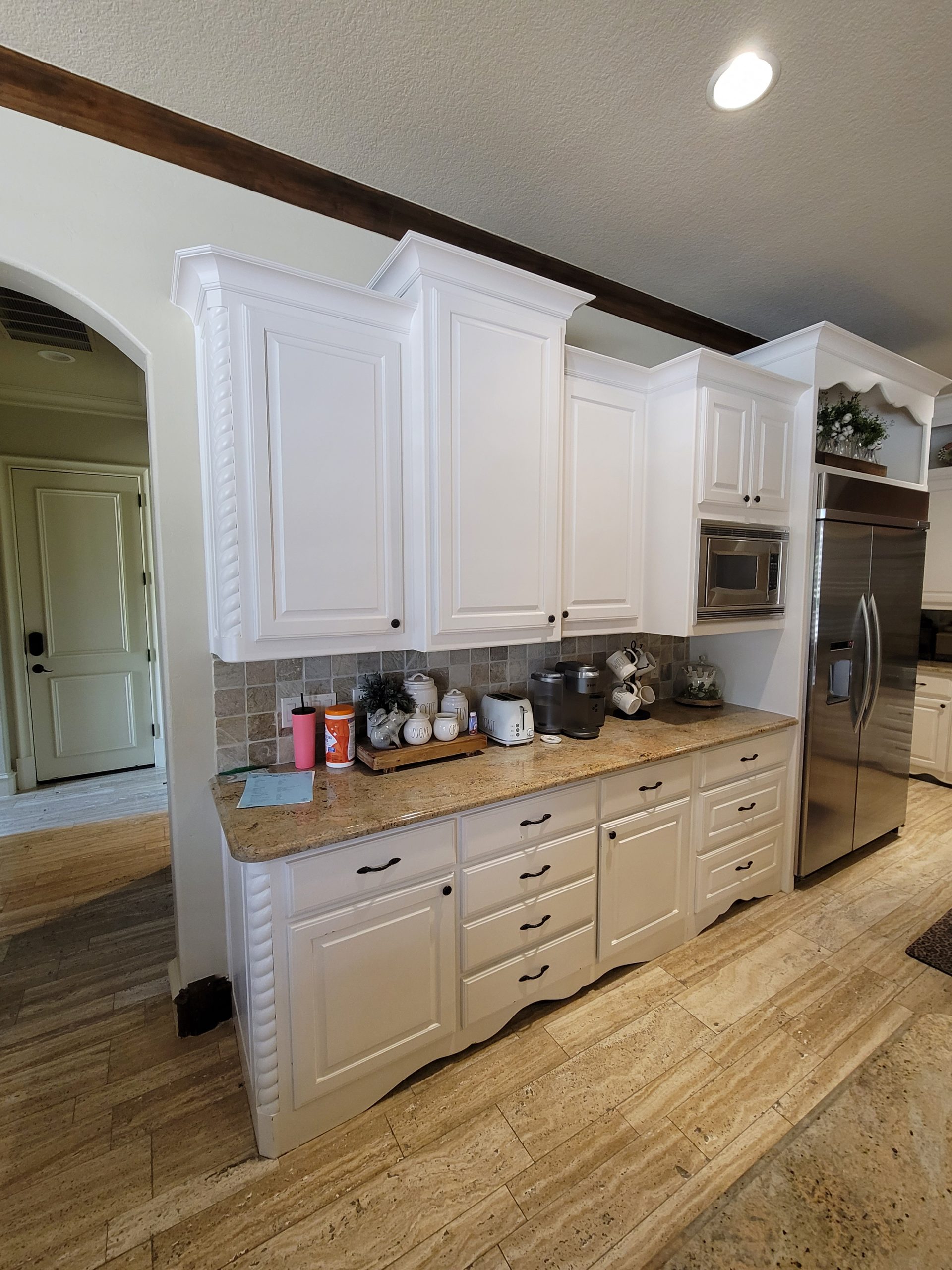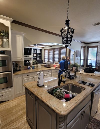 In this kitchen in Colleyville, we helped our clients modernize their elegant kitchen. To open up the kitchen to the living room, we took a few feet off of the peninsula and squared off the arch. Our client chose to keep their cabinet layout the same, but by removing the outdated decorative trim and replacing the doors and drawers, we were able to elevate their look.