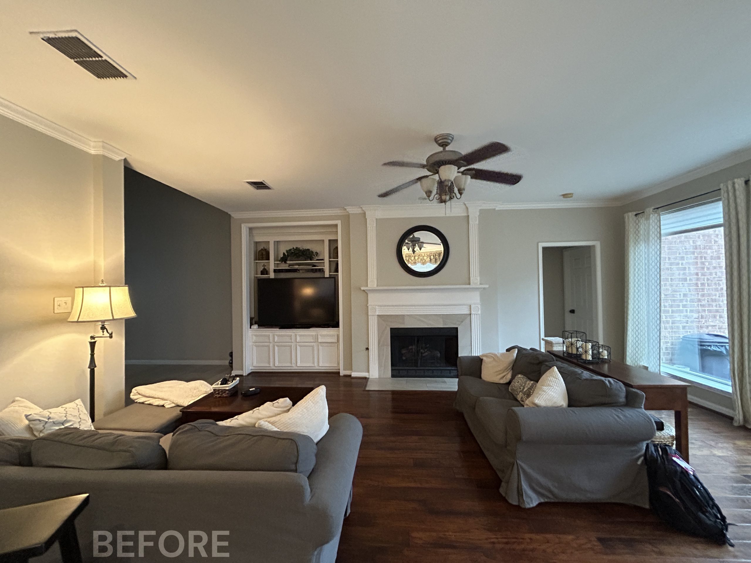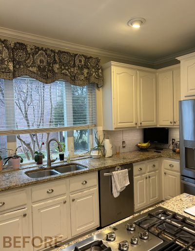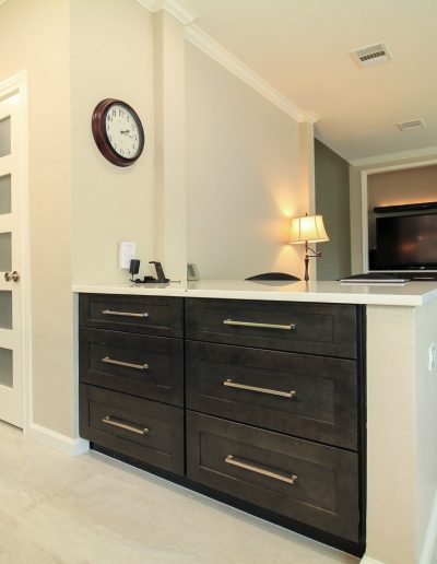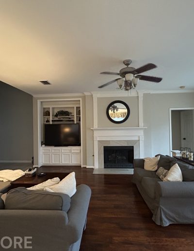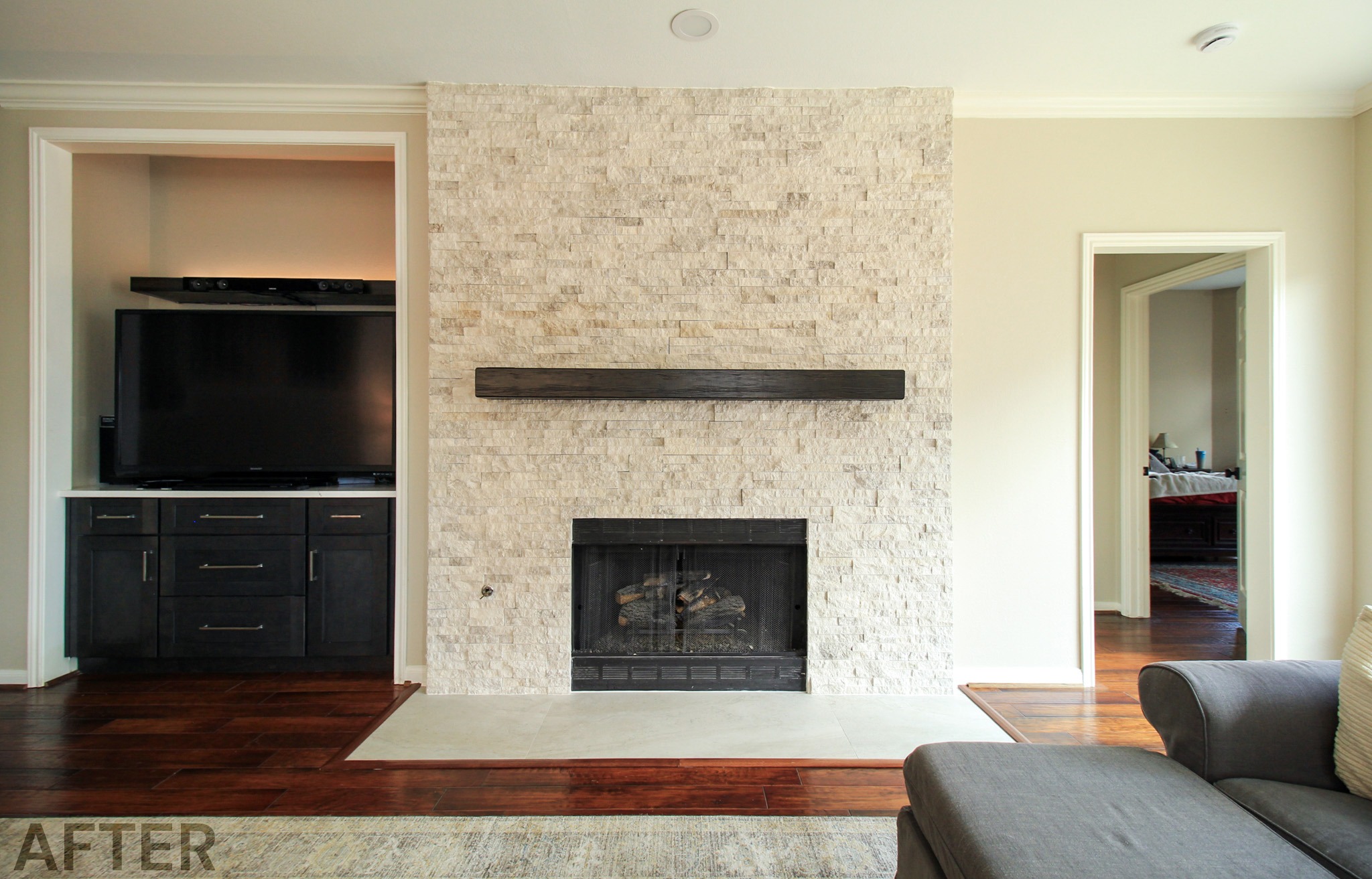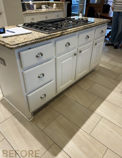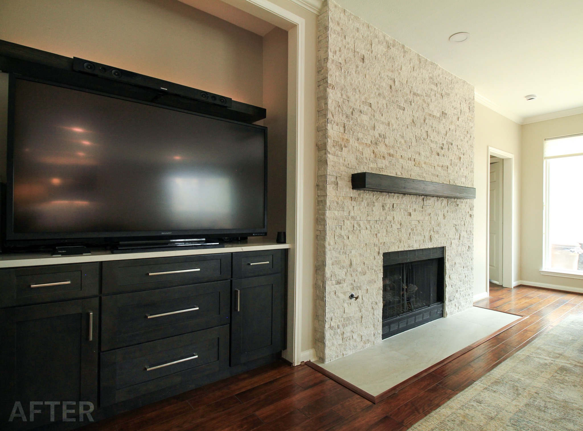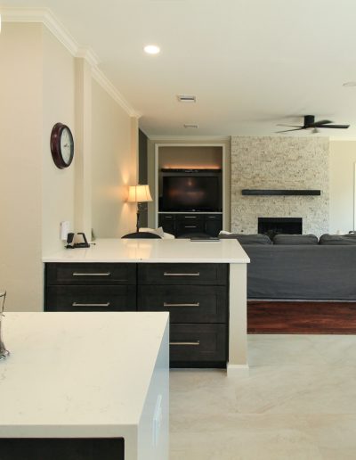 While we were replacing the cabinets in their kitchen, we also helped these clients update the media center and fireplace in the living room. The new fireplace stone and custom-stained mantel made a huge difference!