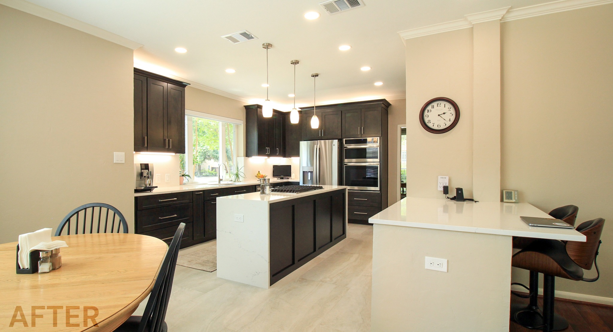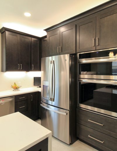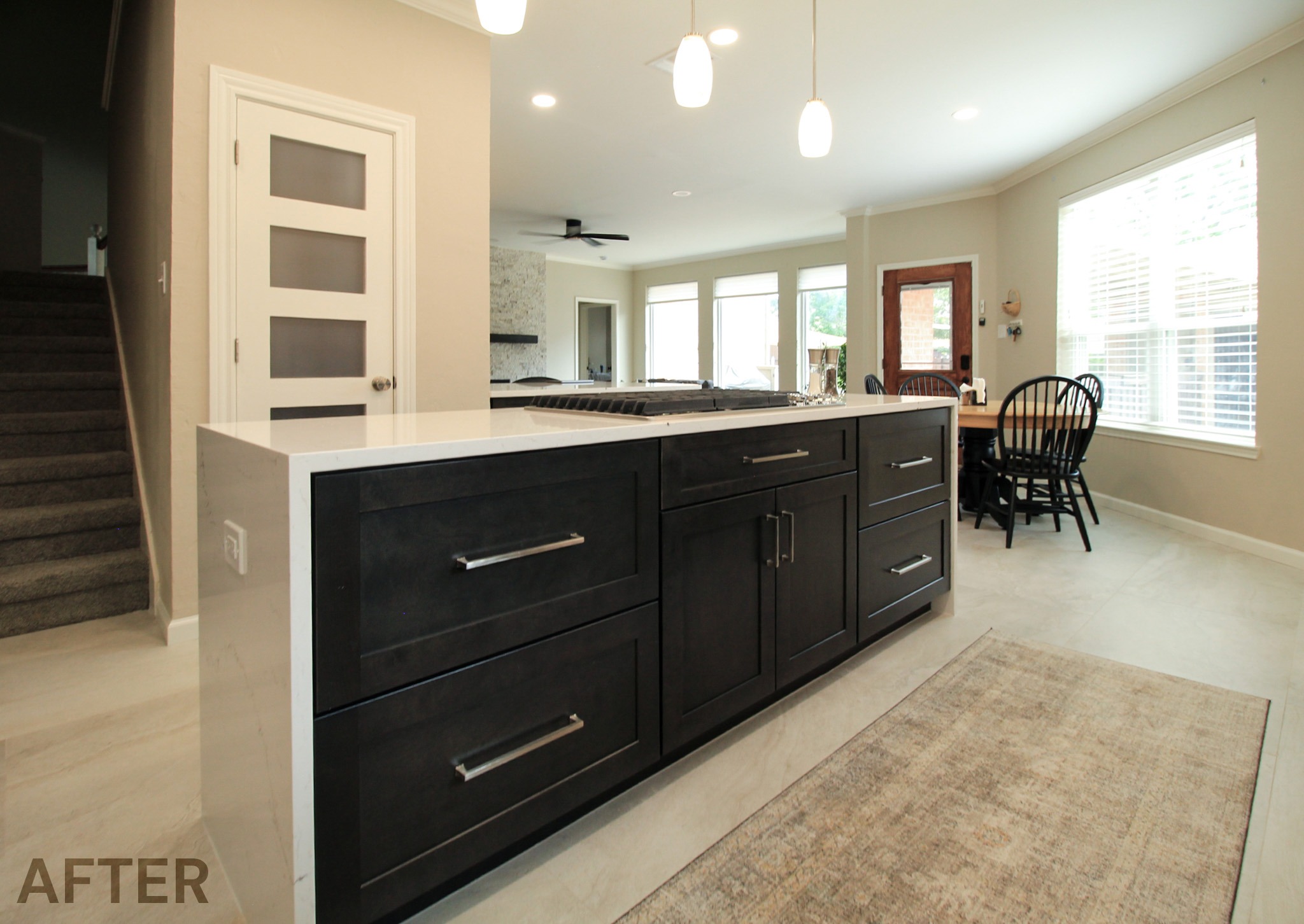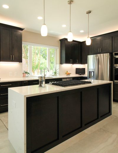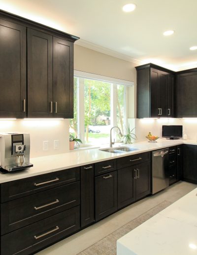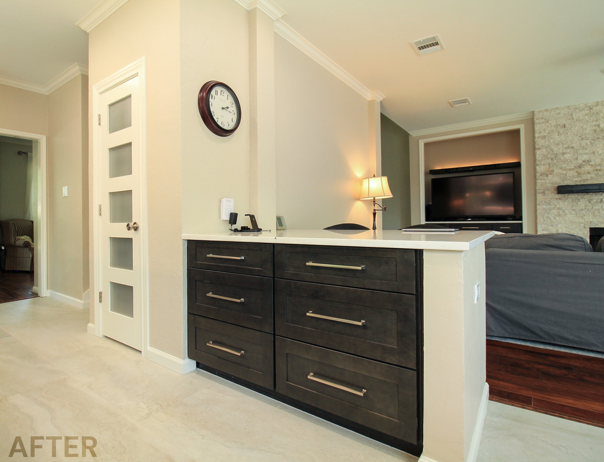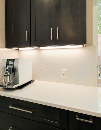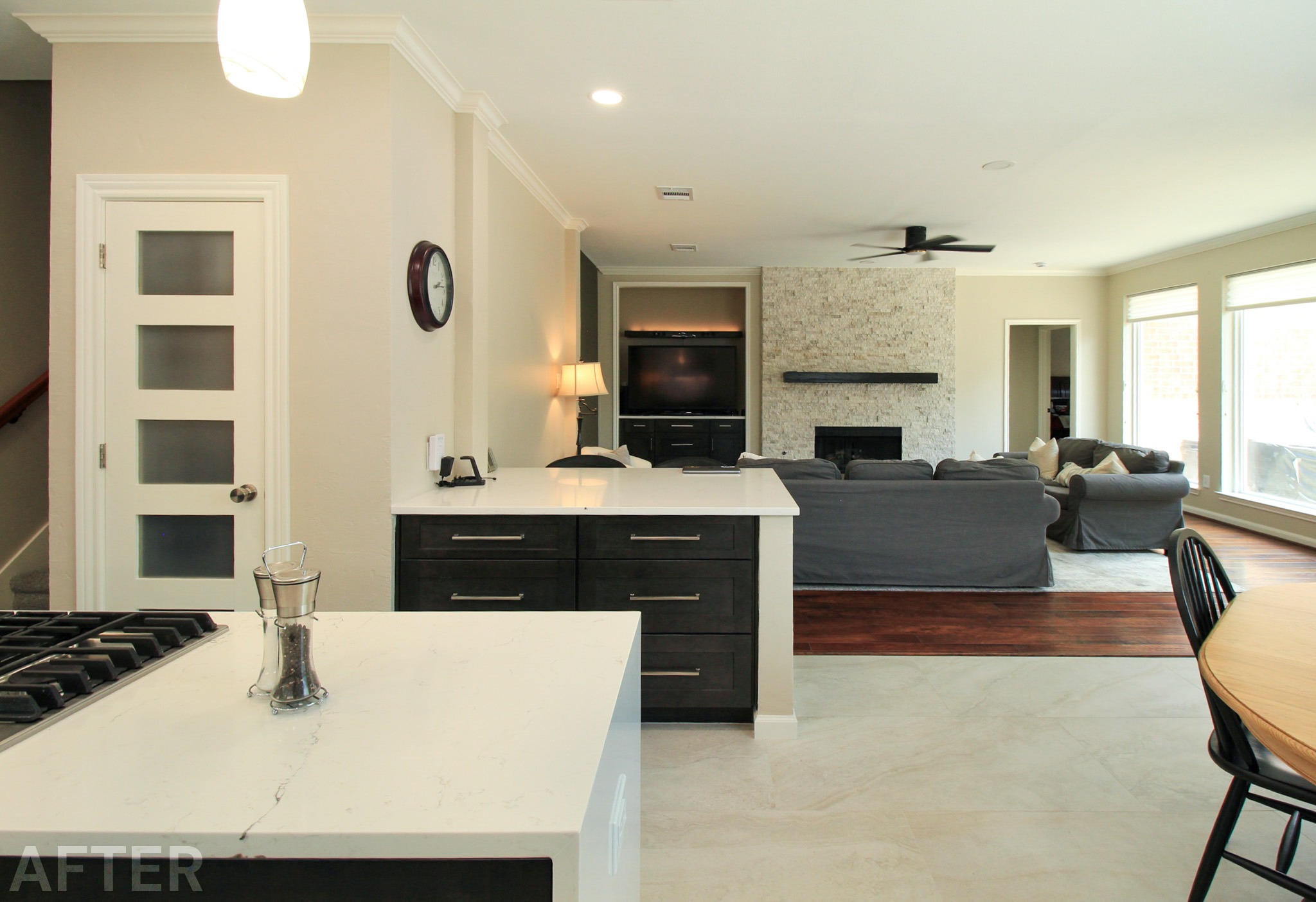 They had outgrown the white cabinets, so we helped them choose a ready-made cabinet with a darker stained look. The quartz backsplash and waterfall countertops give this kitchen a sleek, bright look. We installed large-format tile flooring, reconfigured the kitchen lighting, and cut down the bar between the kitchen and the living room to create a larger countertop space. We also replaced their basic pantry door with a door with frosted glass.