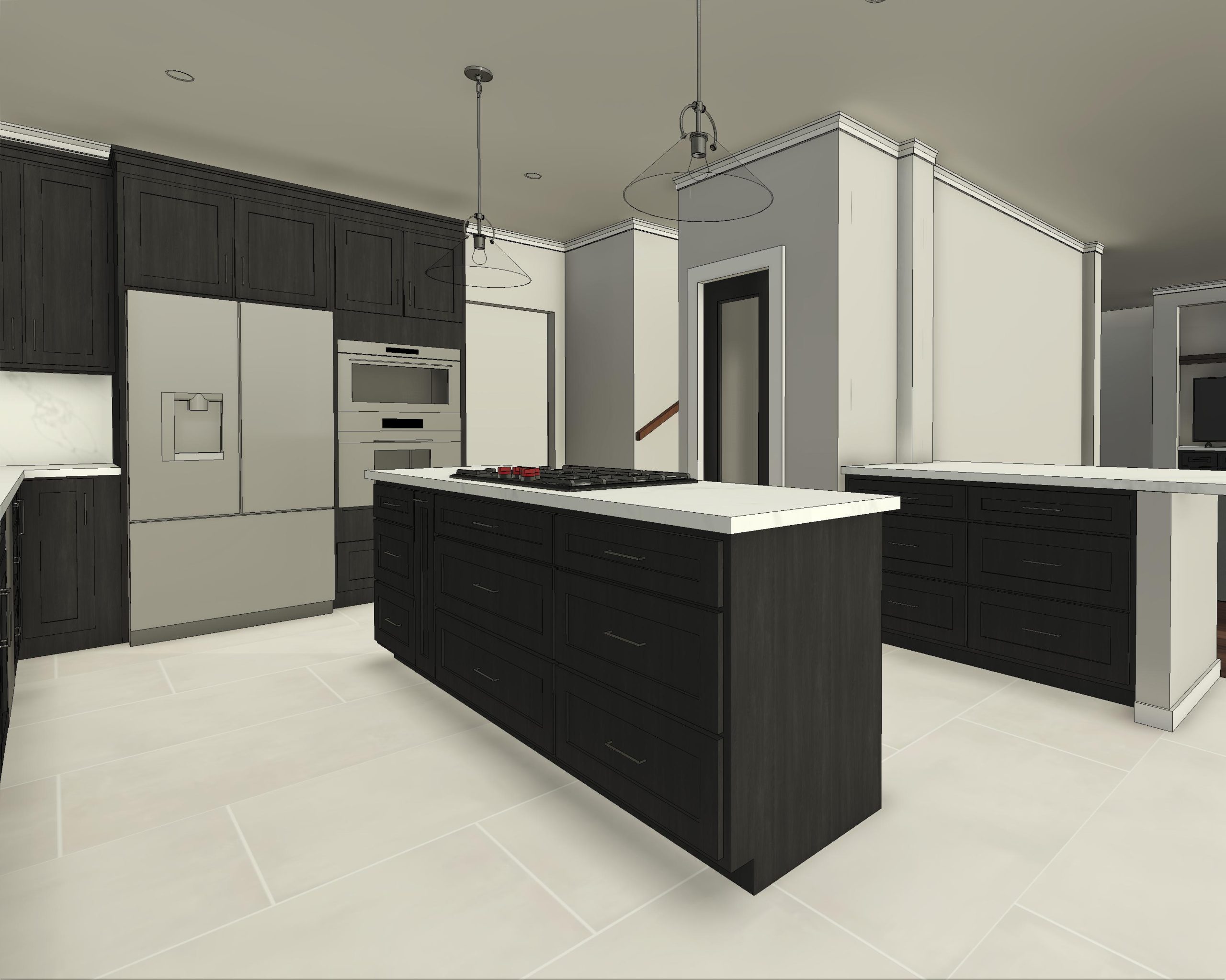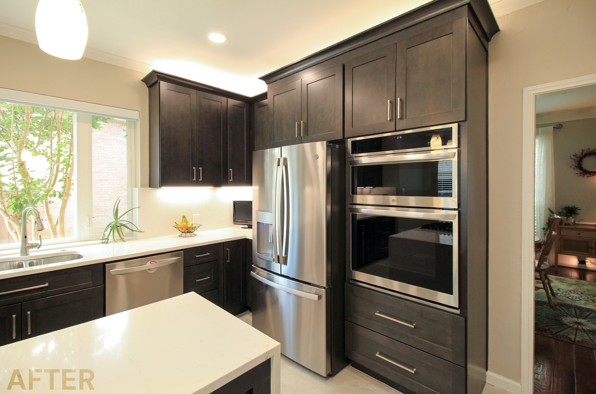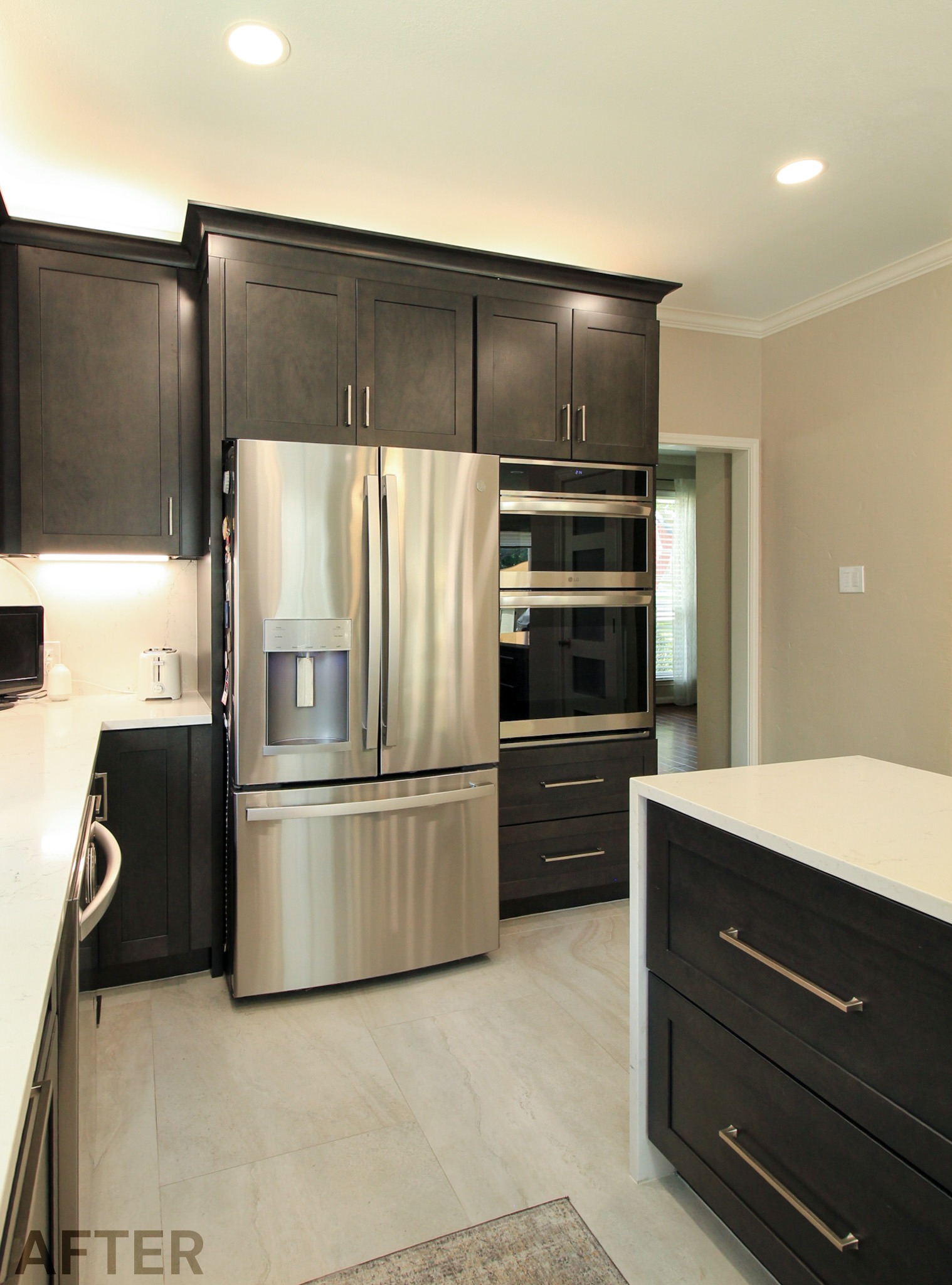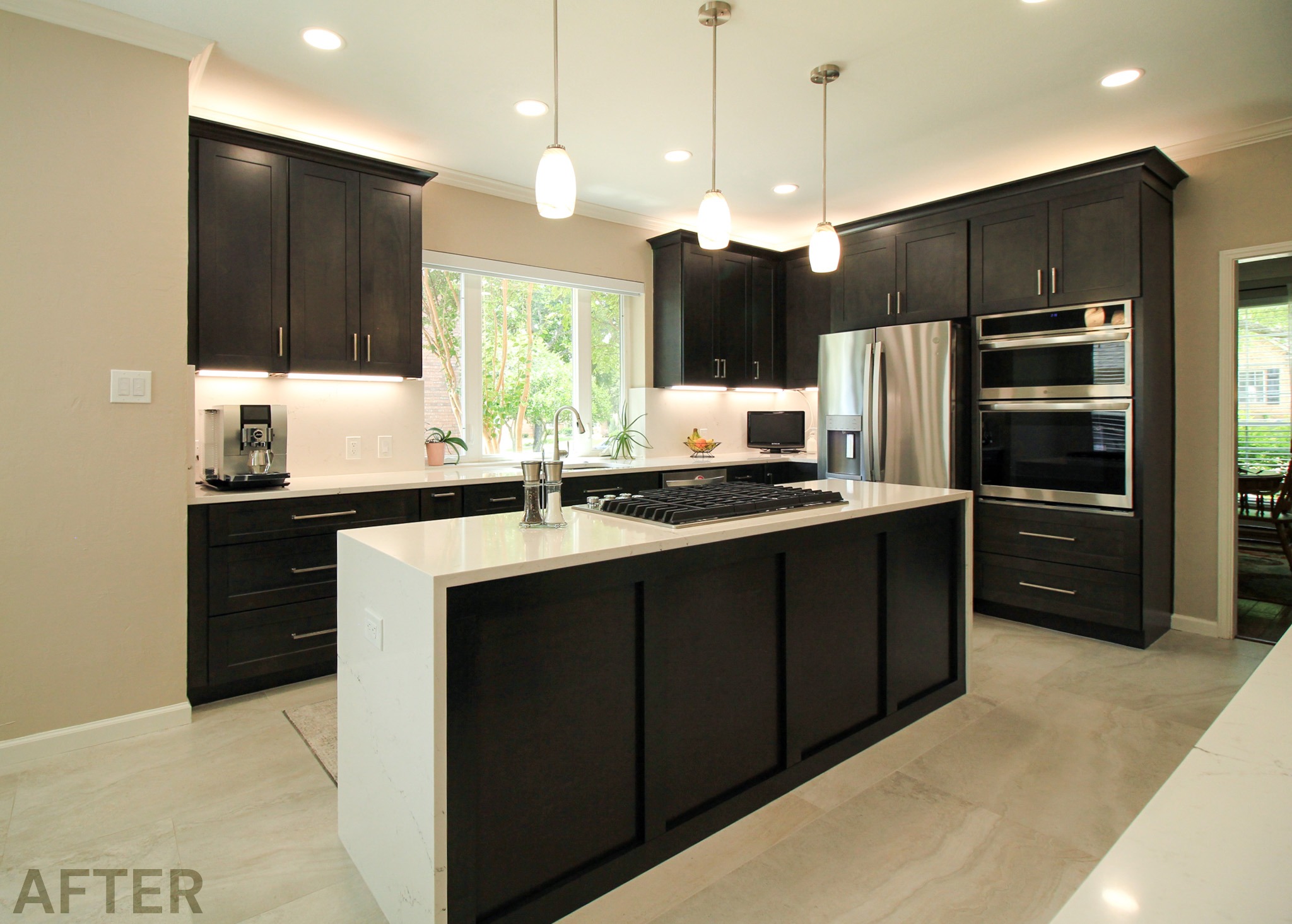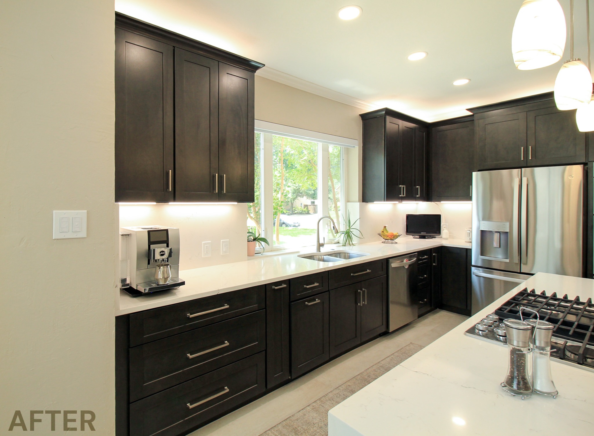 They had outgrown the white cabinets, so we helped them choose a ready-made cabinet with a darker stained look. The quartz backsplash and waterfall countertops give this kitchen a sleek, bright look. We installed large-format tile flooring, reconfigured the kitchen lighting, and cut down the bar between the kitchen and the living room to create a larger countertop space. We also replaced their basic pantry door with a door with frosted glass.