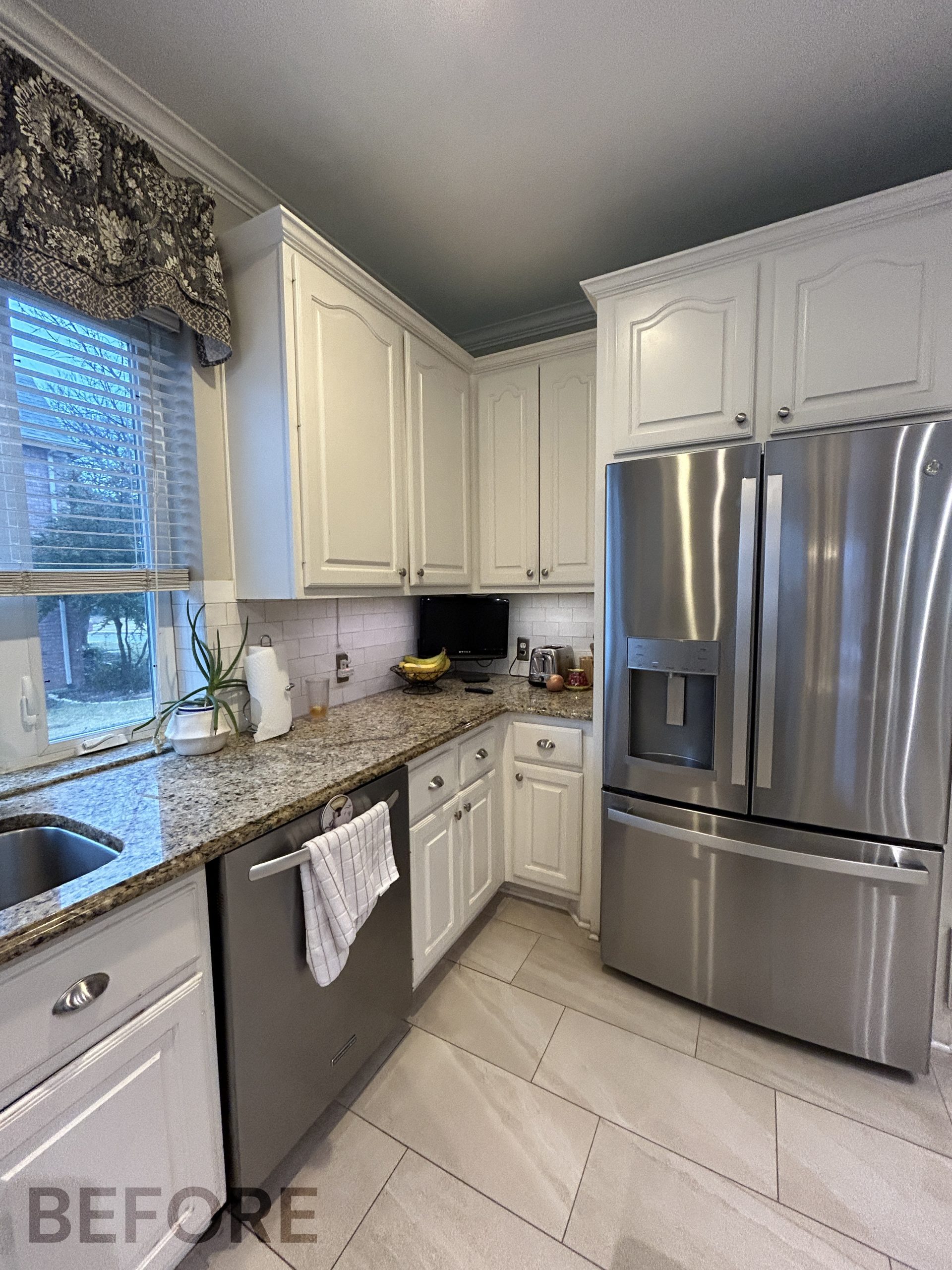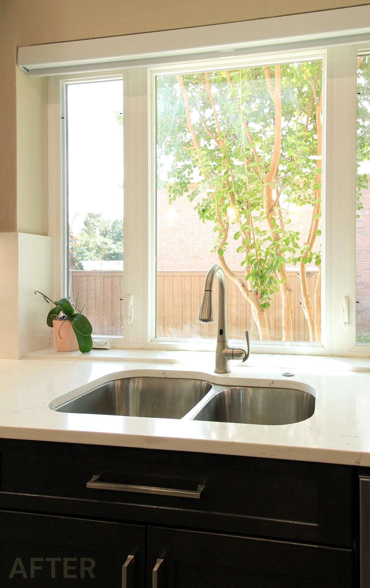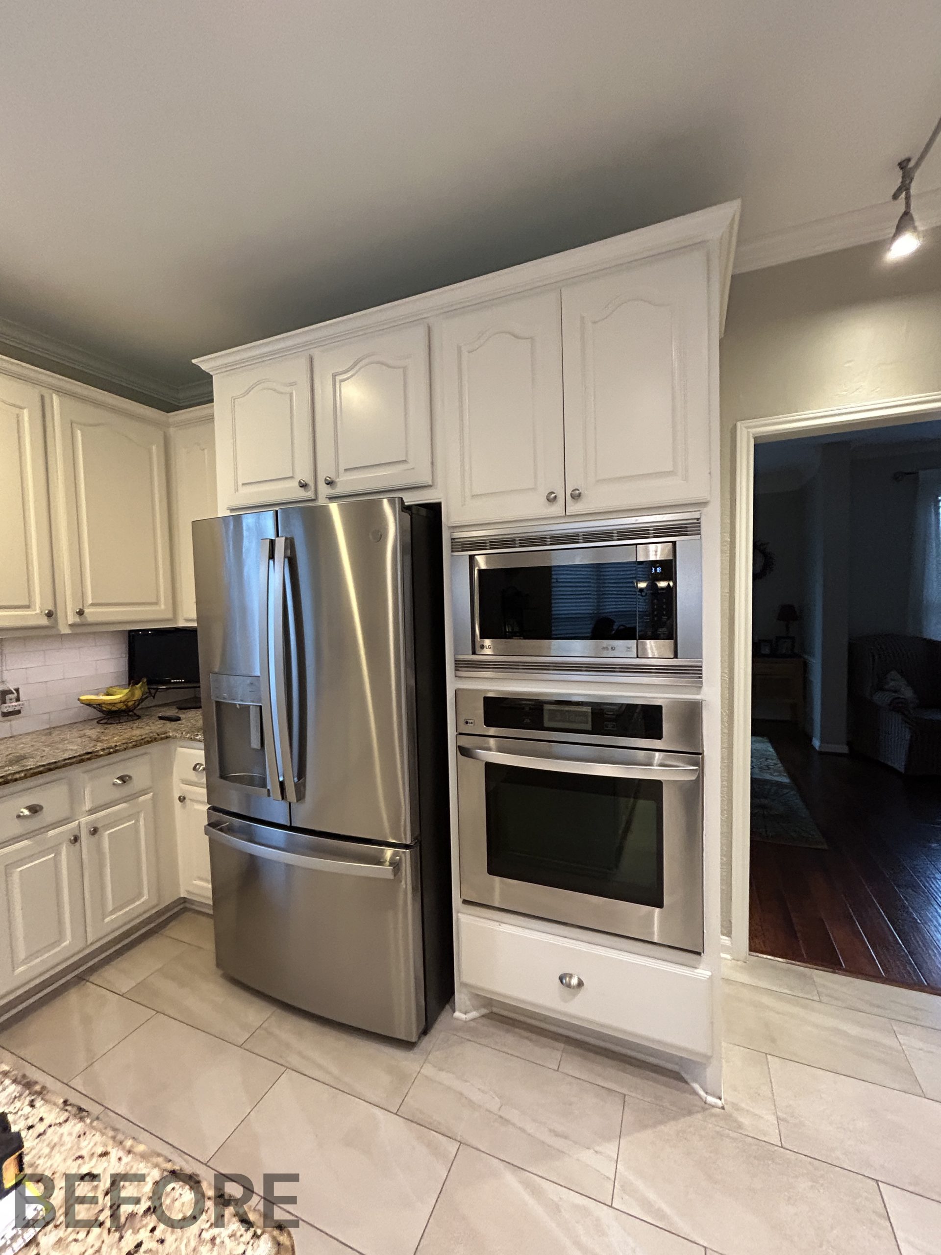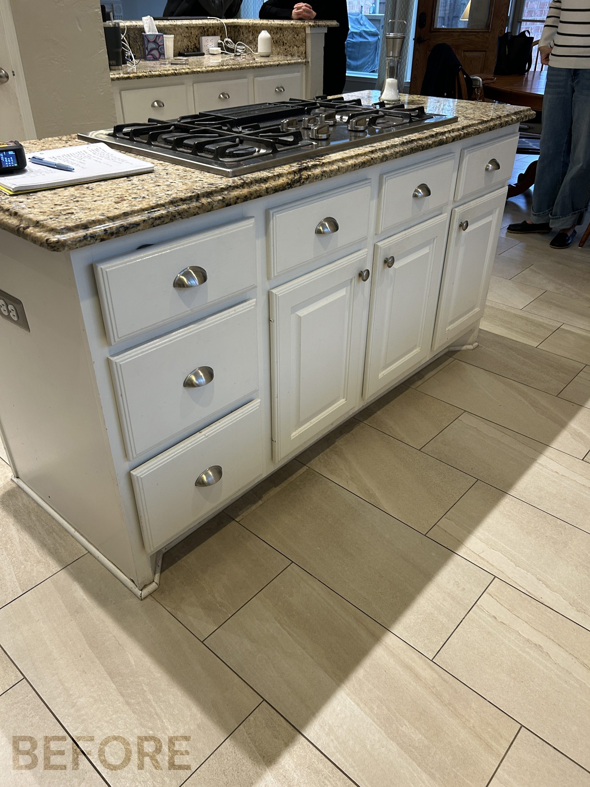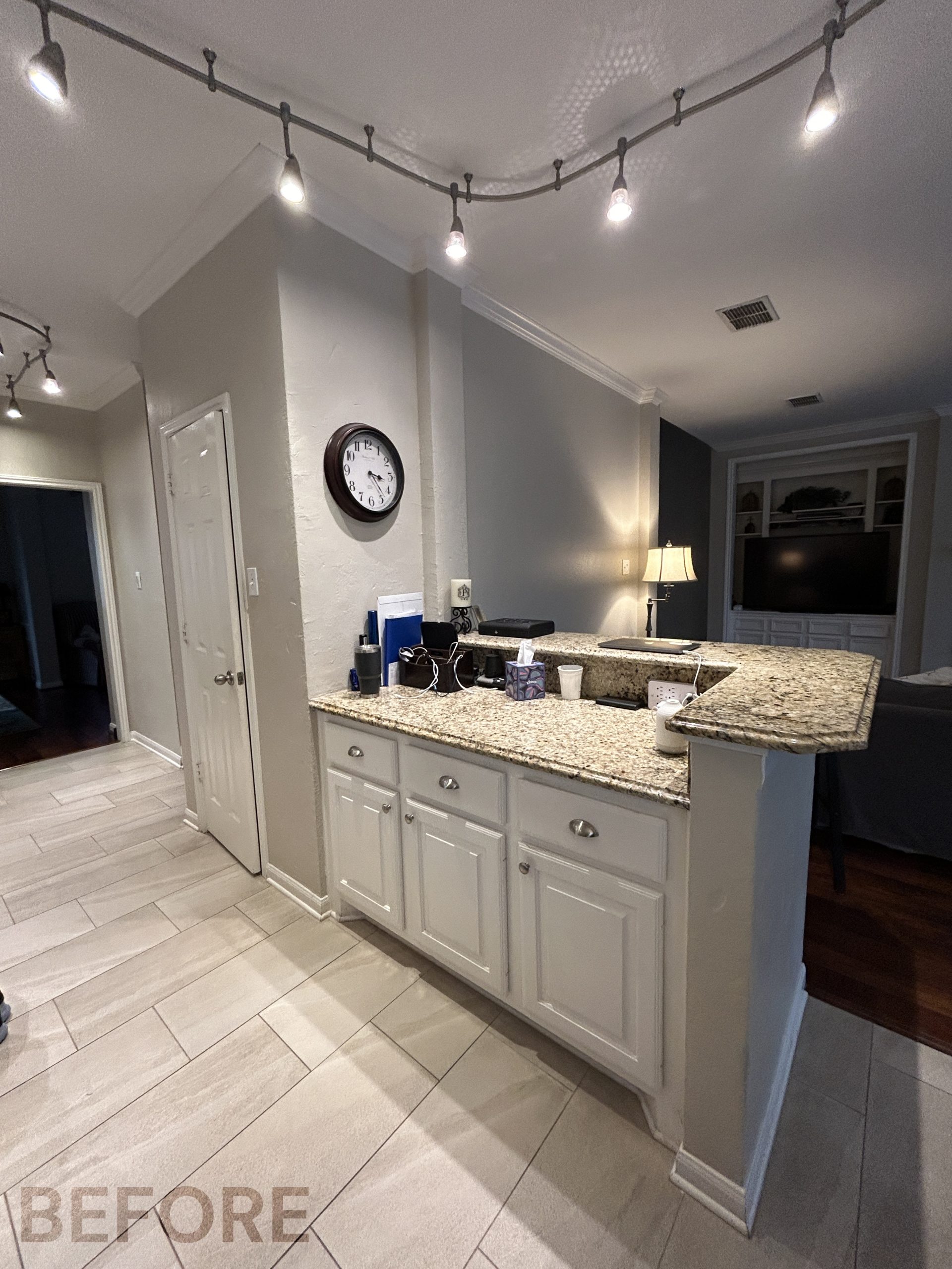 They had outgrown the white cabinets, so we helped them choose a ready-made cabinet with a darker stained look. The quartz backsplash and waterfall countertops give this kitchen a sleek, bright look. We installed large-format tile flooring, reconfigured the kitchen lighting, and cut down the bar between the kitchen and the living room to create a larger countertop space. We also replaced their basic pantry door with a door with frosted glass.