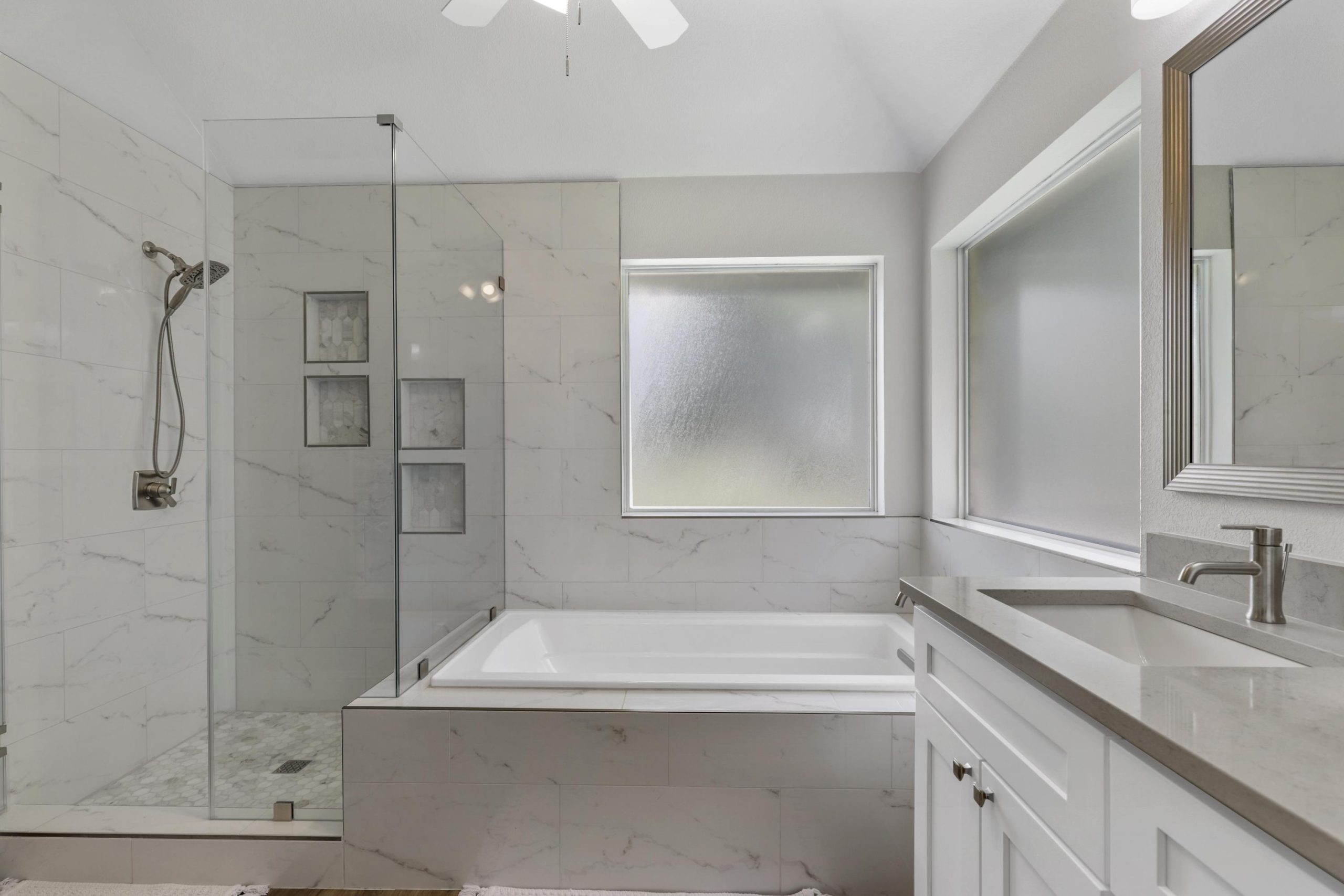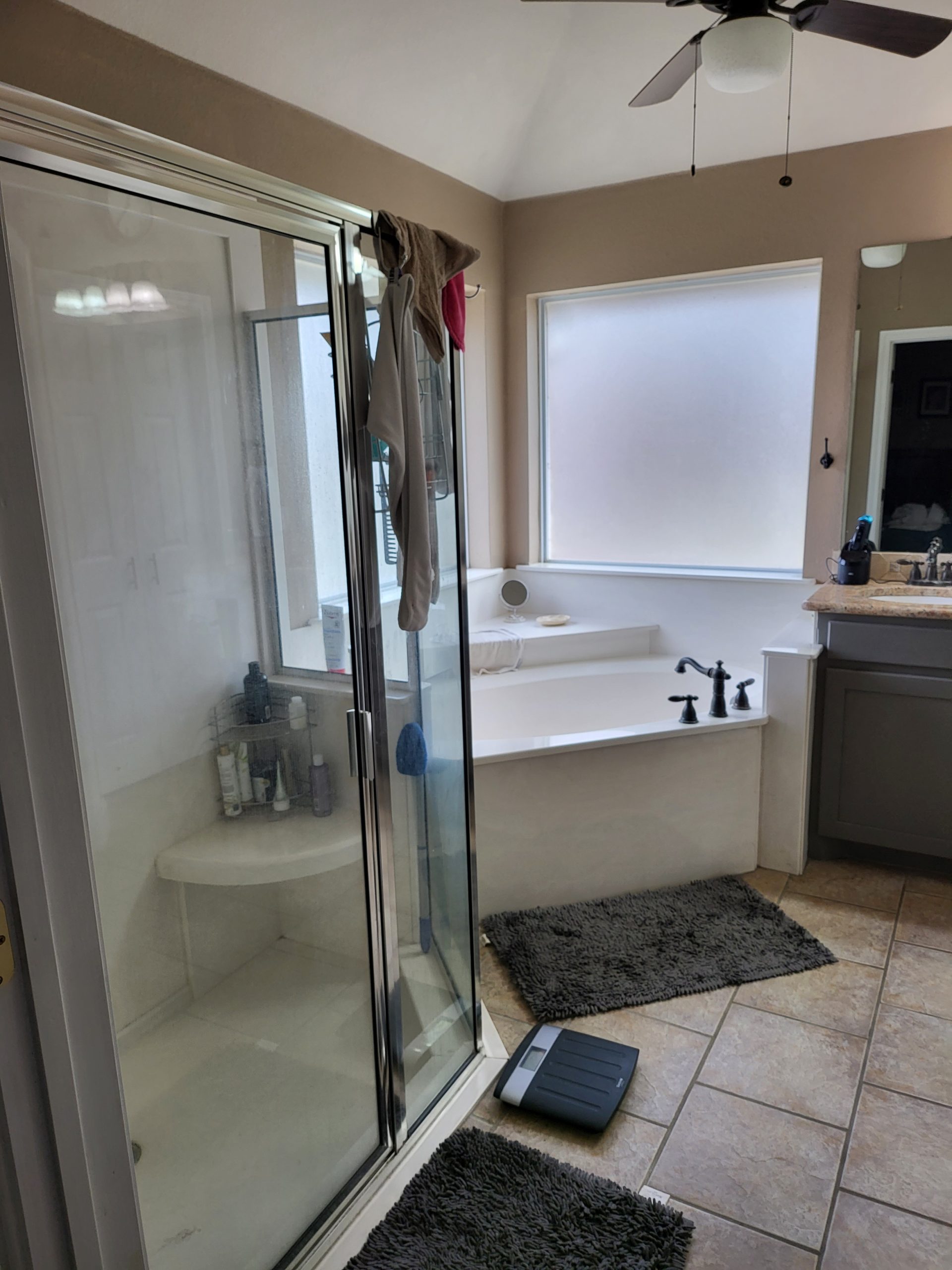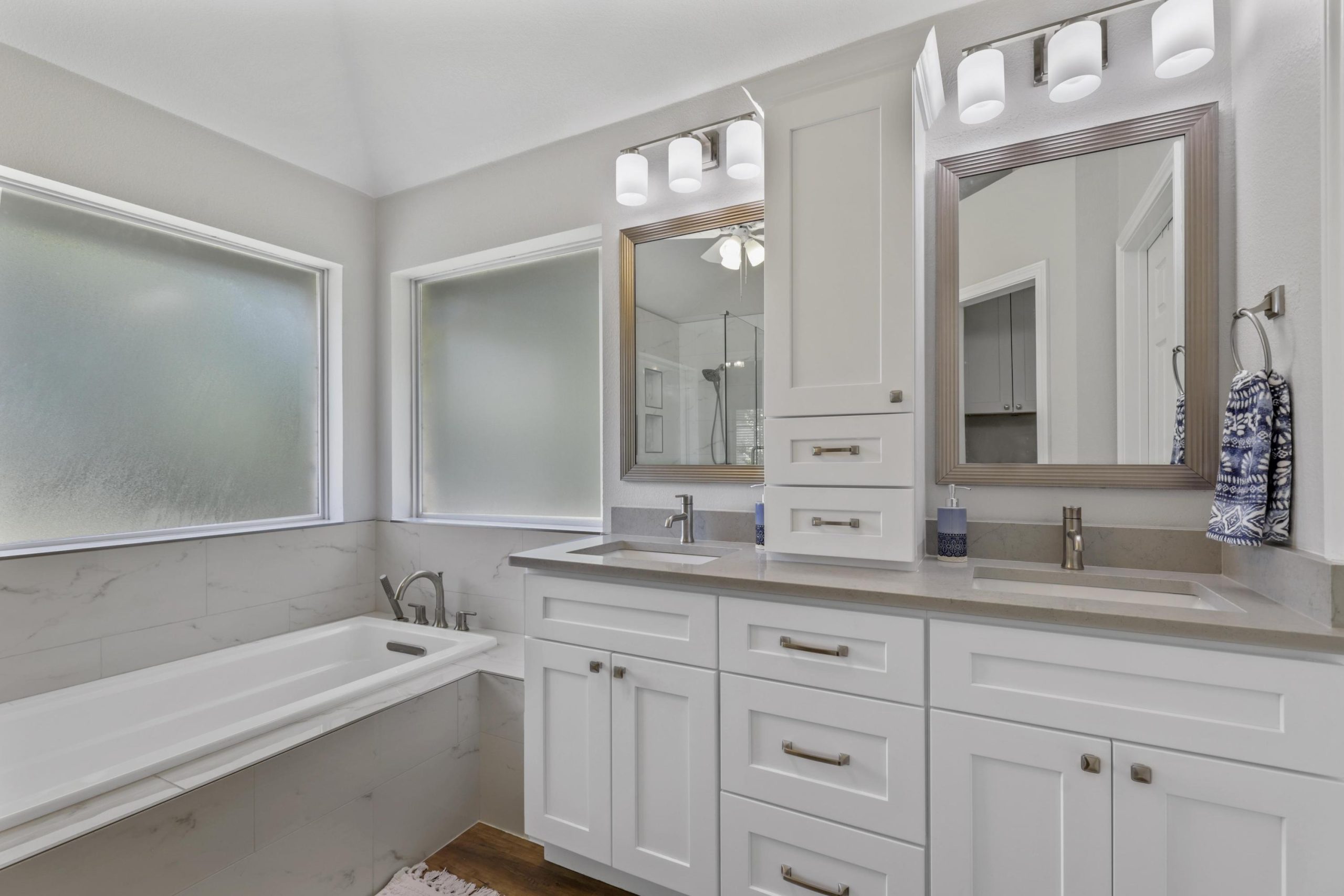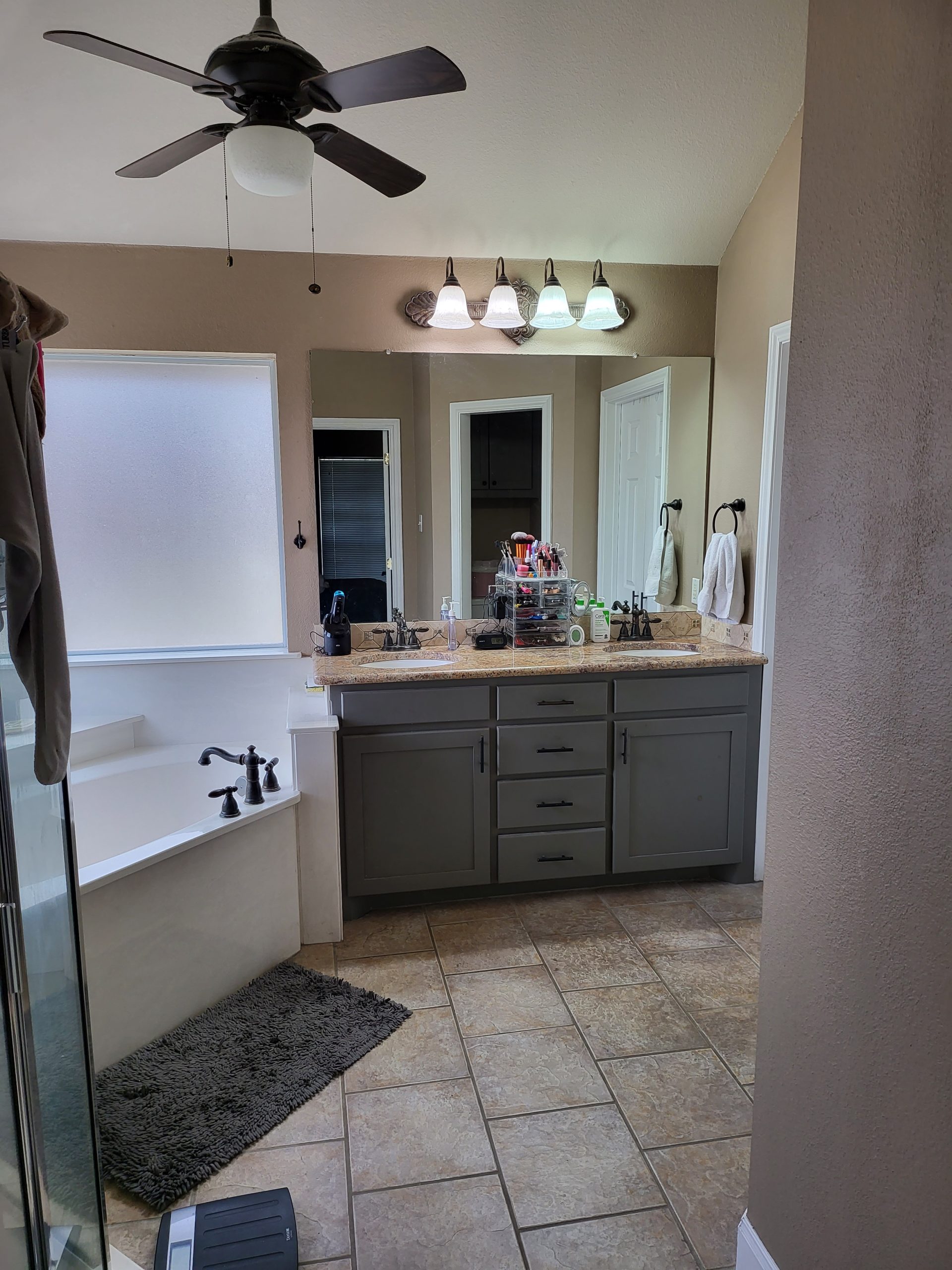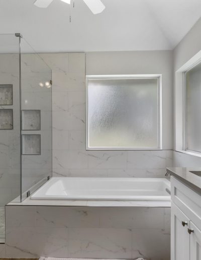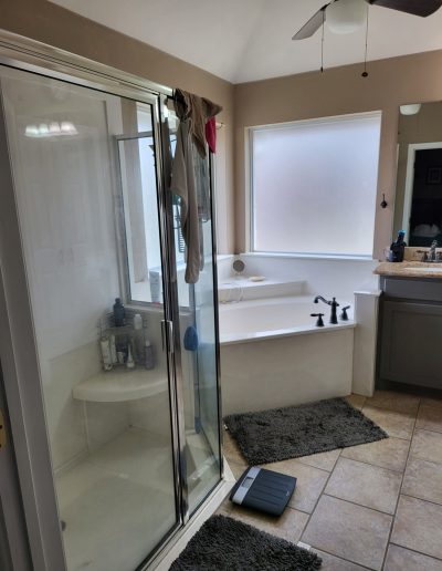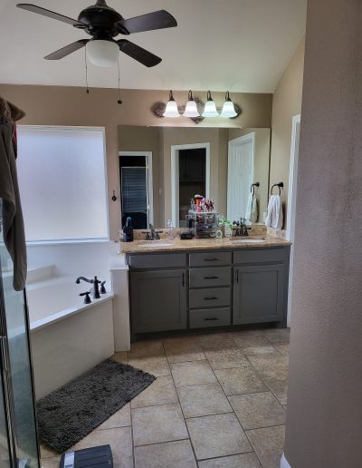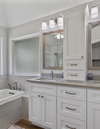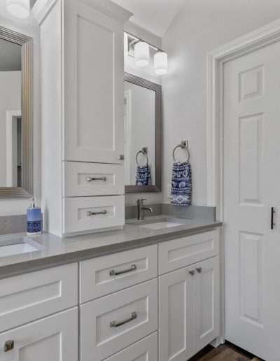 This client’s house desperately needed an upgrade, especially in this master bathroom. Home Front put together a design using high-quality ready made cabinets to reduce costs, a custom shower, custom dining room shelves, and flooring and paint throughout the house. We did additional work in 3 secondary bathrooms. Nearly every surface in the home was touched during this 8-week project.