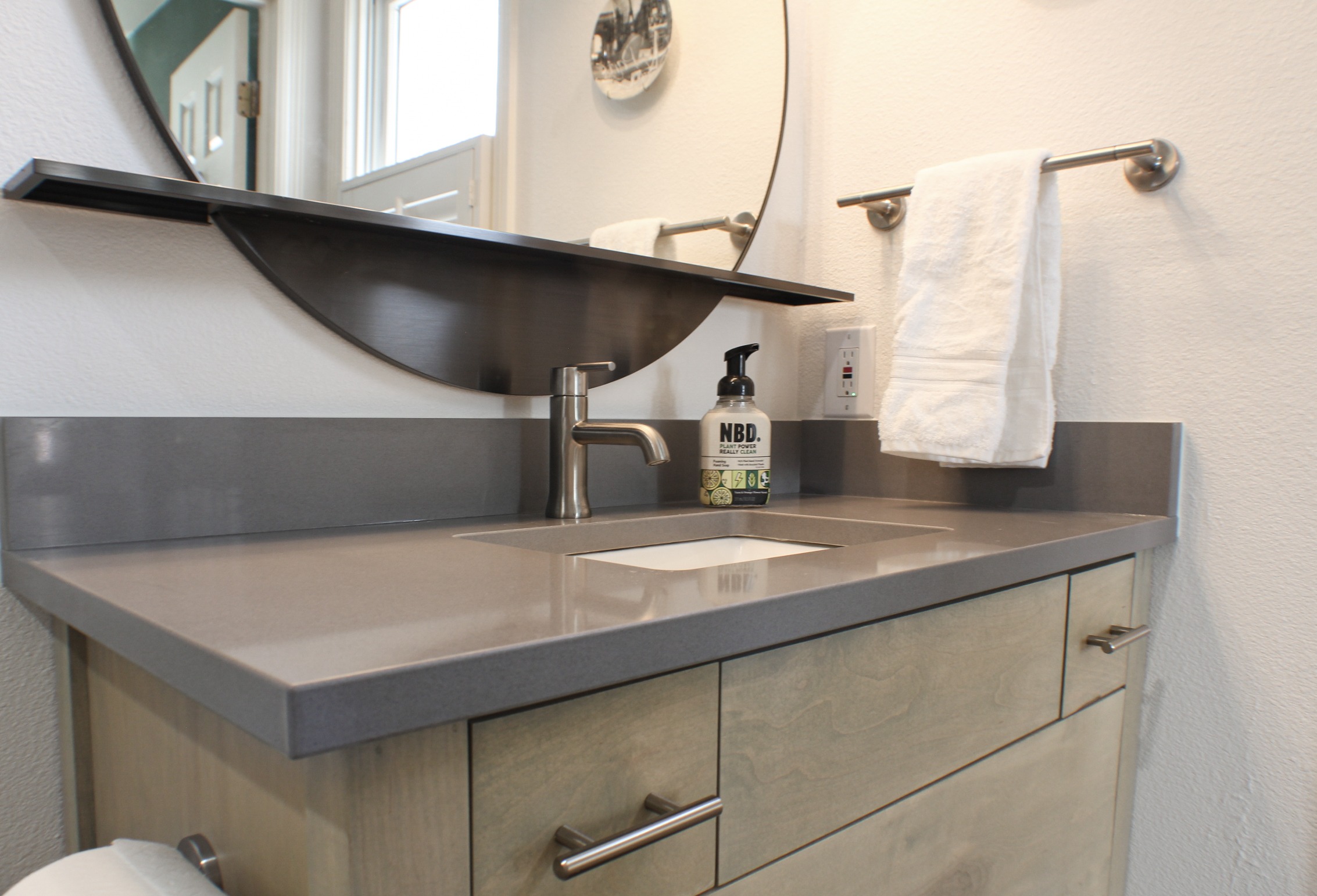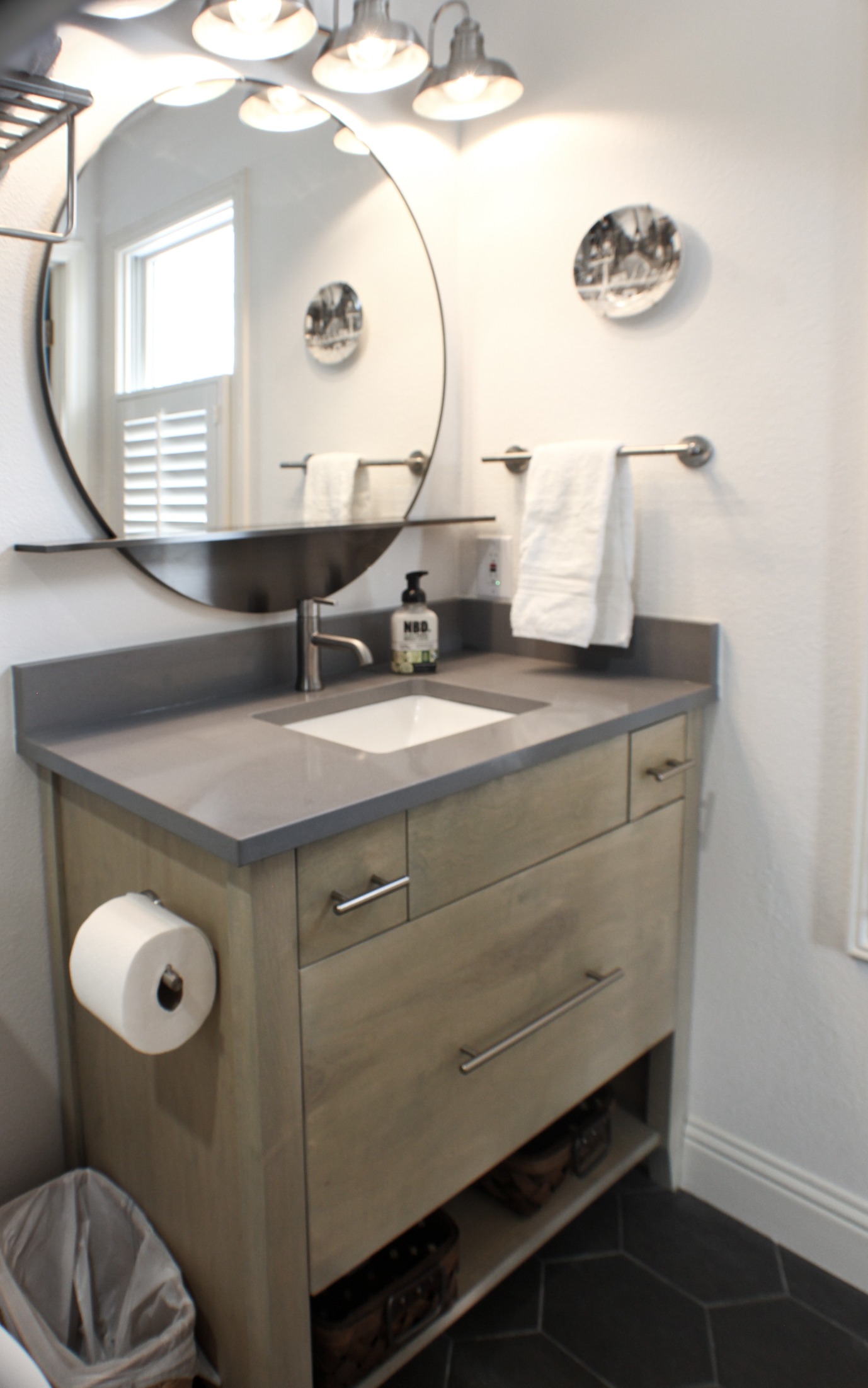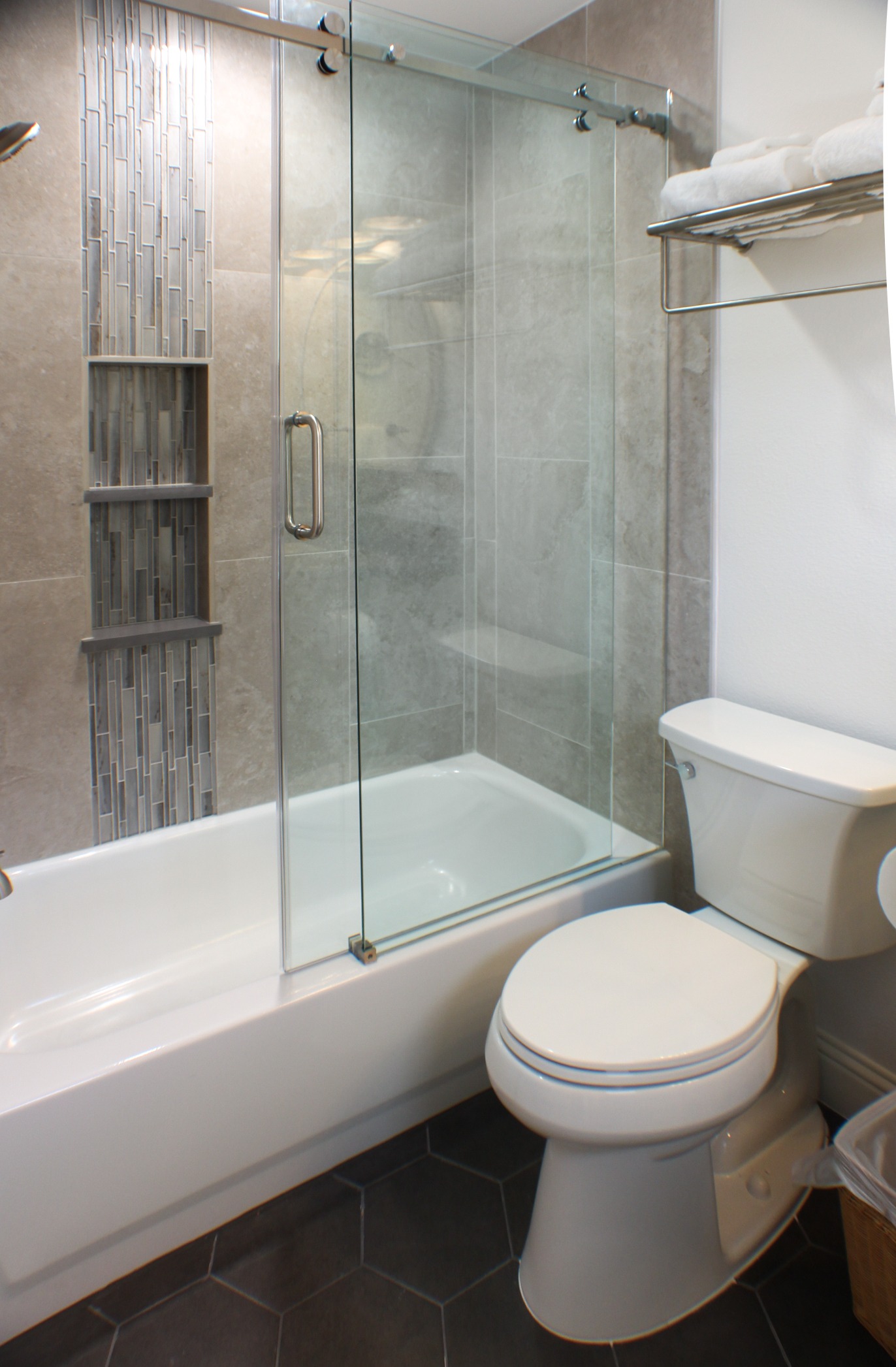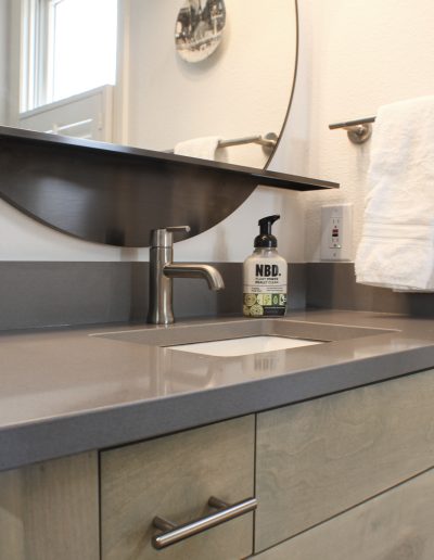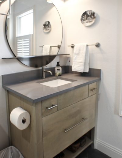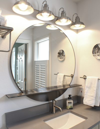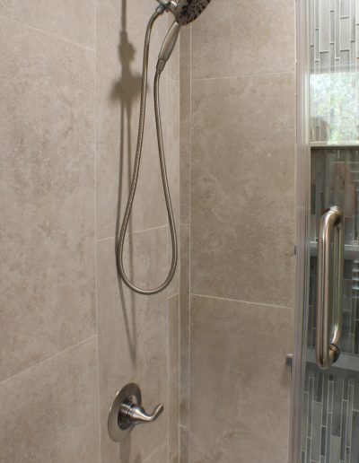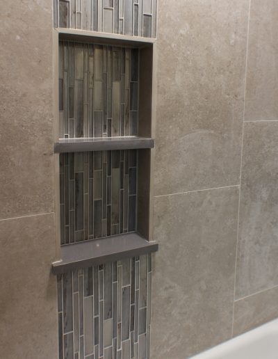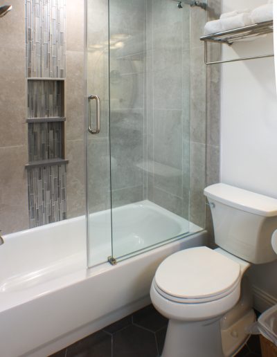Our clients have a charming home in Fort Worth, but the bathrooms were outdated compared to the rest of the house. They trusted Home Front to renovate two of their upstairs bathrooms. In this masculine bathroom, we replaced the tile in the alcove tub and added quartz shampoo shelves. We also added a glass barn-style sliding door, and our custom cabinet builder made this custom vanity to be stained.