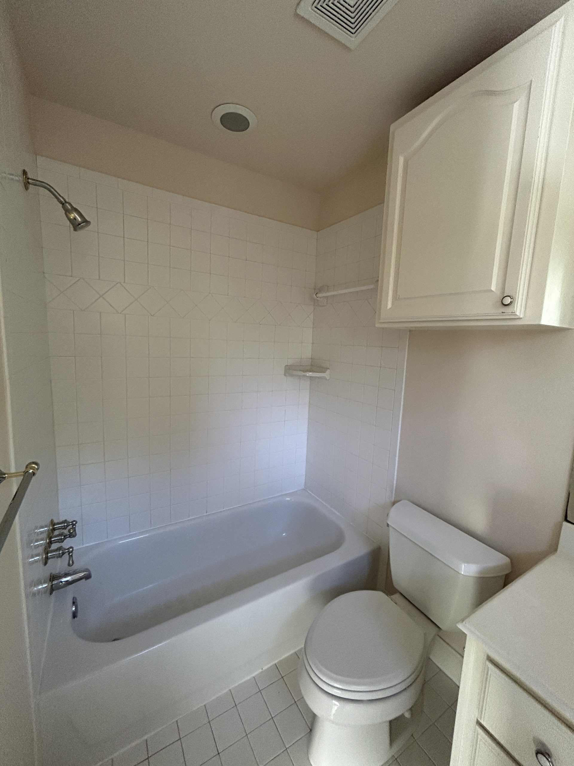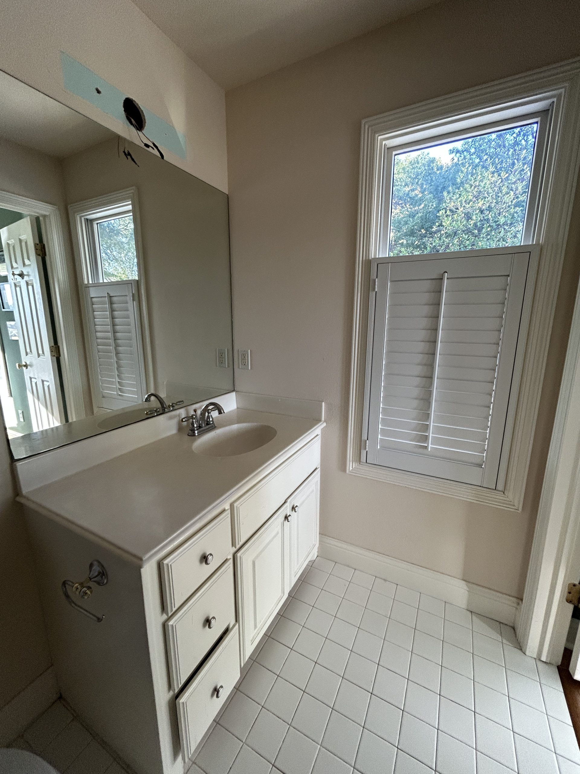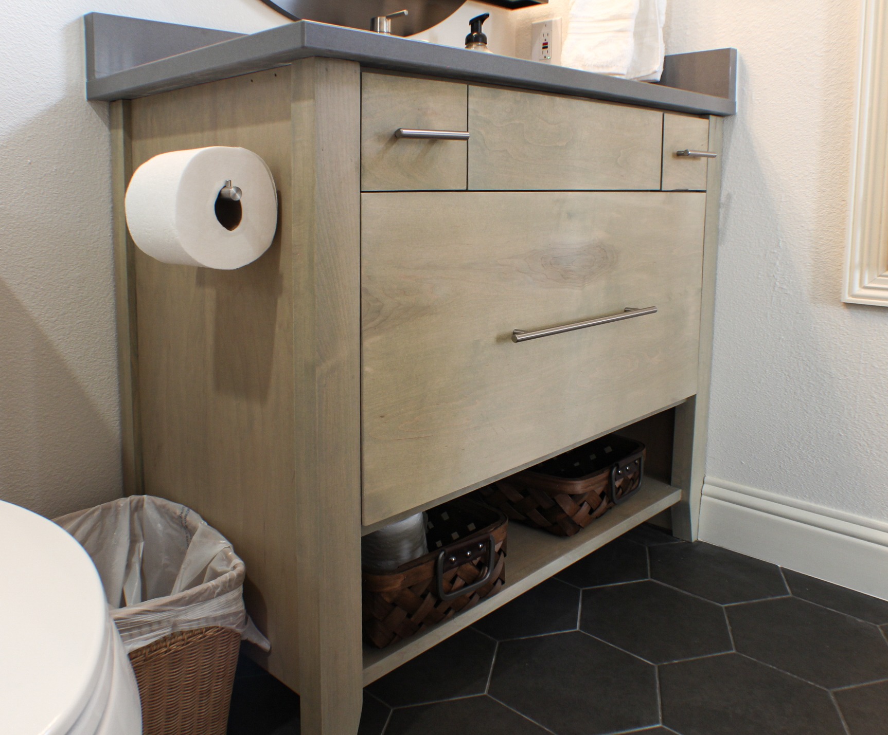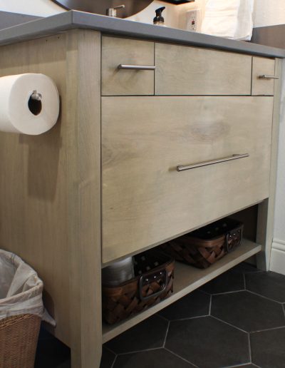 Our clients have a charming home in Fort Worth, but the bathrooms were outdated compared to the rest of the house. They trusted Home Front to renovate two of their upstairs bathrooms. In this masculine bathroom, we replaced the tile in the alcove tub and added quartz shampoo shelves. We also added a glass barn-style sliding door, and our custom cabinet builder made this custom vanity to be stained.