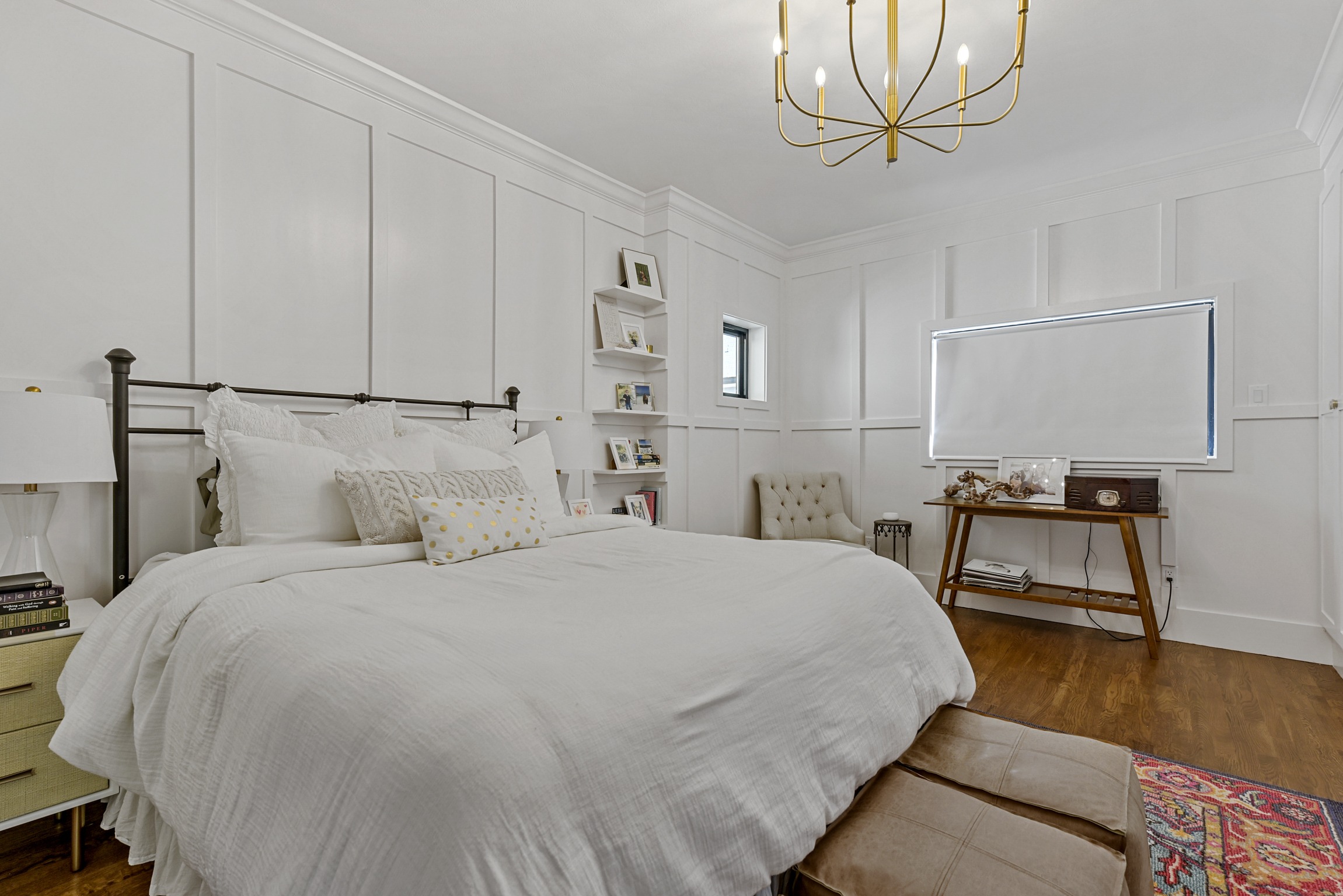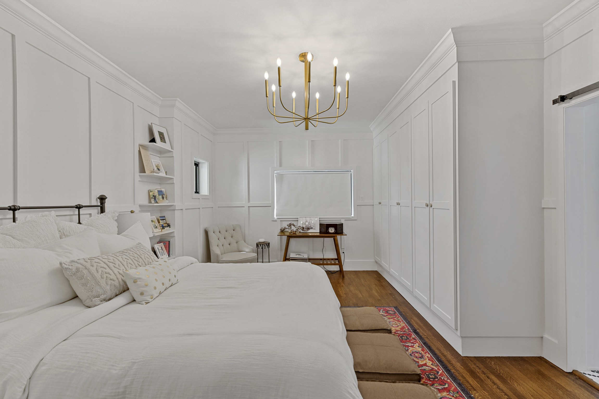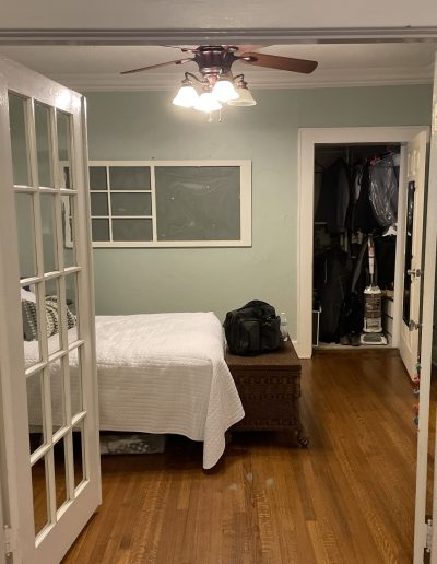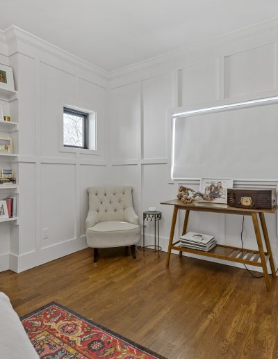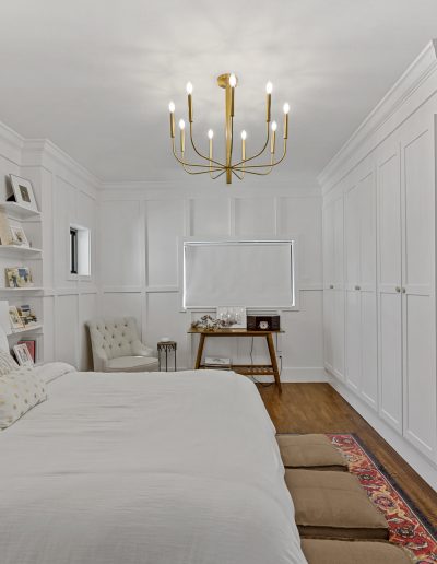 This may be a small space, but it got a big overhaul. For this project, our team expanded the bedroom by moving an exterior wall and adding a window. The board and batten molding on the walls gives the space a unique and clean look. This room also has a custom-built master closet and new hardwood floors to match the rest of the house.
