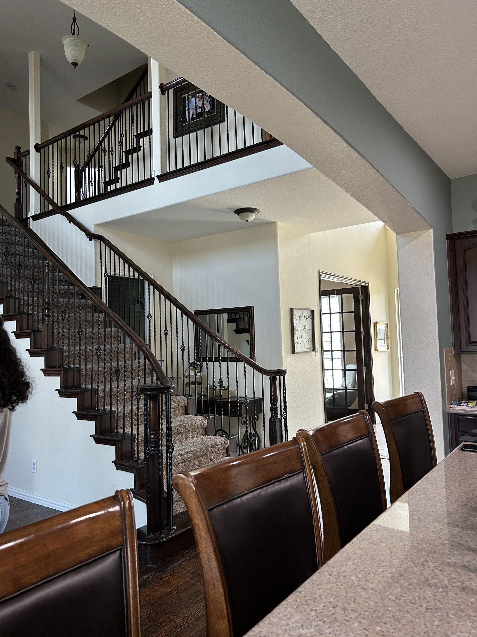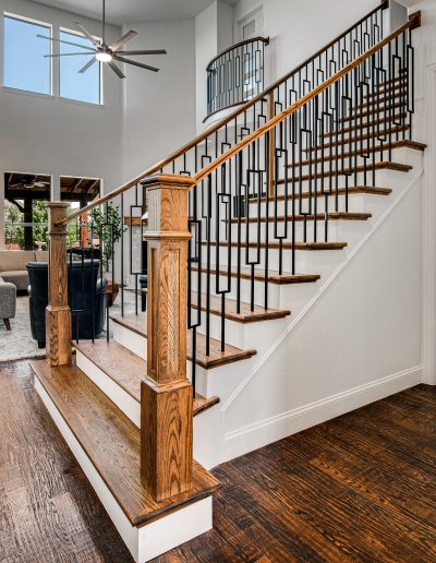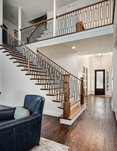 After starting on their kitchen and bathroom, our clients decided it would be best to get all of their projects done at one time. We were able to transform their staircase and fireplace. What was dark and traditional is now bright and modern! We absolutely love all of the stained elements and the sleek iron balusters.