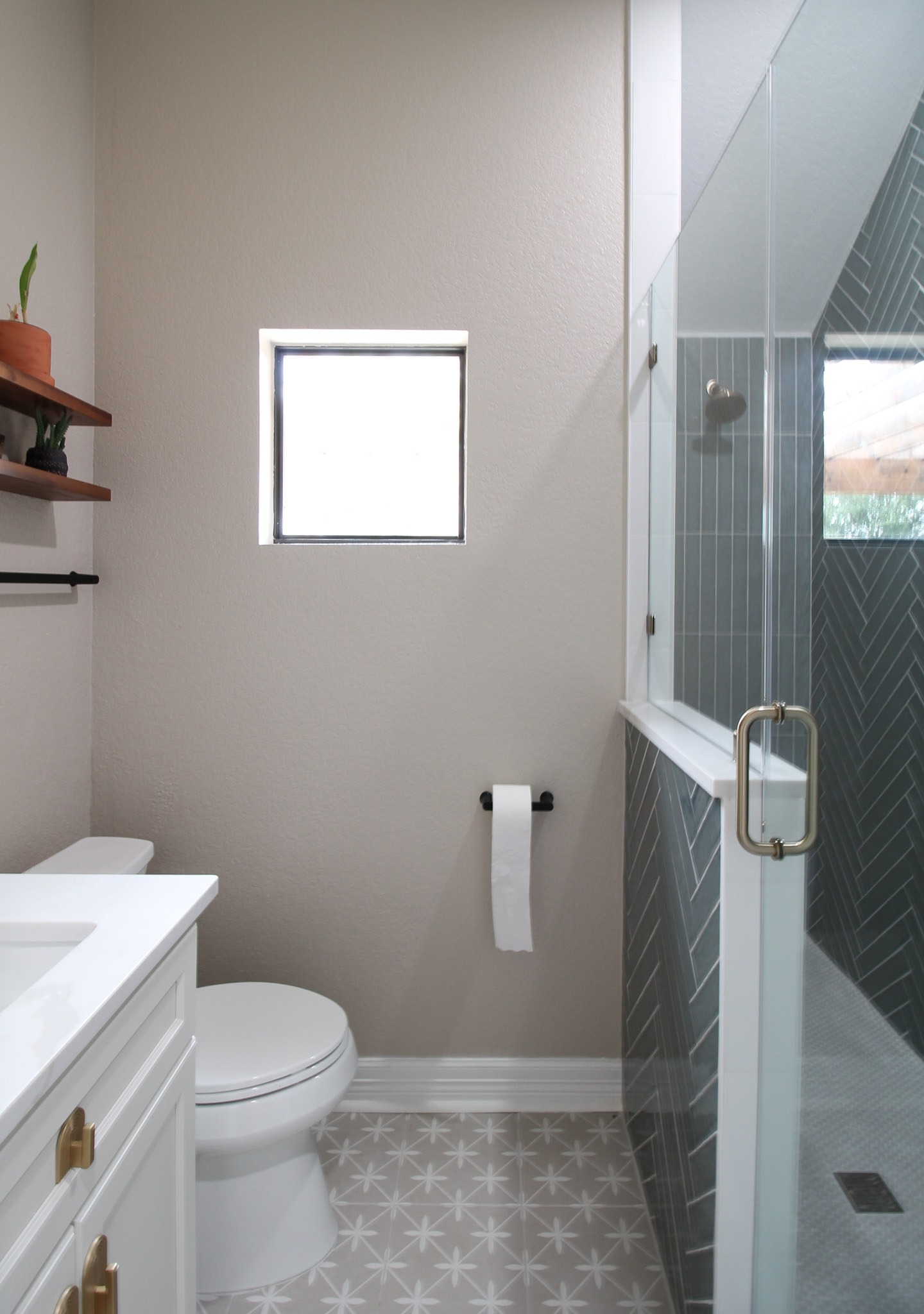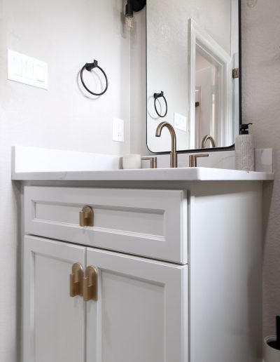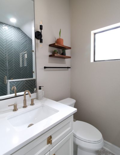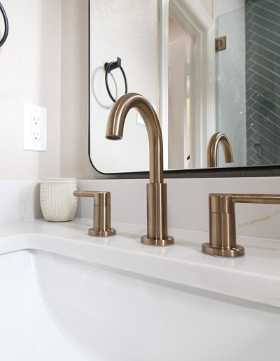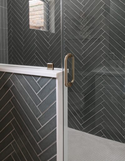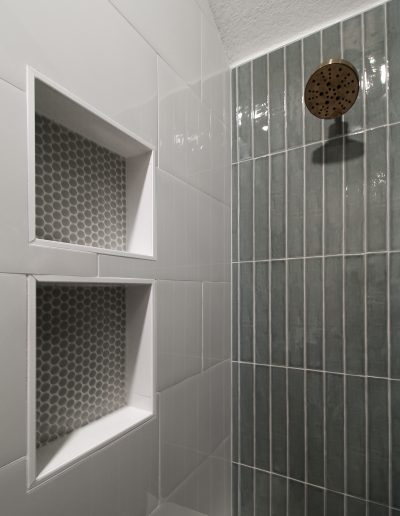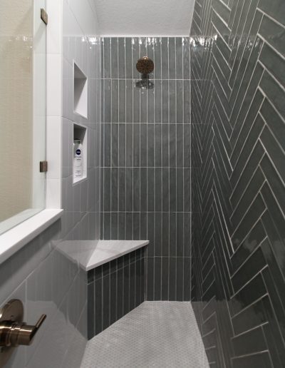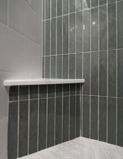 For the shower, our client chose the specialty herringbone pattern, and it turned out absolutely beautiful! The sage green tile goes to the ceiling to create an elegant look. Along with the off-white ready-made cabinets and the gold fixtures, this bathroom is a dream.