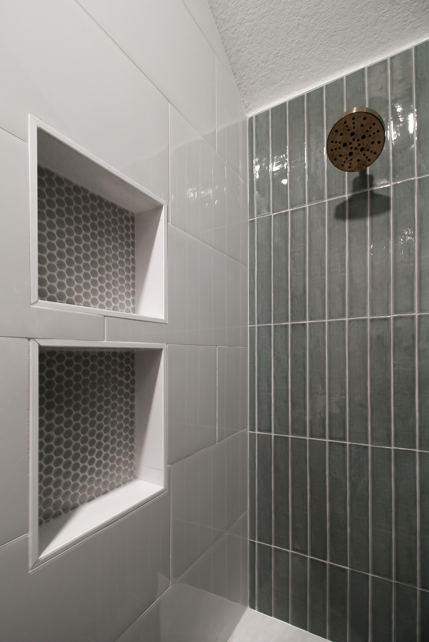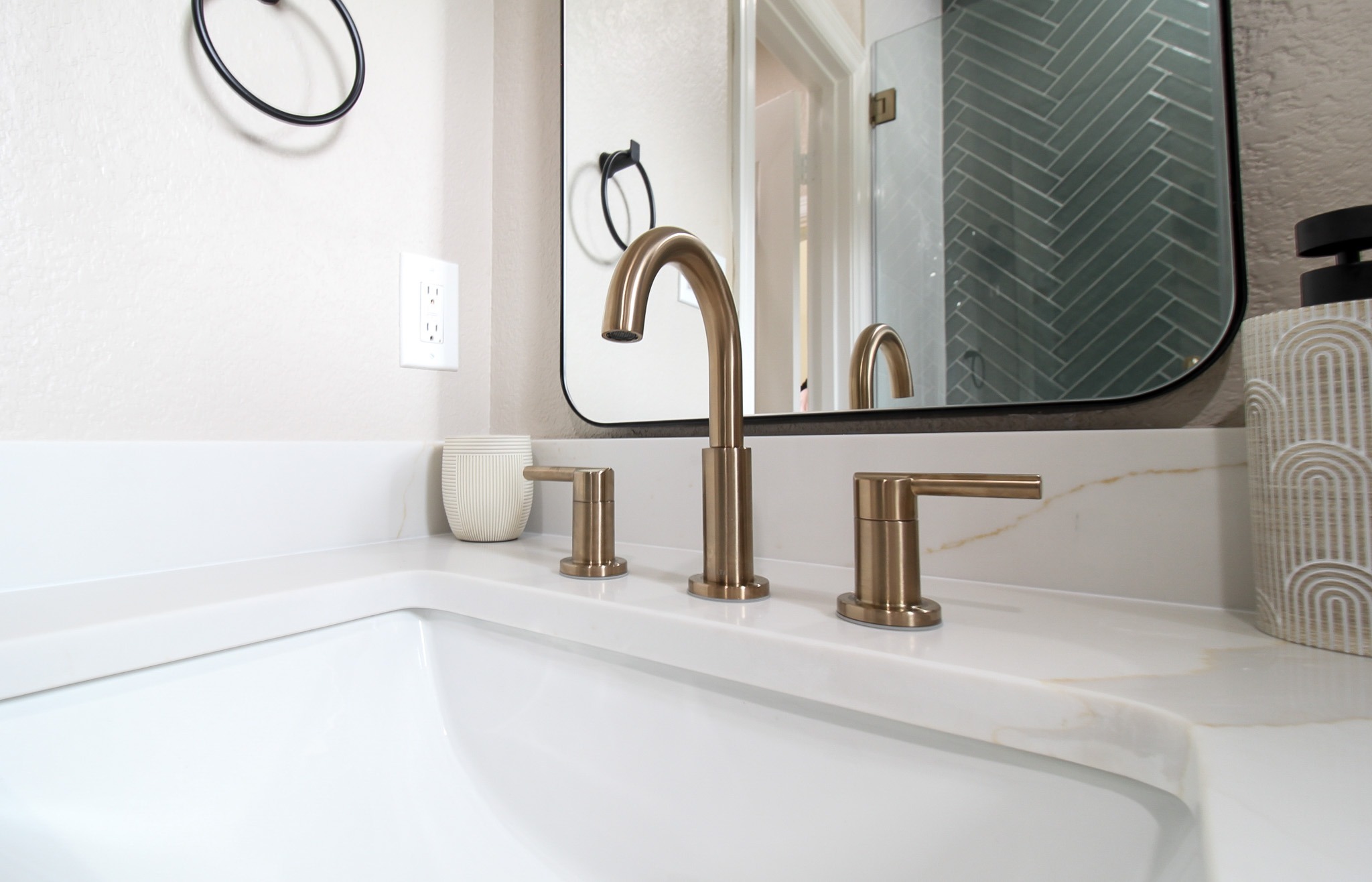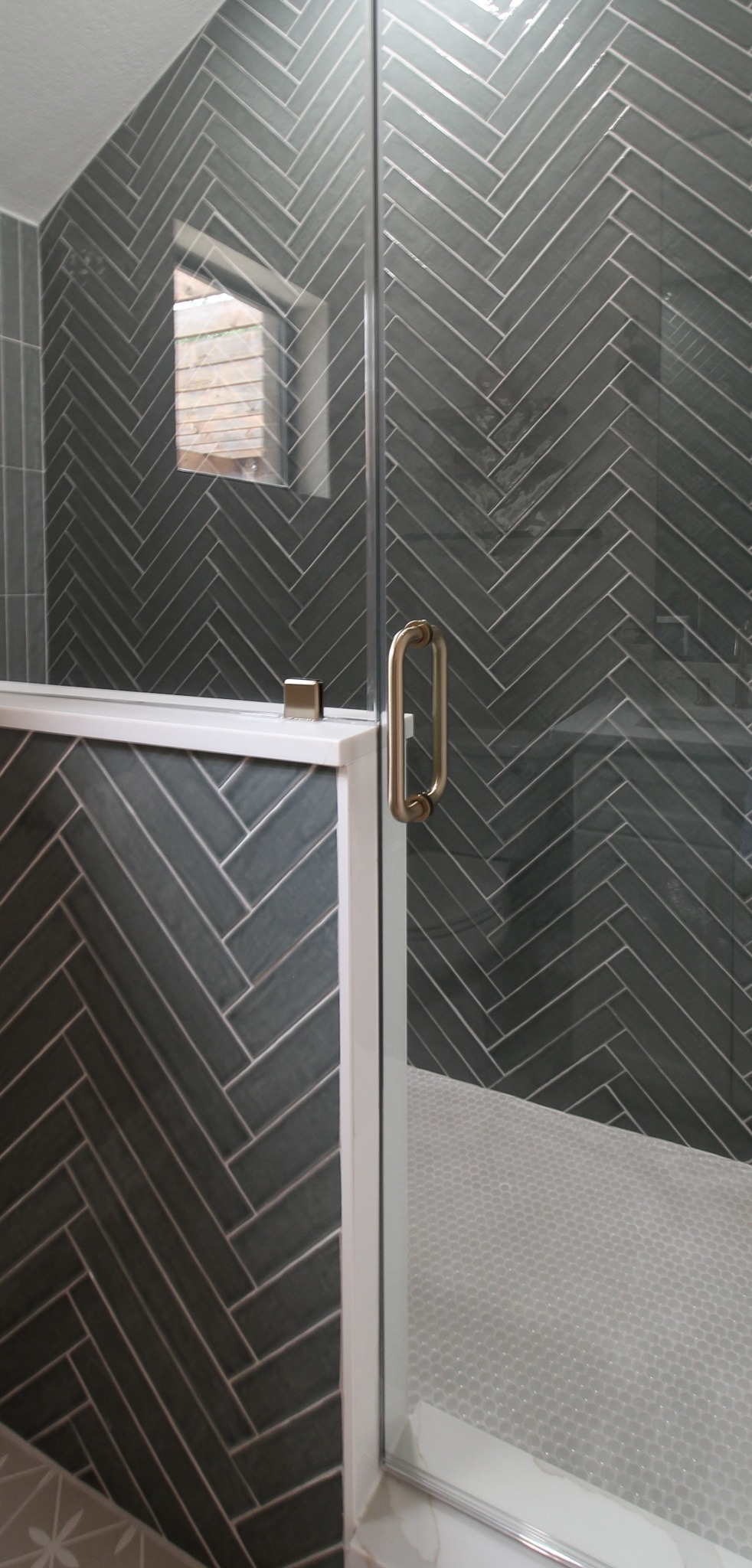 For the shower, our client chose the specialty herringbone pattern, and it turned out absolutely beautiful! The sage green tile goes to the ceiling to create an elegant look. Along with the off-white ready-made cabinets and the gold fixtures, this bathroom is a dream.