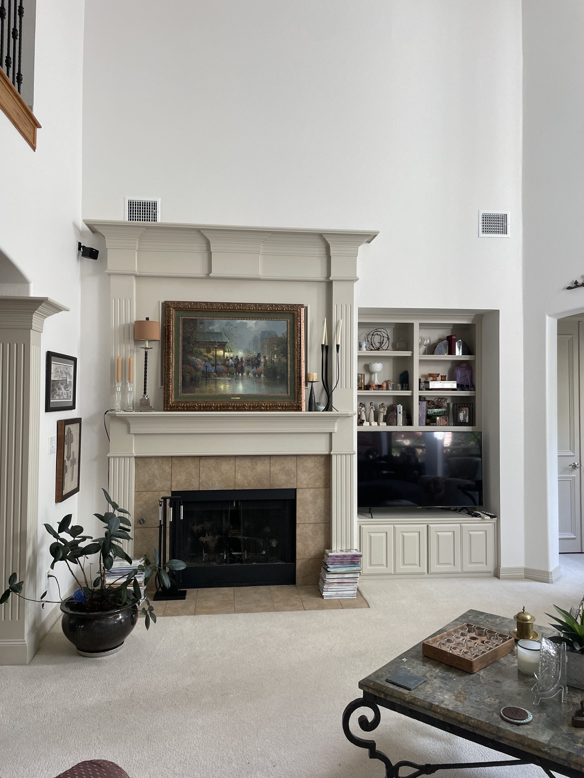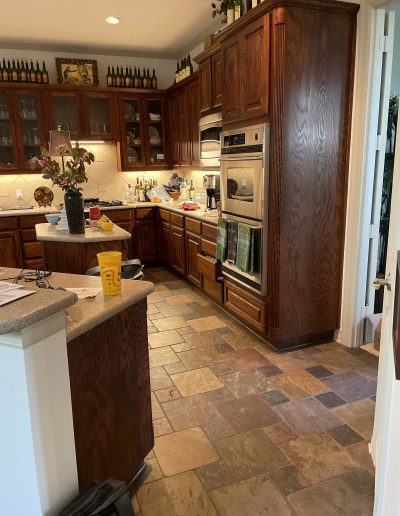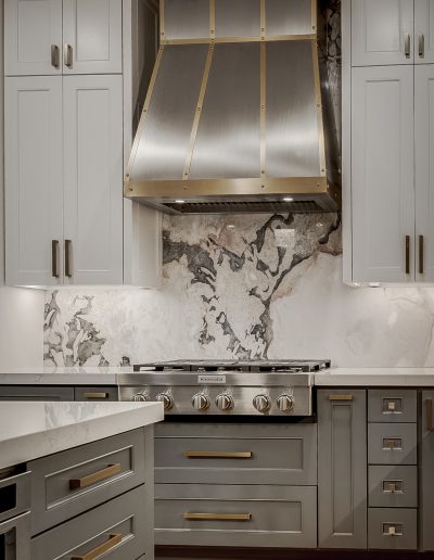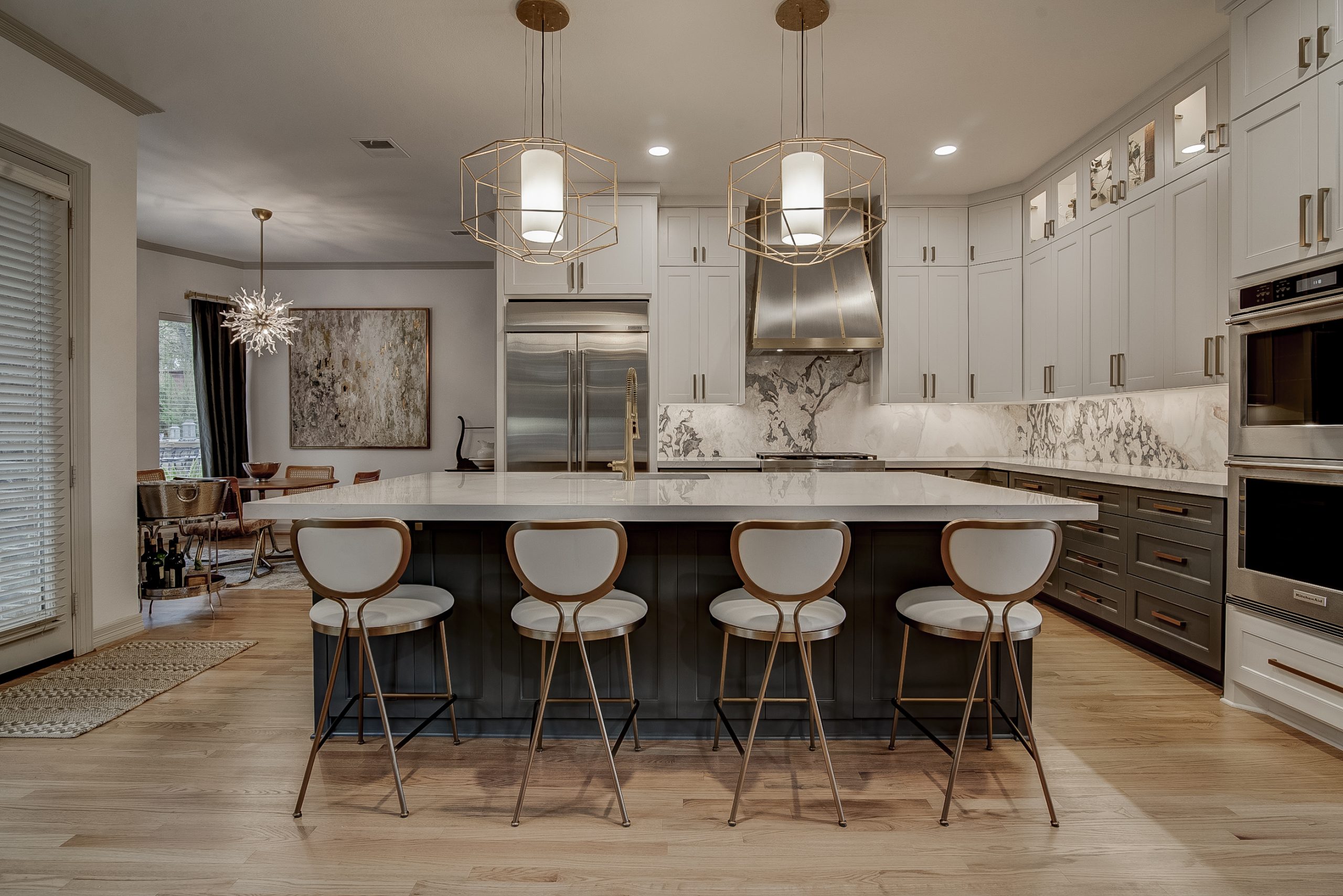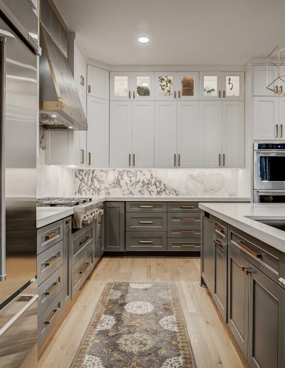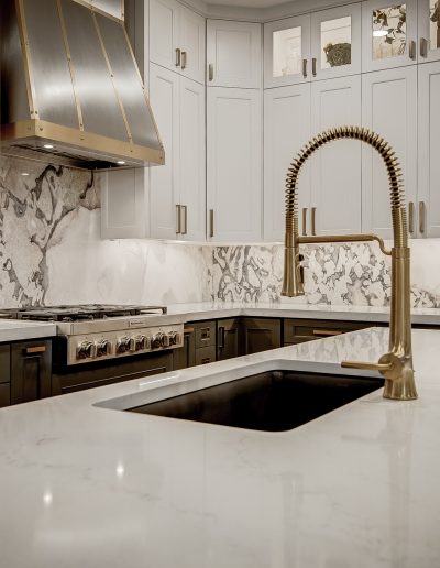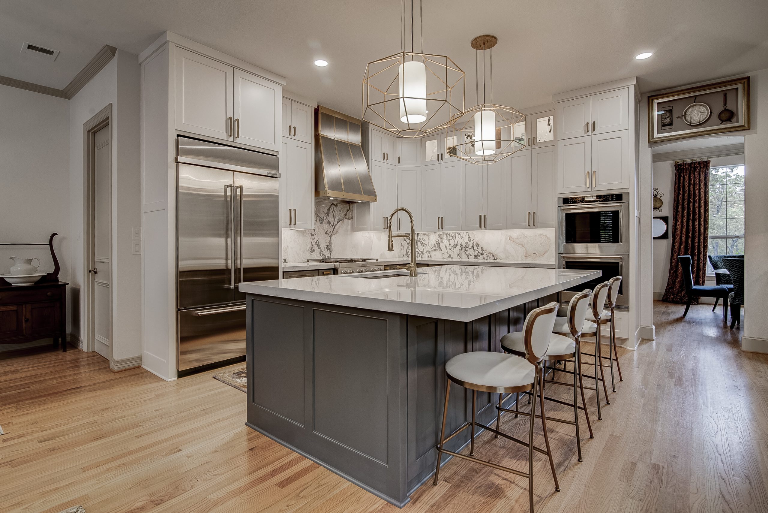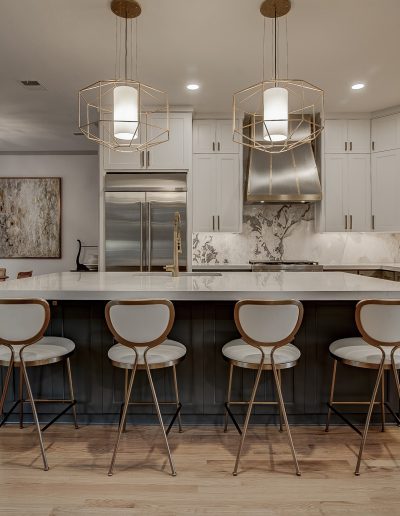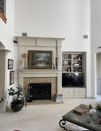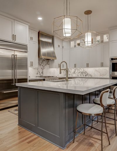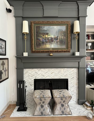 We removed the pantry from the kitchen and added one in the garage, that the client can access through the laundry room. The pantry was replaced with a new butler’s bar with wine and glass racks. Above the custom-painted cabinets and quartz countertops, the marble backsplash and metallic vent hood became beautiful focal points in the space. Our team also installed new hardwood floors throughout the living room and kitchen. For the fireplace, we repainted the trim and gave the tile a refresh.