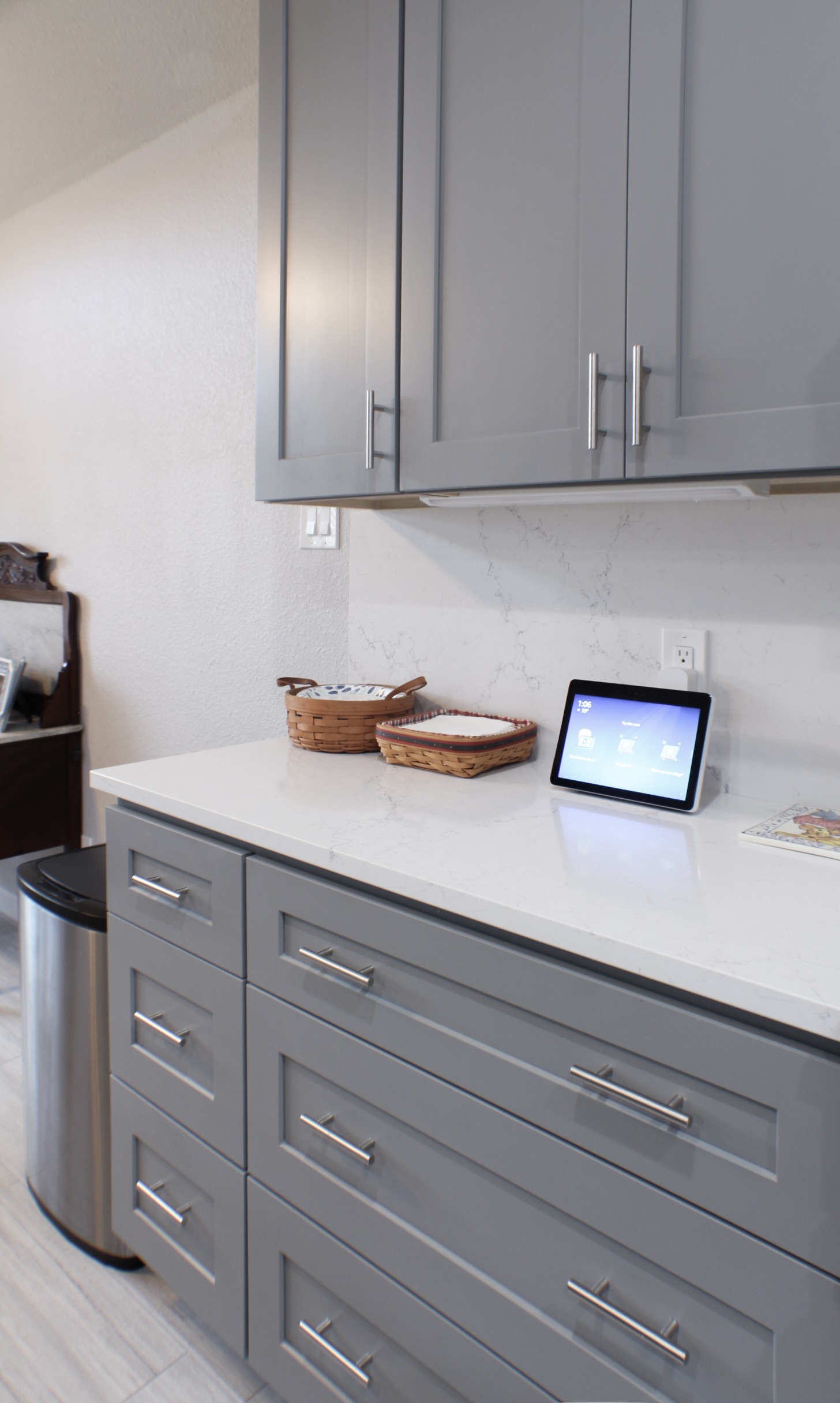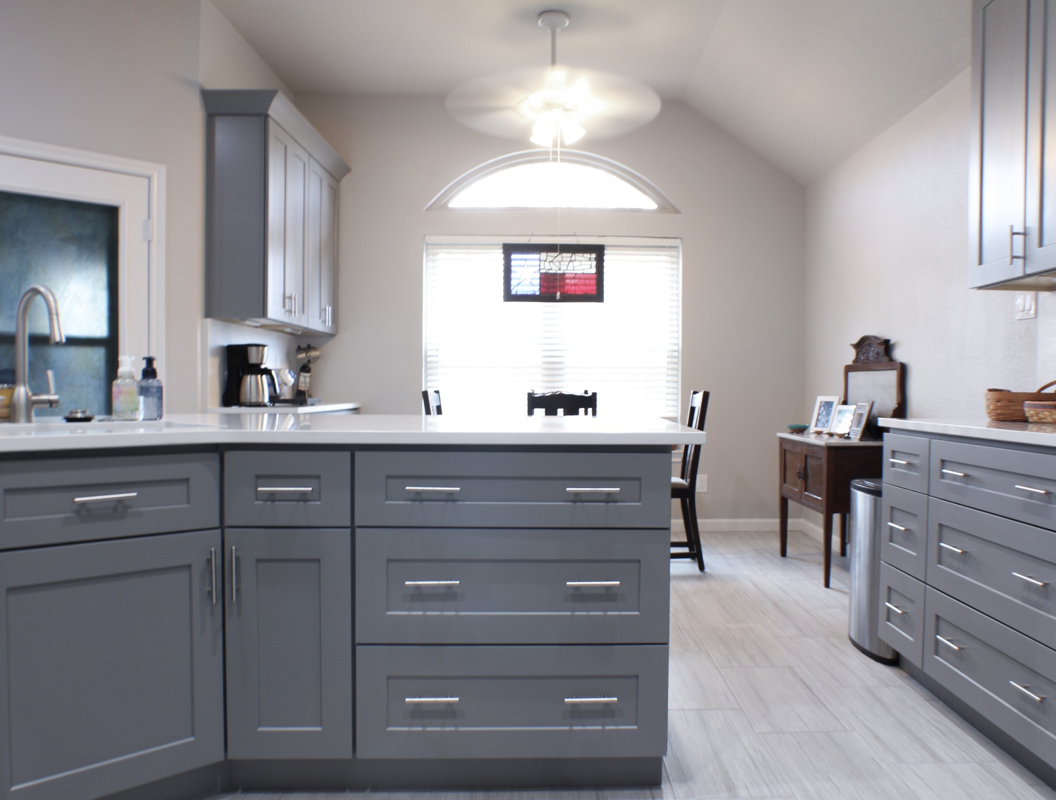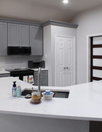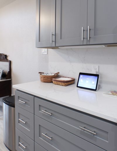 The biggest change they made in their kitchen was removing their angled pantry wall and squaring it off, making it more symmetrical with the rest of the kitchen. This made the new custom stained barn door stand out! We were able to save money in this kitchen by keeping the same footprint but using ready-made cabinets. By removing the bar from the peninsula and carrying the quartz countertop onto the backsplash, we opened up this space visually.