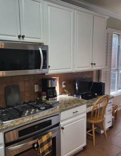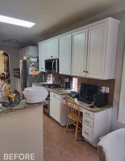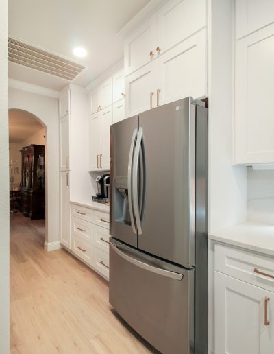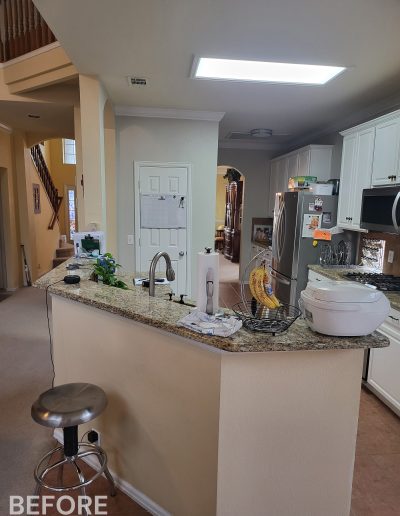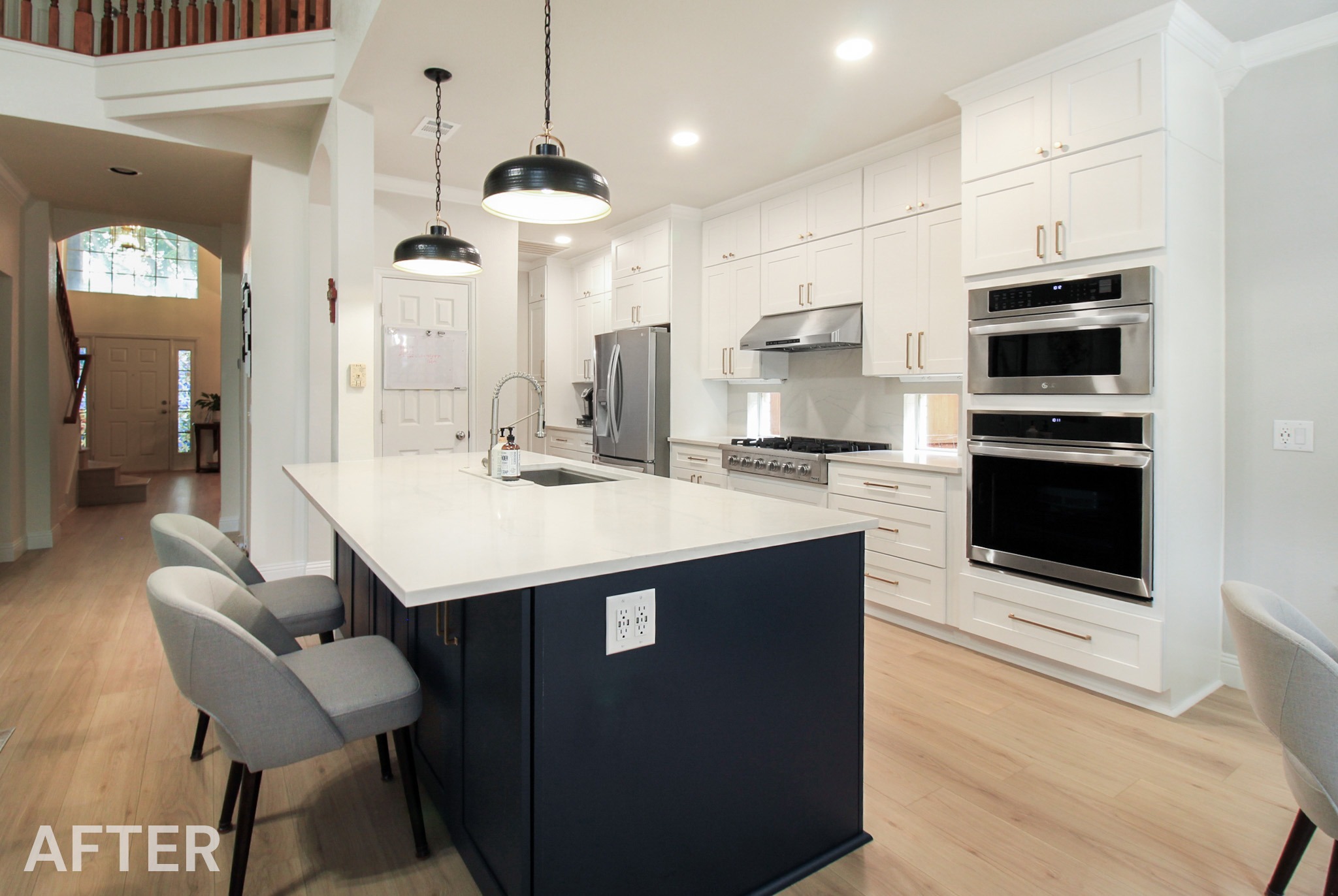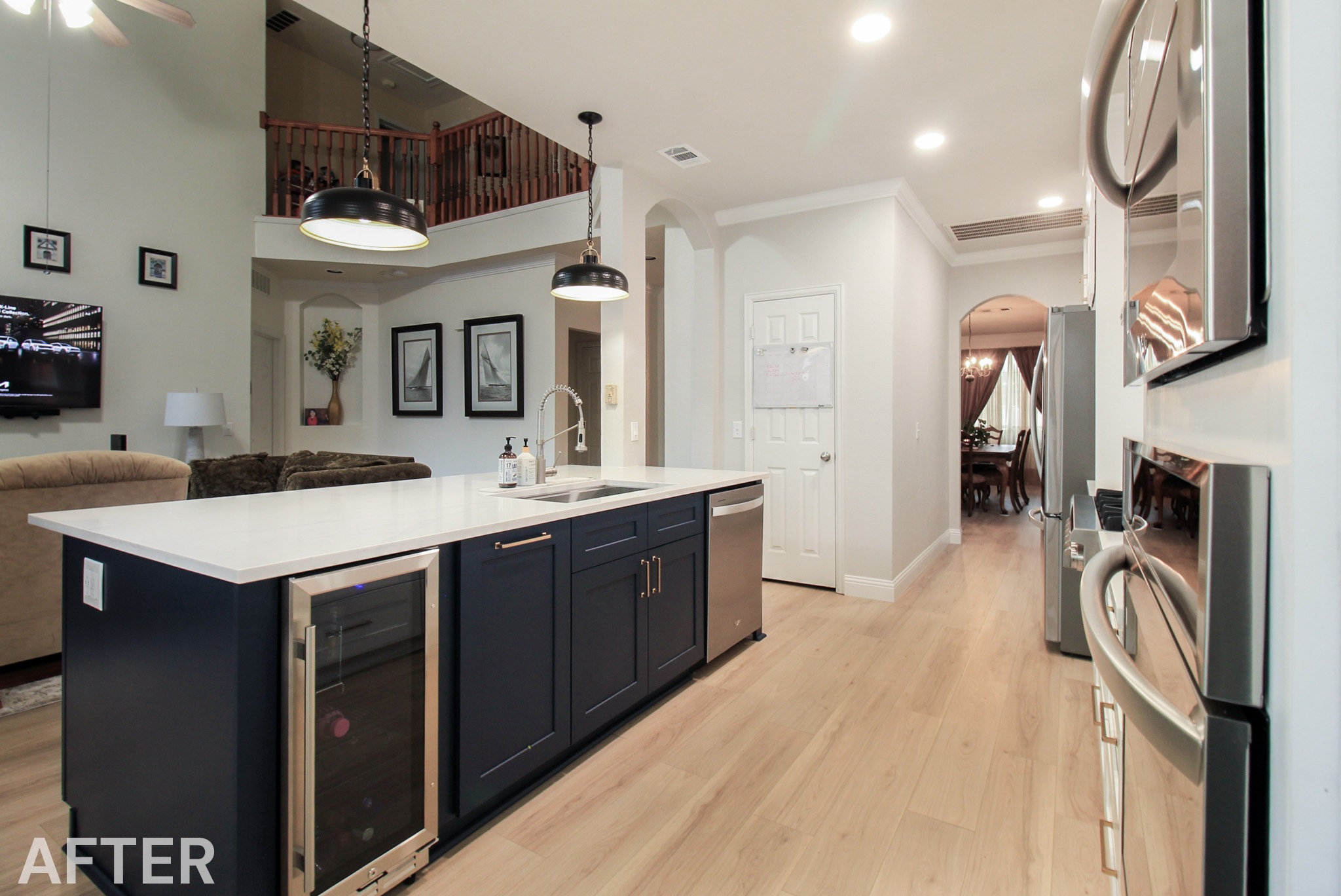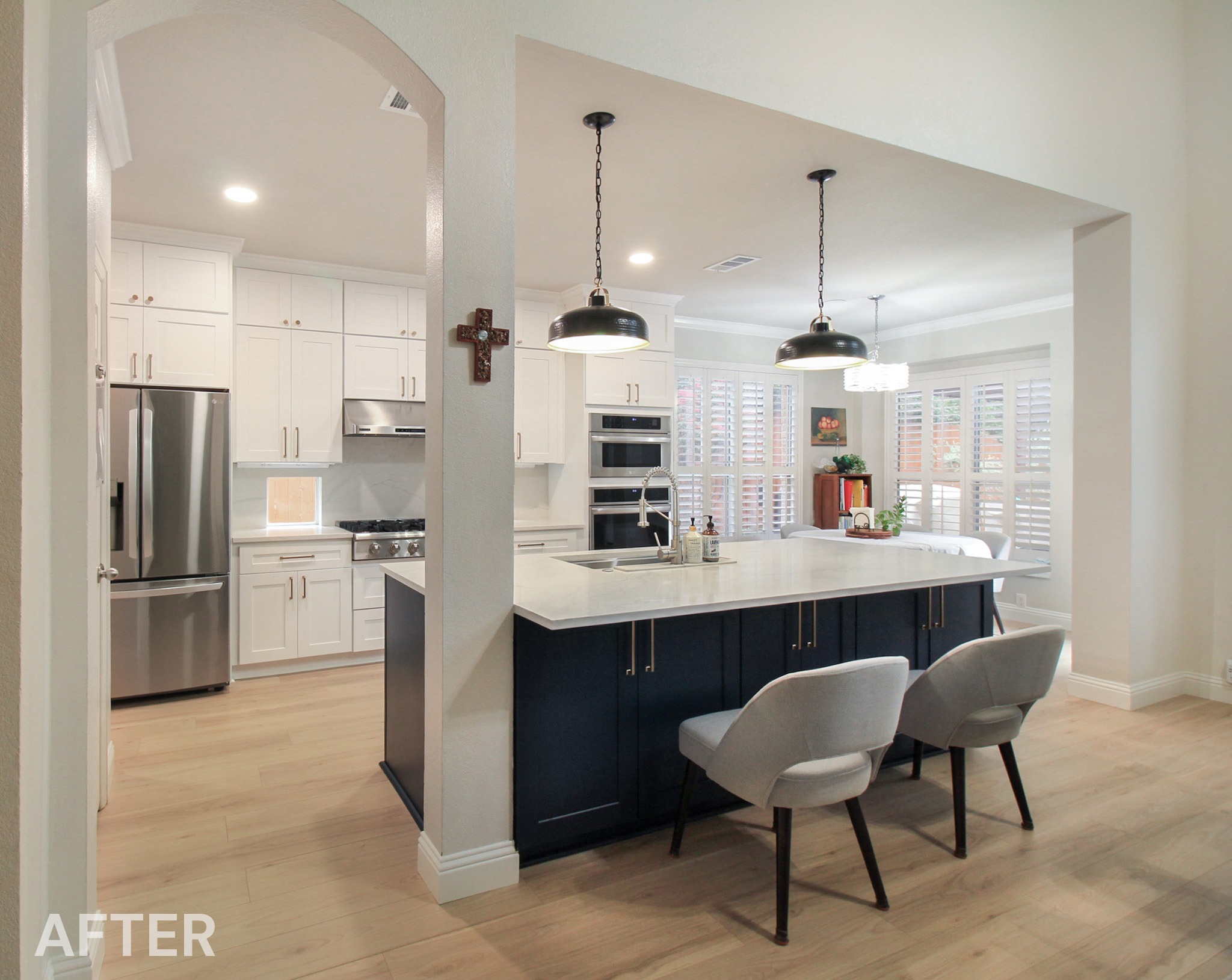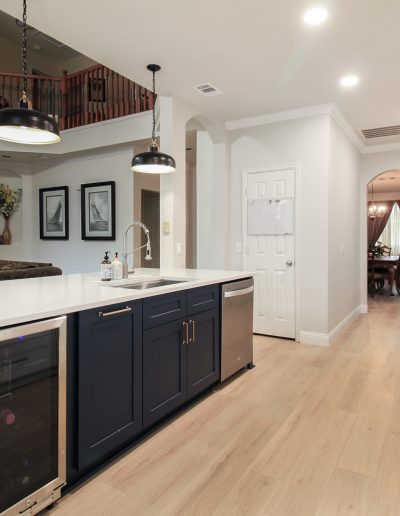 We helped these homeowners in North Richland Hills update their kitchen with new ready-made cabinets and quartz countertops that continue onto the backsplash. We squared off the new, navy blue island to create a more functional layout and added an eat-in bar, perfect for casual meals or entertaining. We finished the kitchen with elegant gold cabinet pulls and large pendant lights. To enhance the visual flow in their open-concept home, we replaced all of the flooring downstairs with luxury vinyl tile (LVP) that’s both durable and beautiful. We absolutely love projects with a navy island and gold accents, and this one is no exception!
