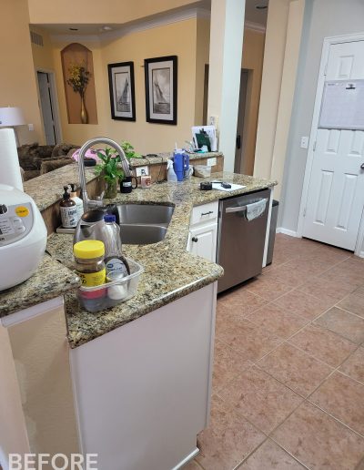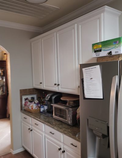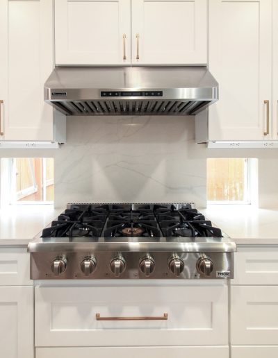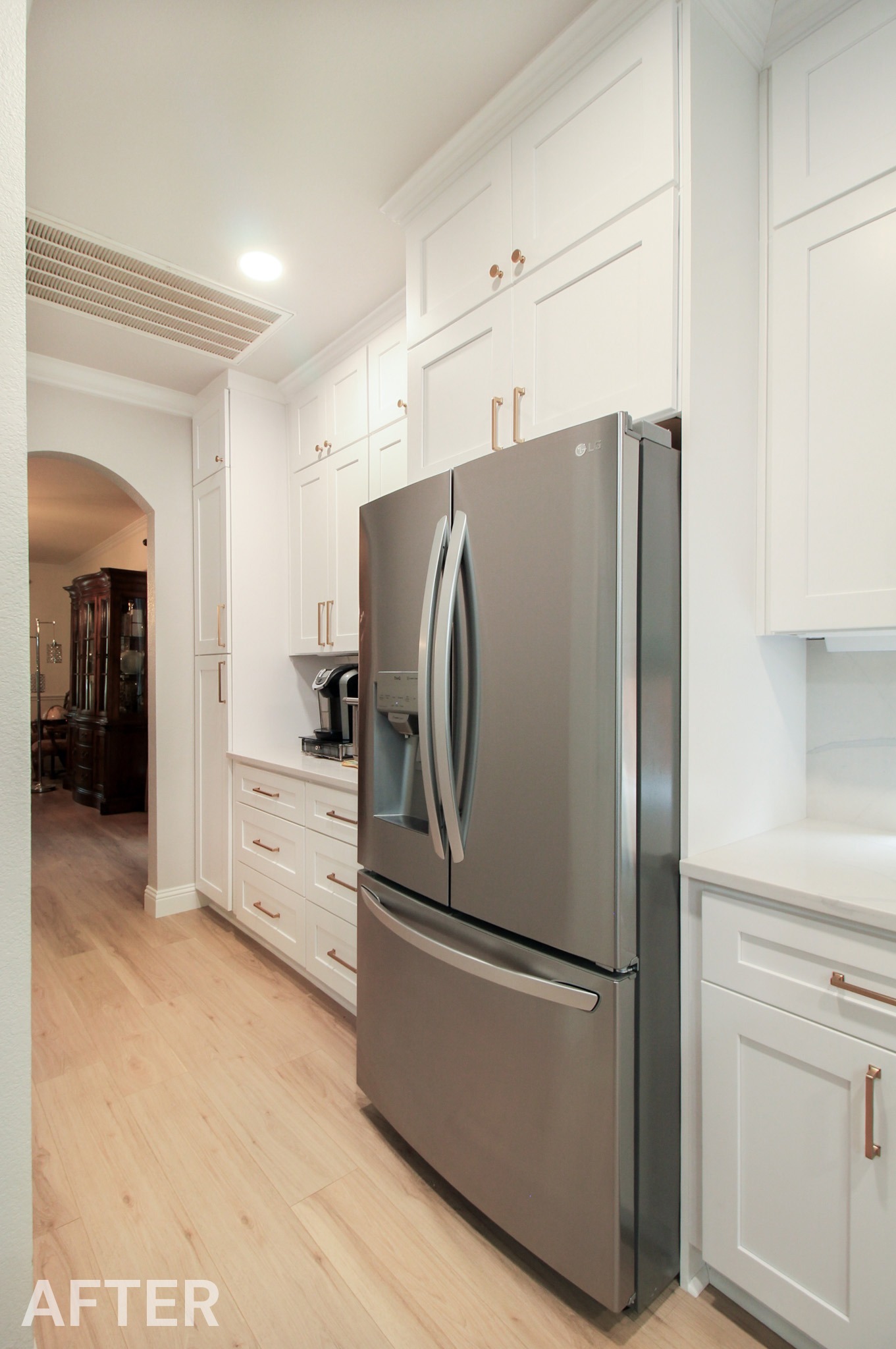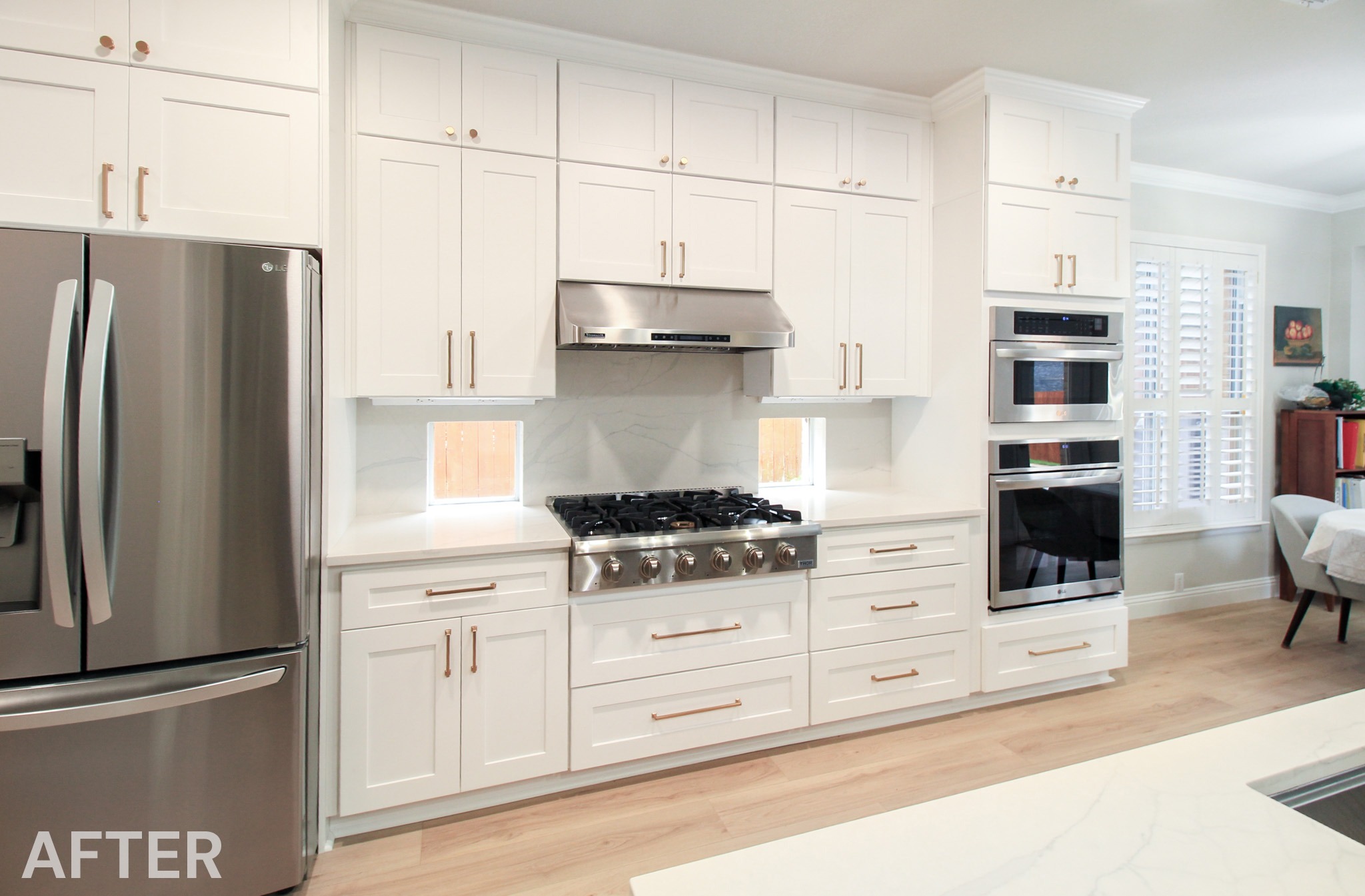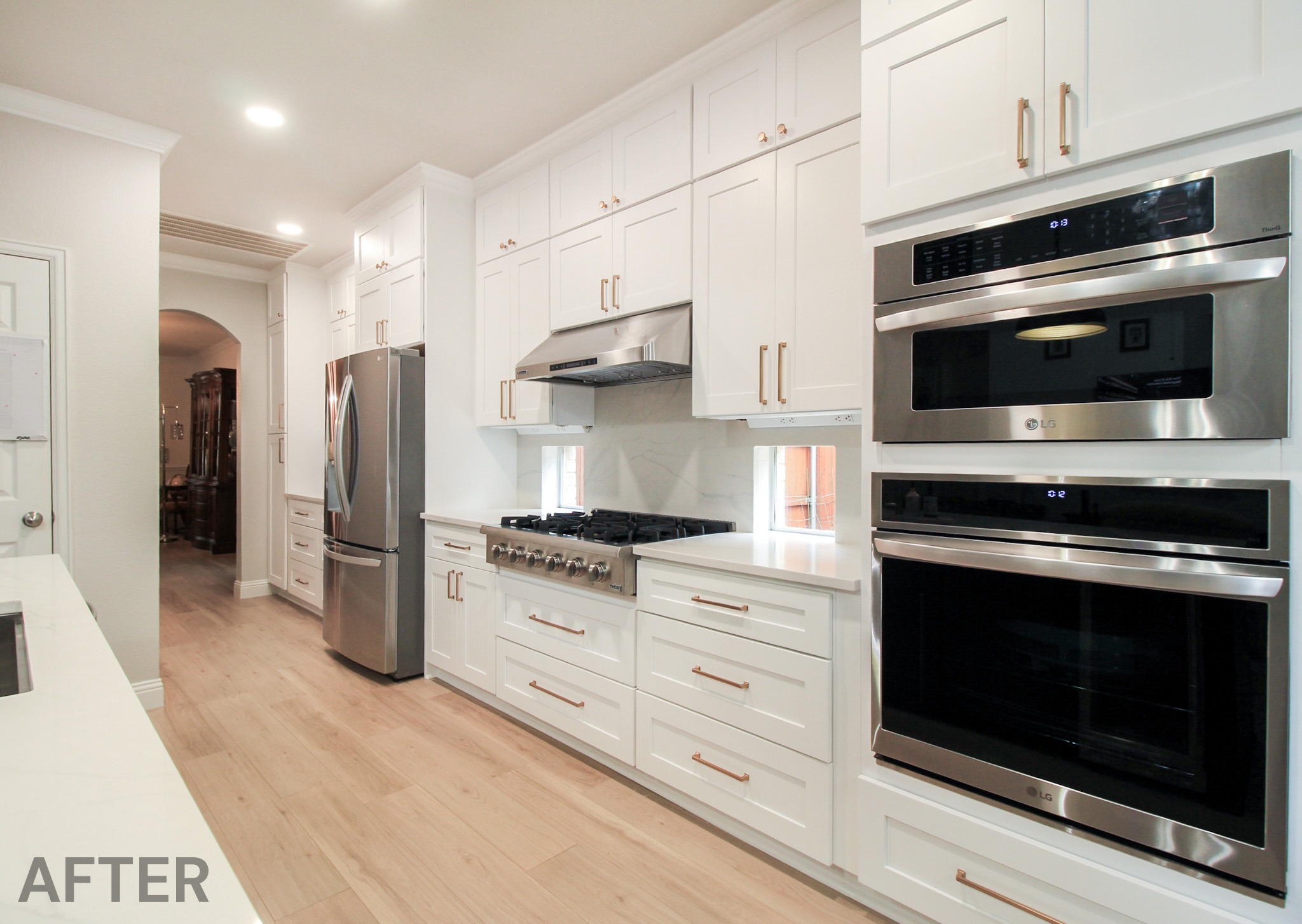 We helped these homeowners in North Richland Hills update their kitchen with new ready-made cabinets and quartz countertops that continue onto the backsplash. We squared off the new, navy blue island to create a more functional layout and added an eat-in bar, perfect for casual meals or entertaining. We finished the kitchen with elegant gold cabinet pulls and large pendant lights. To enhance the visual flow in their open-concept home, we replaced all of the flooring downstairs with luxury vinyl tile (LVP) that’s both durable and beautiful. We absolutely love projects with a navy island and gold accents, and this one is no exception!