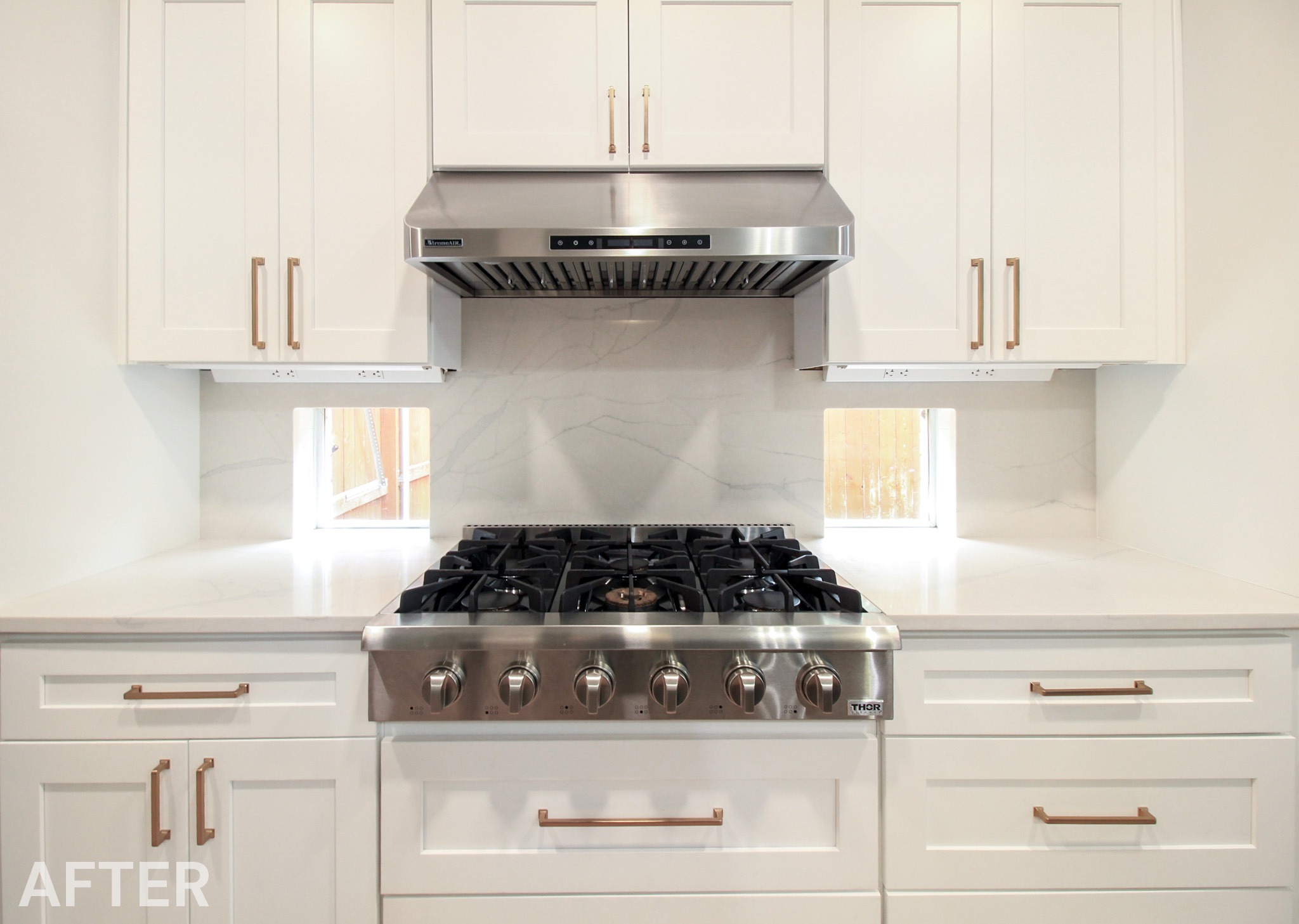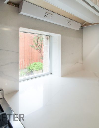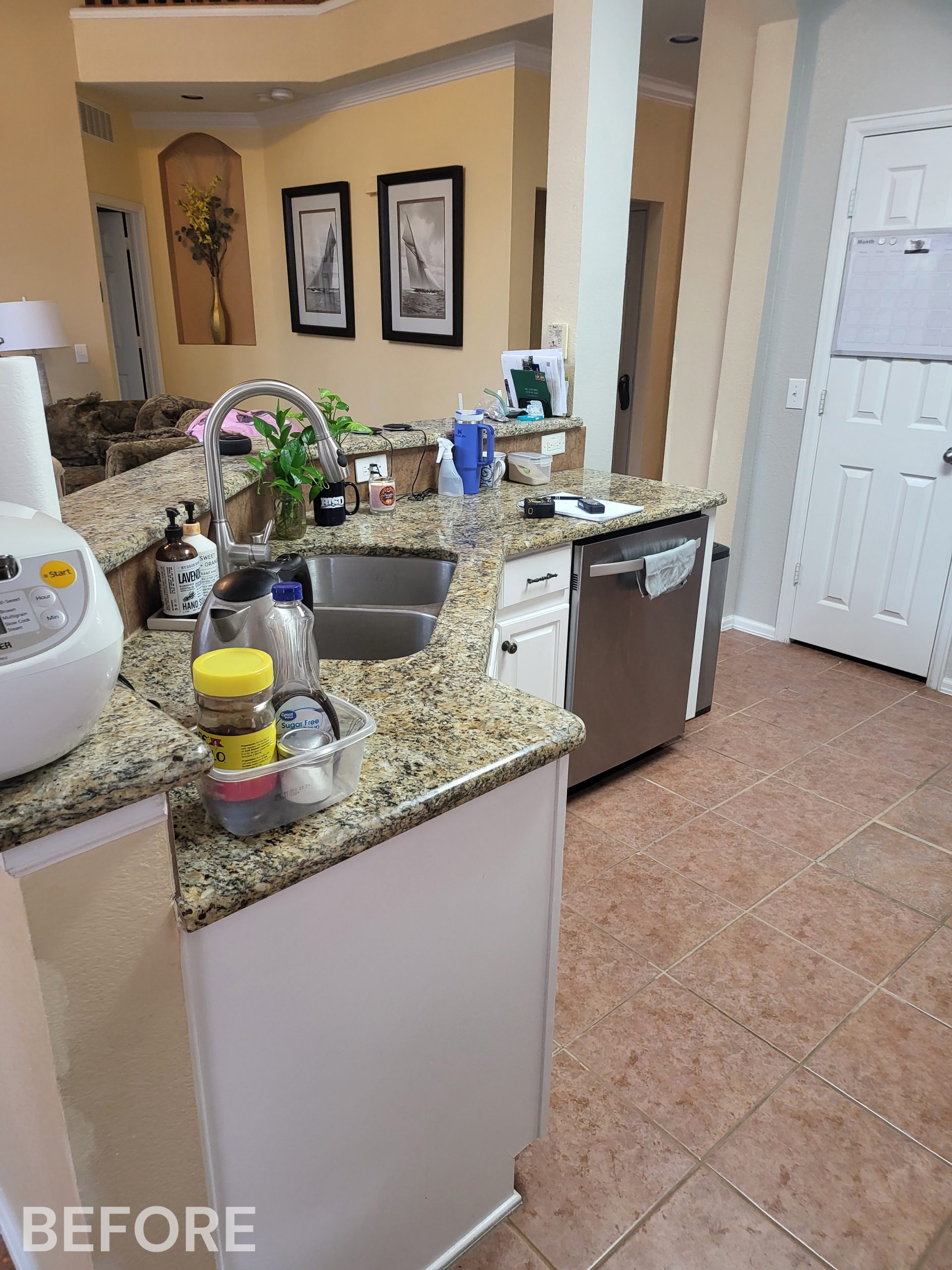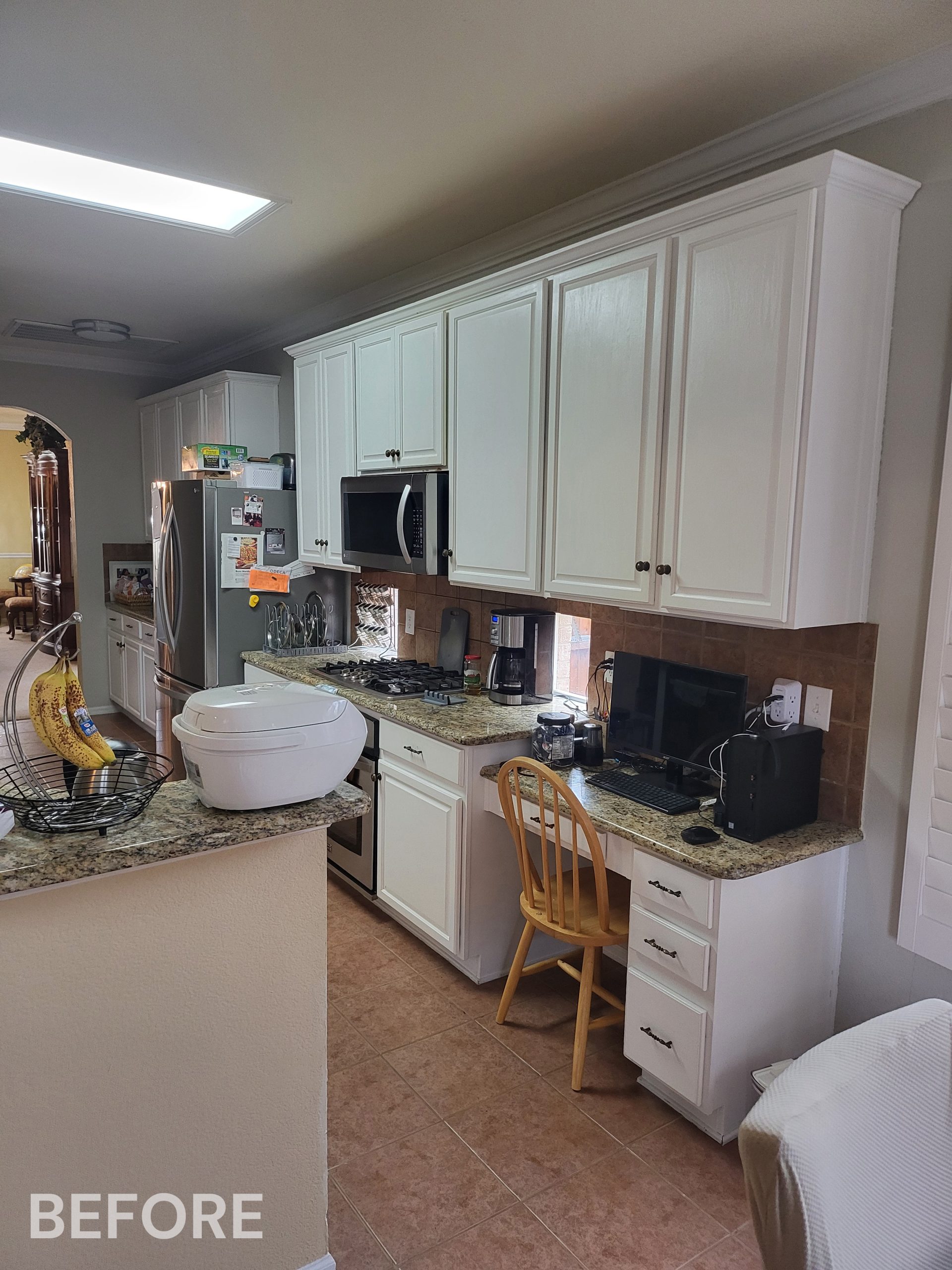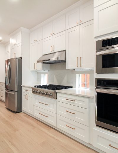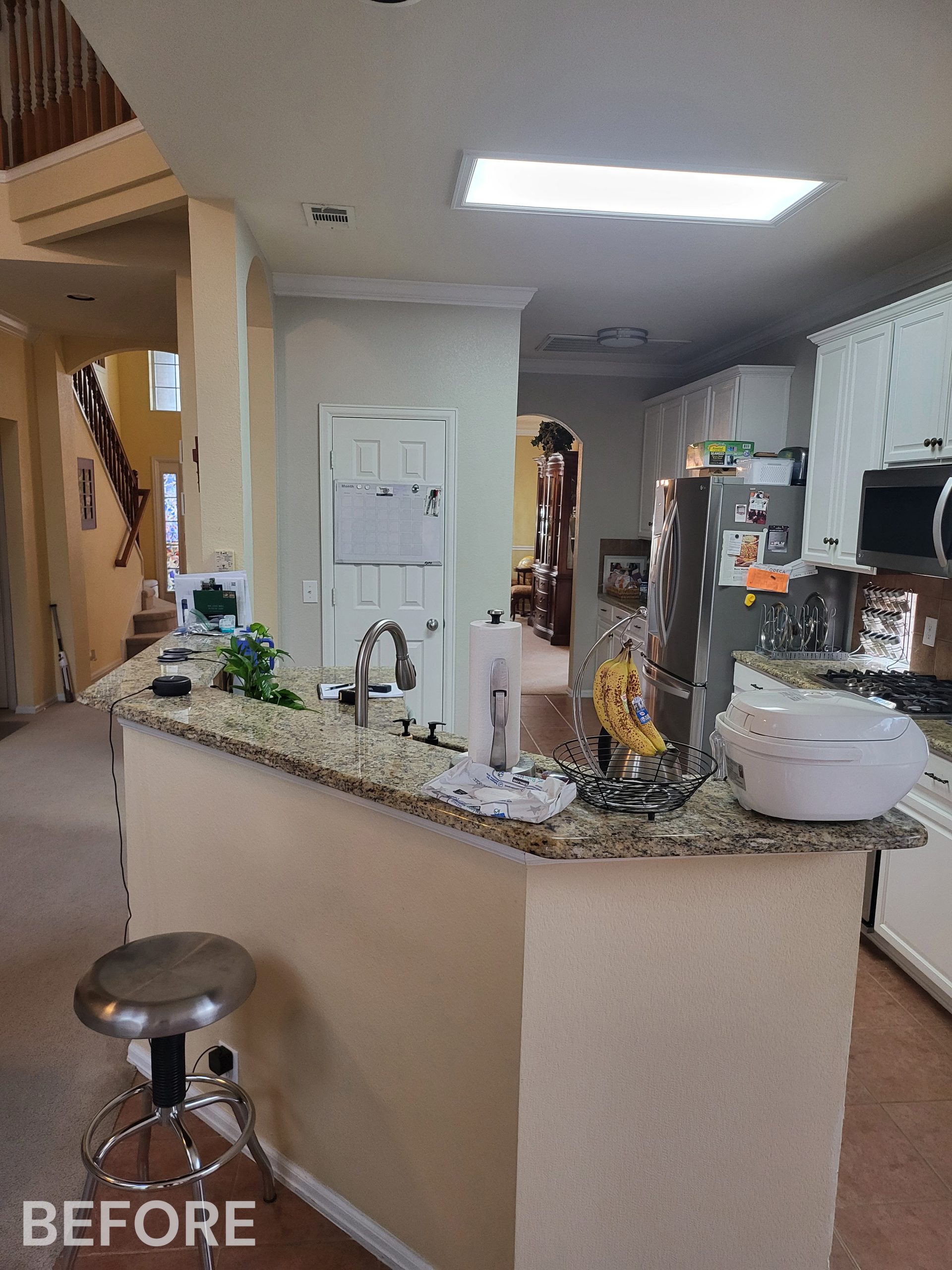 We helped these homeowners in North Richland Hills update their kitchen with new ready-made cabinets and quartz countertops that continue onto the backsplash. We squared off the new, navy blue island to create a more functional layout and added an eat-in bar, perfect for casual meals or entertaining. We finished the kitchen with elegant gold cabinet pulls and large pendant lights. To enhance the visual flow in their open-concept home, we replaced all of the flooring downstairs with luxury vinyl tile (LVP) that’s both durable and beautiful. We absolutely love projects with a navy island and gold accents, and this one is no exception!