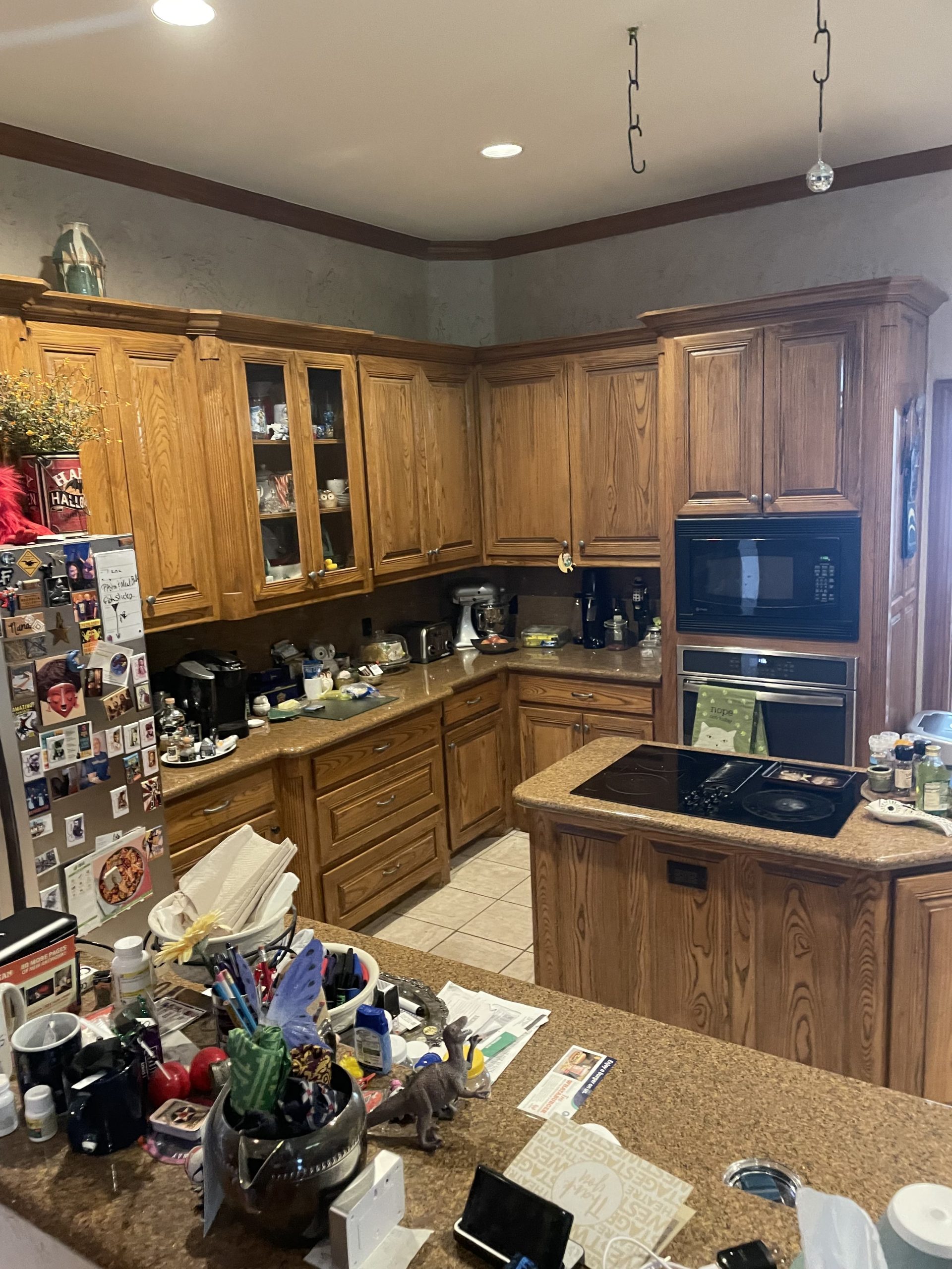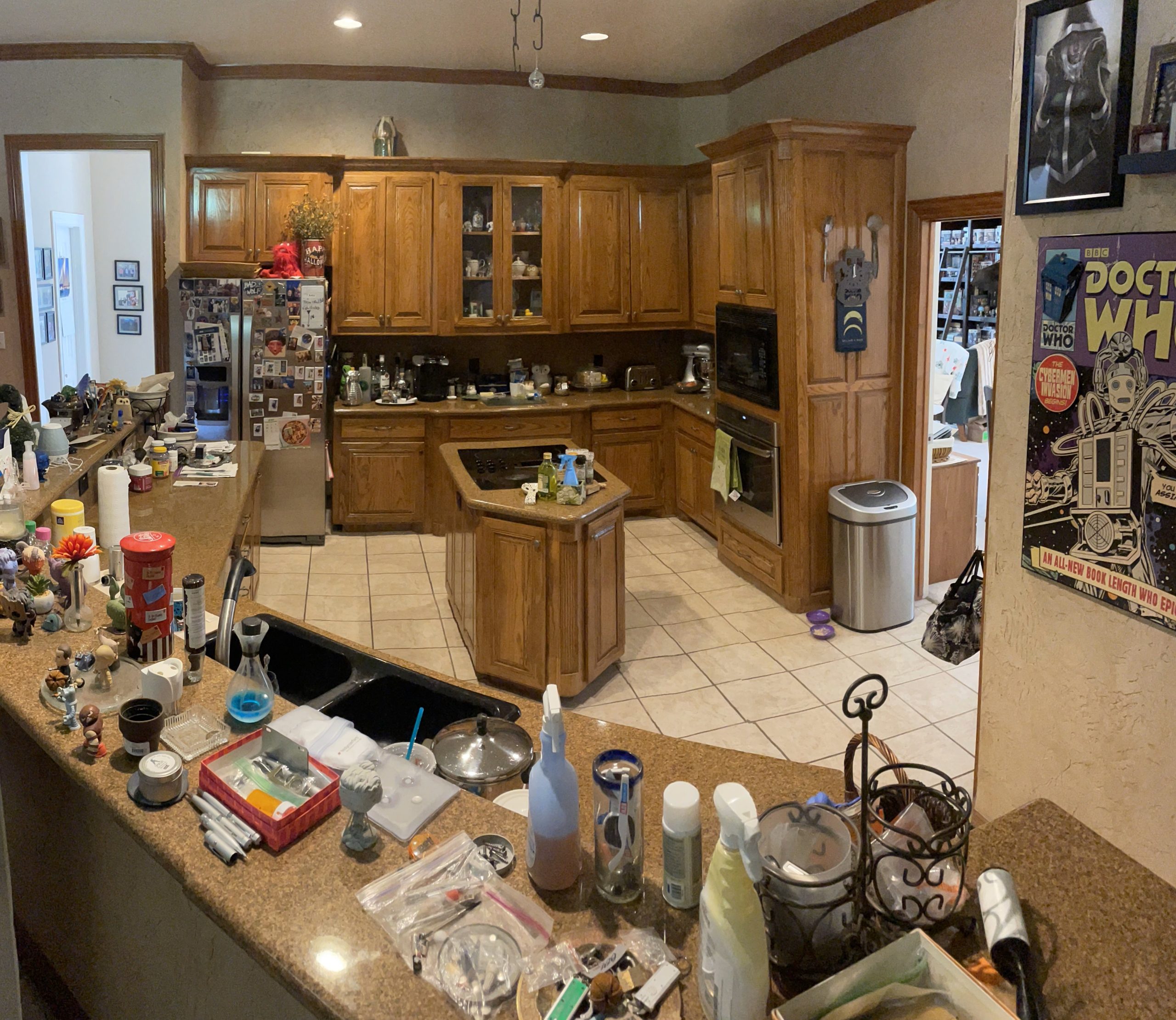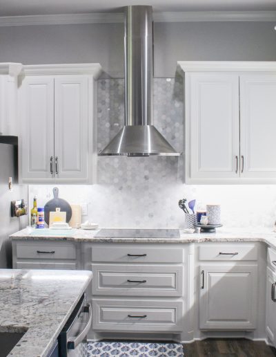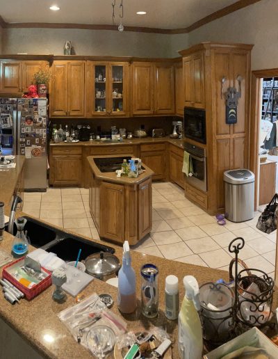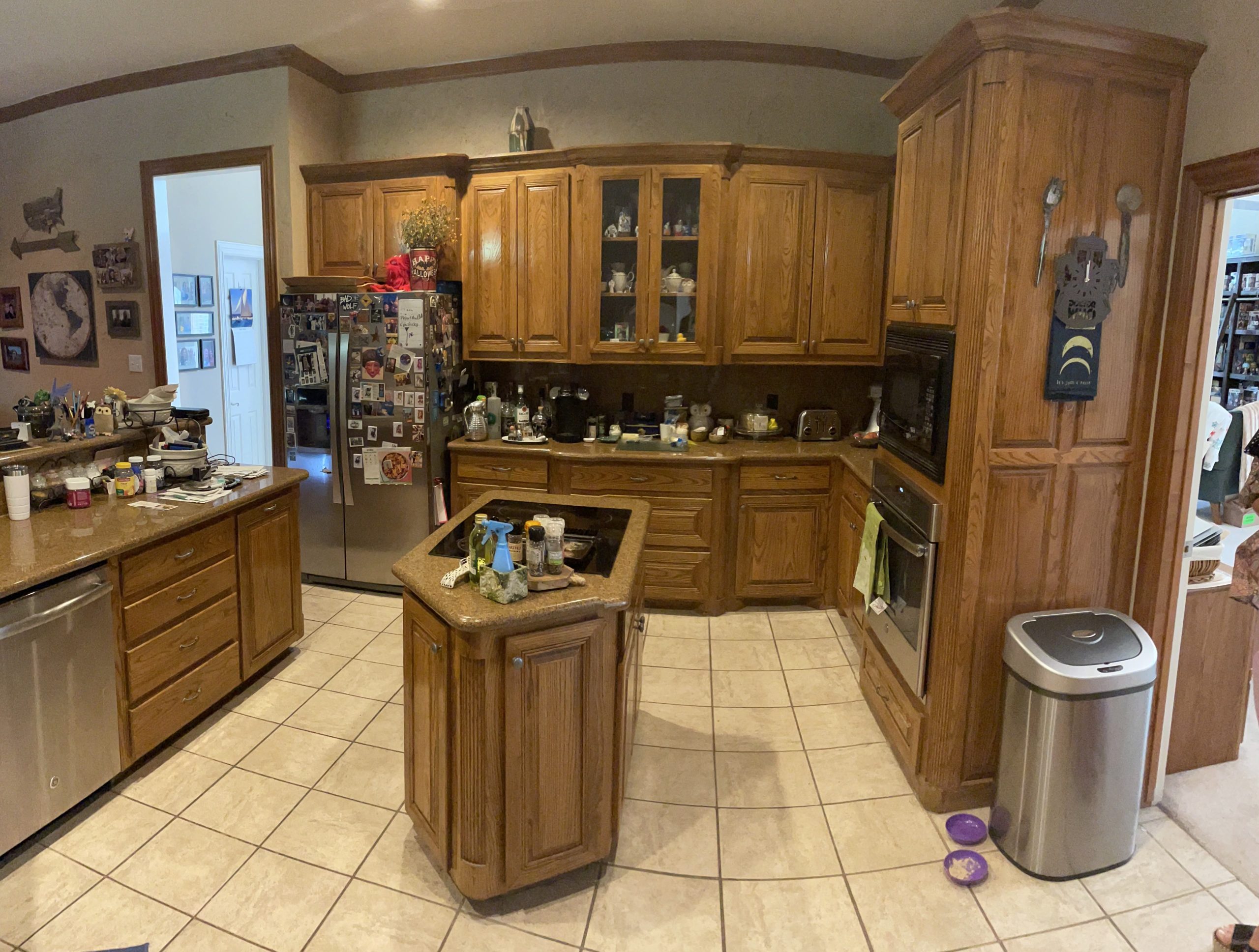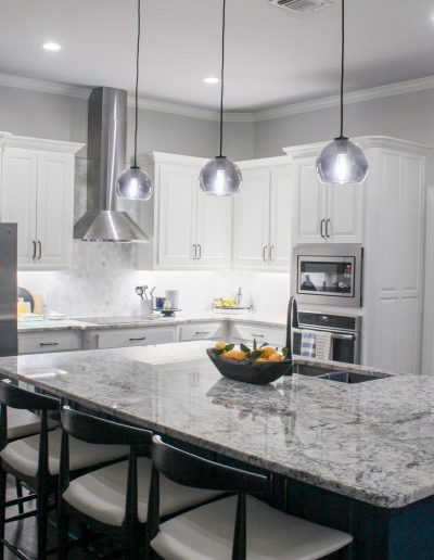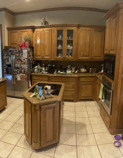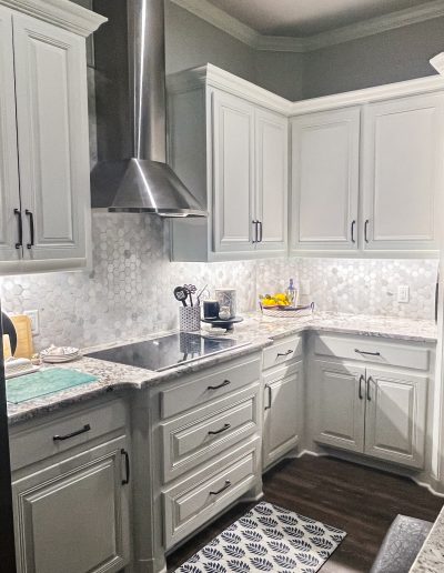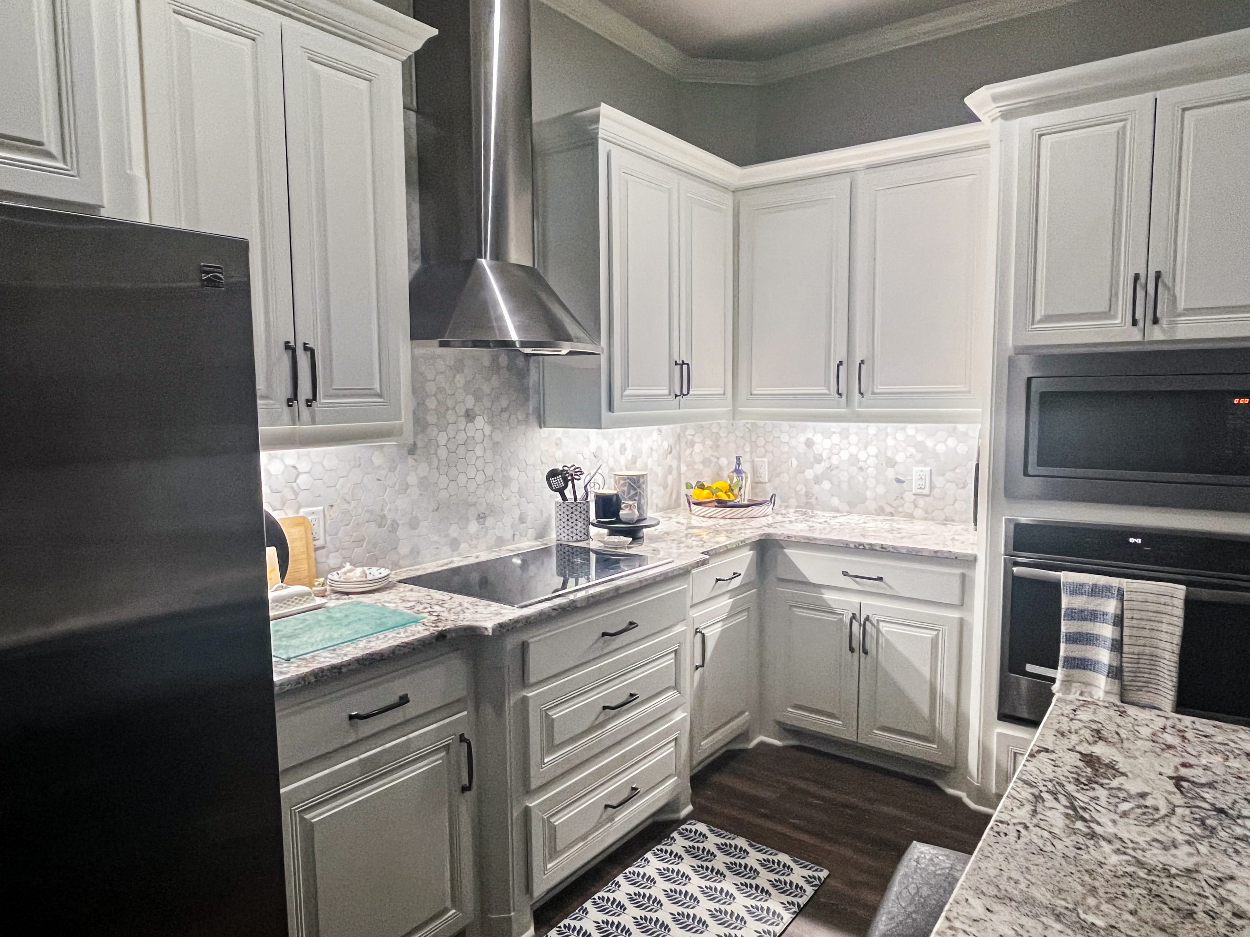 We were referred to this client in North Richland Hills by a previous happy customer. Our estimators and an external designer offered several solutions to lower the cost of their project and give them the kitchen of their dreams. For better functionality, we modified existing cabinets and added a large custom island. The upgrades include new LVP flooring, backsplash, granite countertops, paint, and lighting.