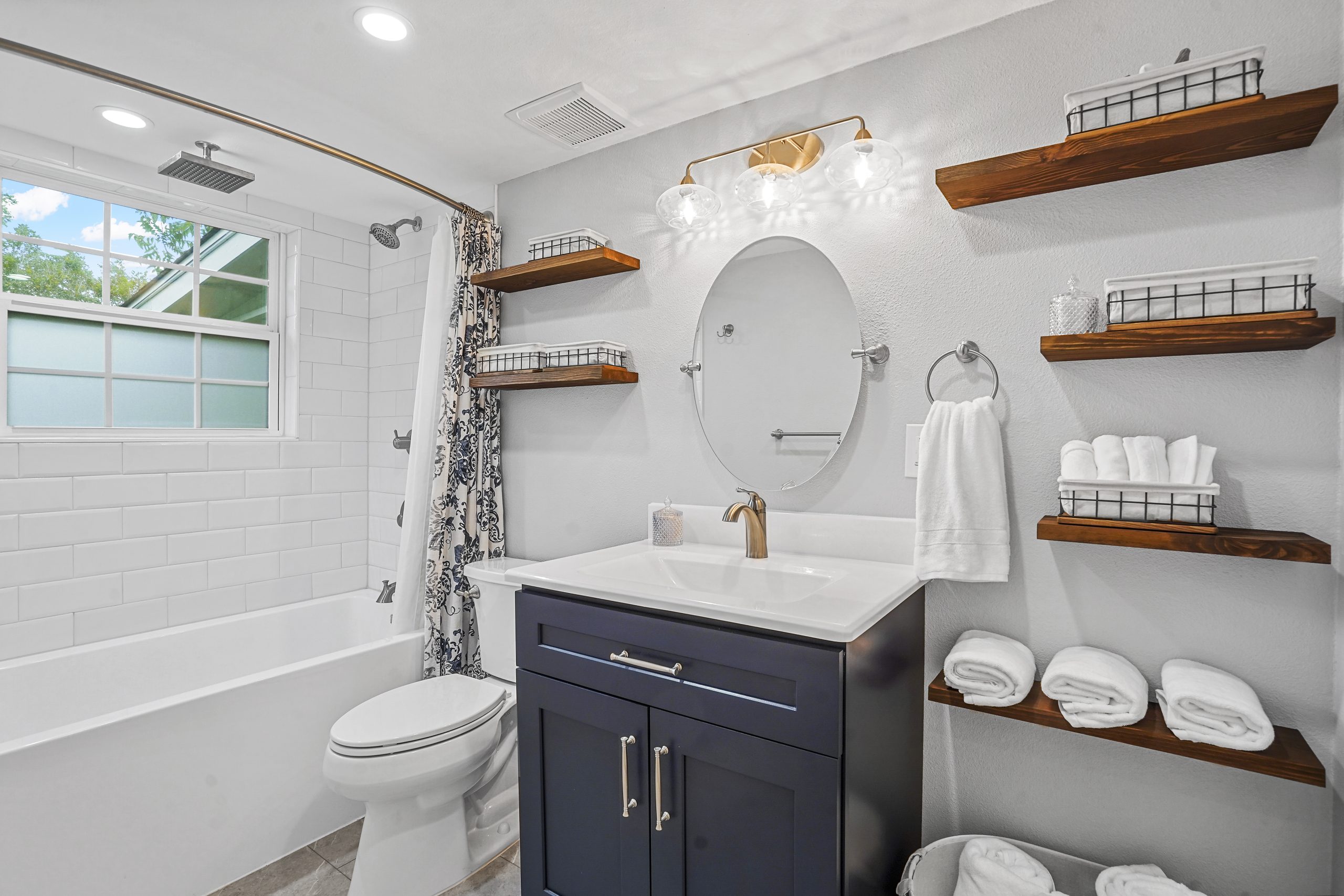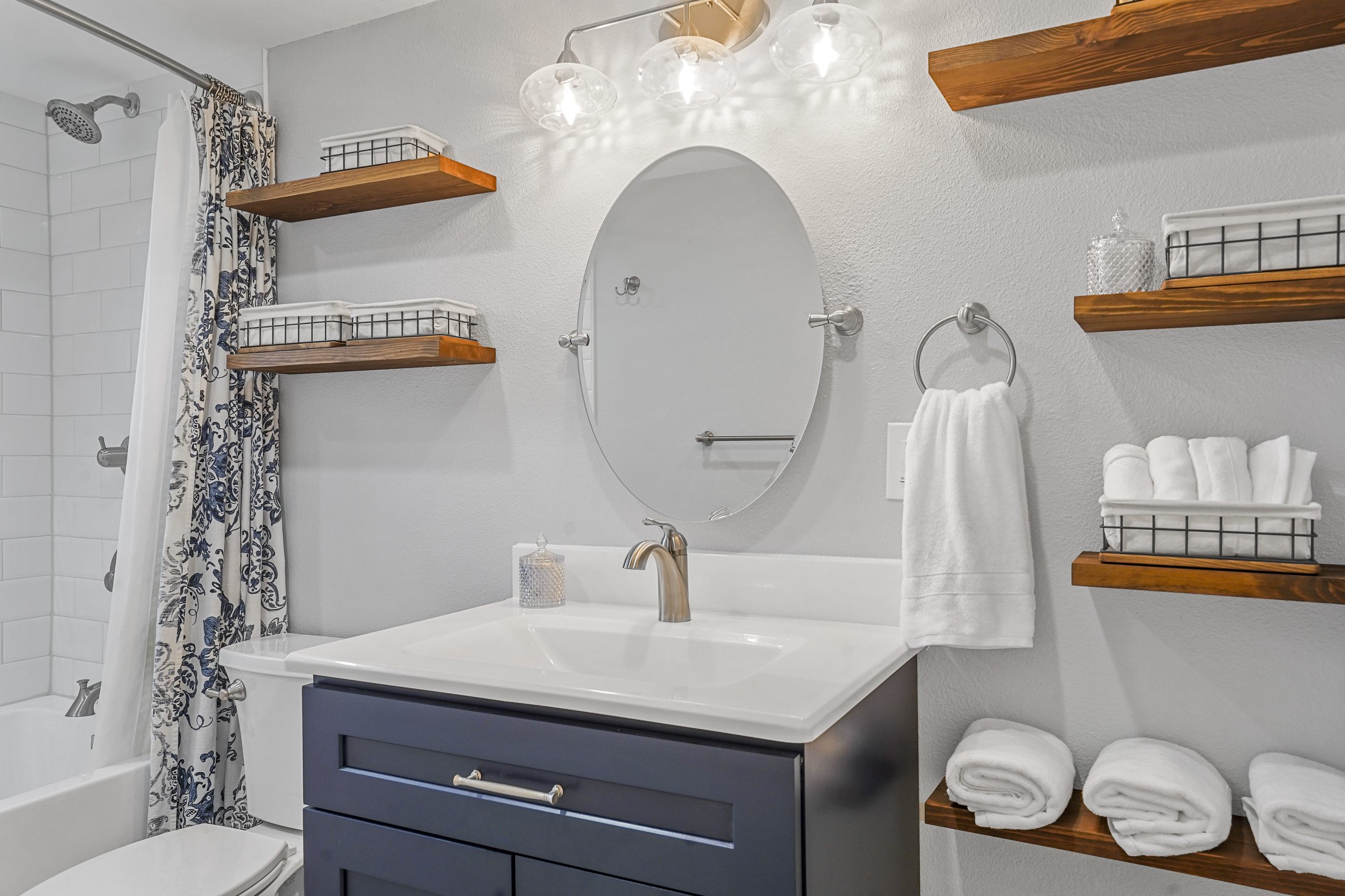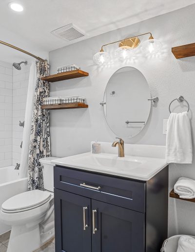 We love the bright and clean look of the shower tub combo and the blue vanity.