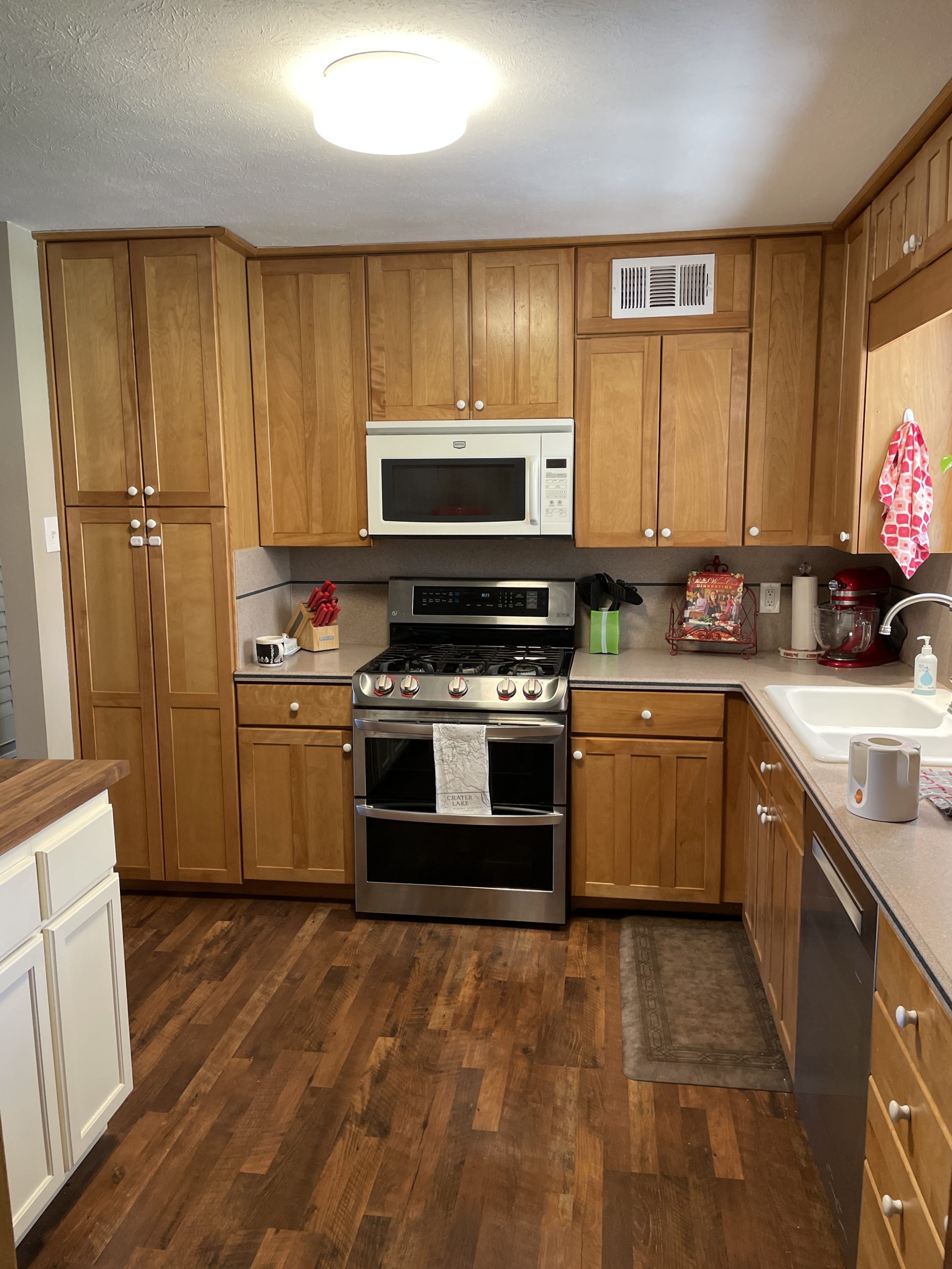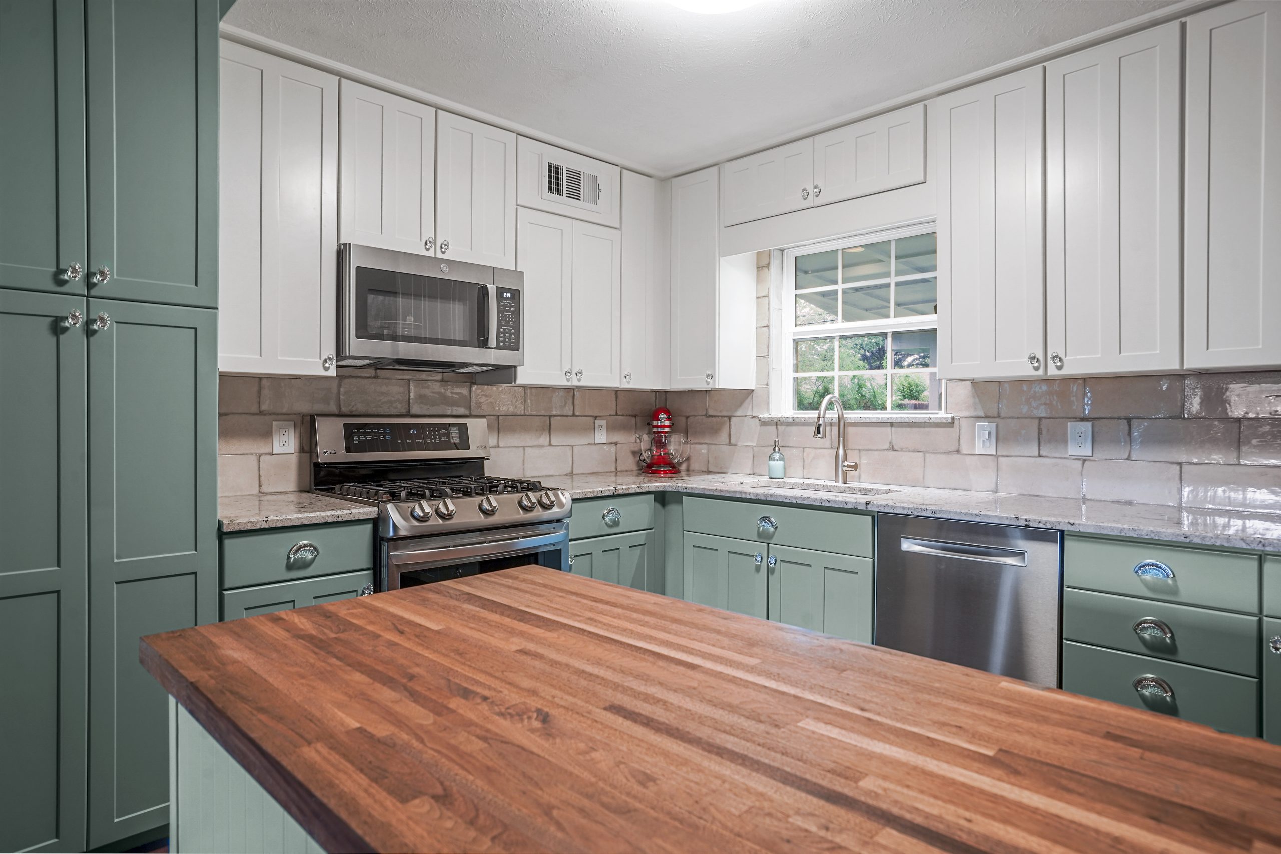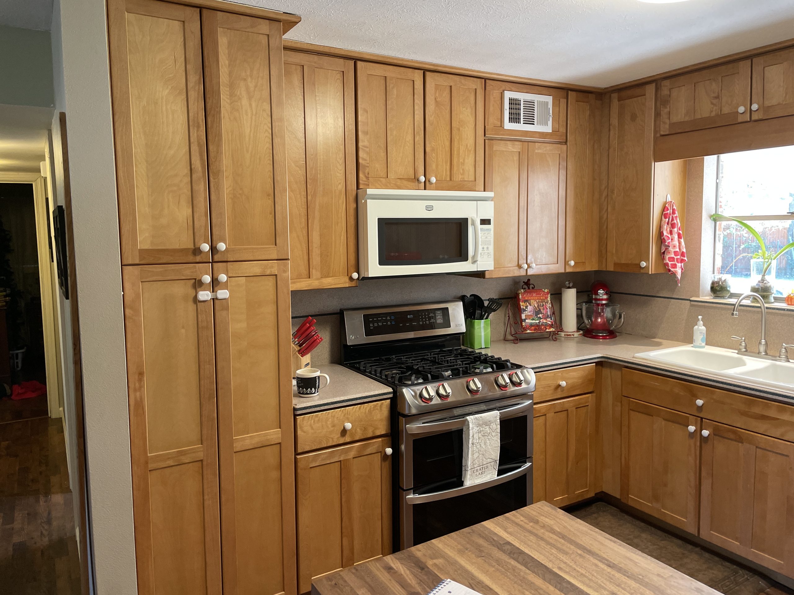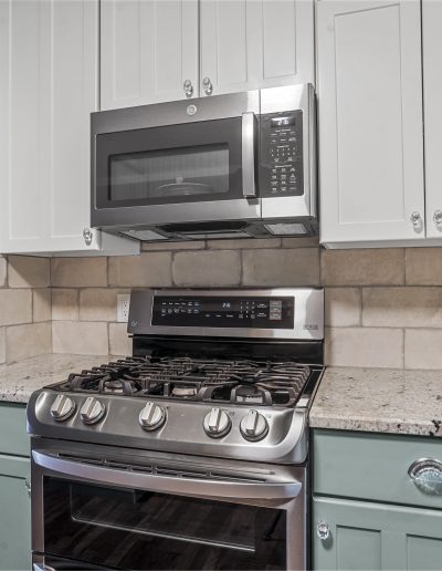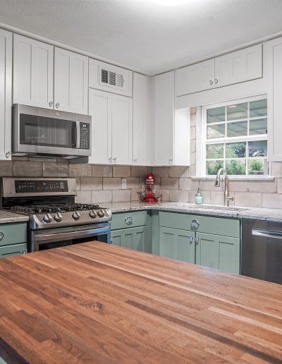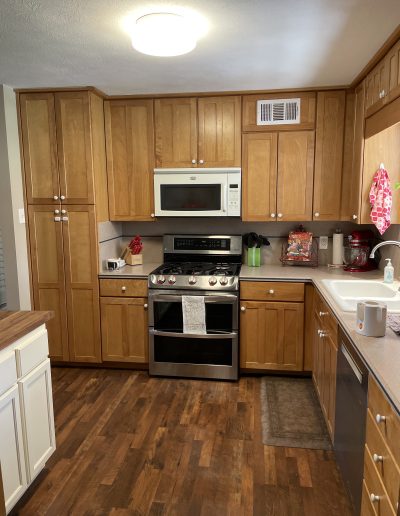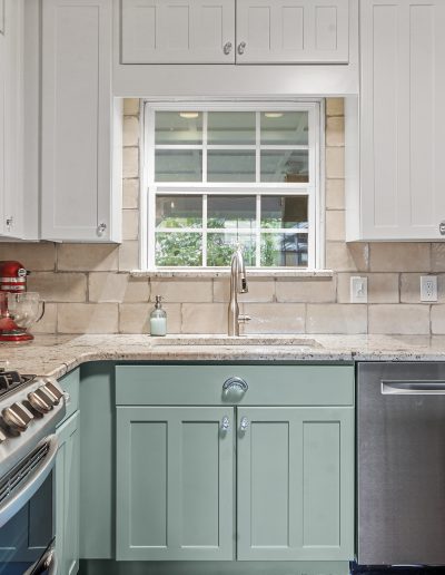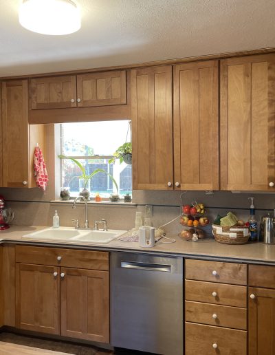 snode This kitchen in Saginaw was functional for our clients but a little outdated. By painting the existing cabinets and adding a new backsplash and countertops, we were able to give this space a facelift without breaking the bank. Before After