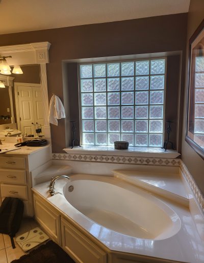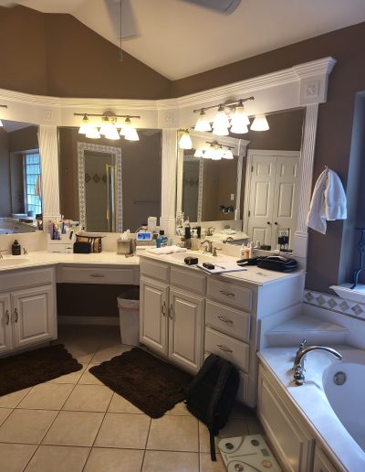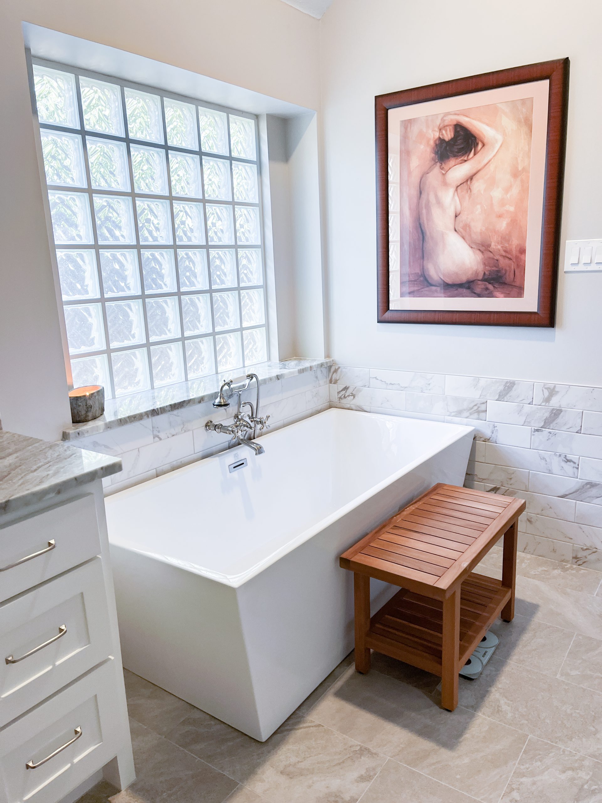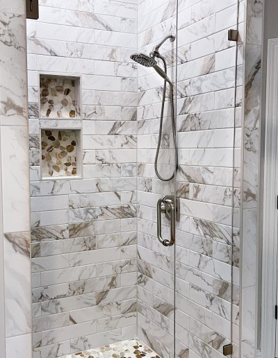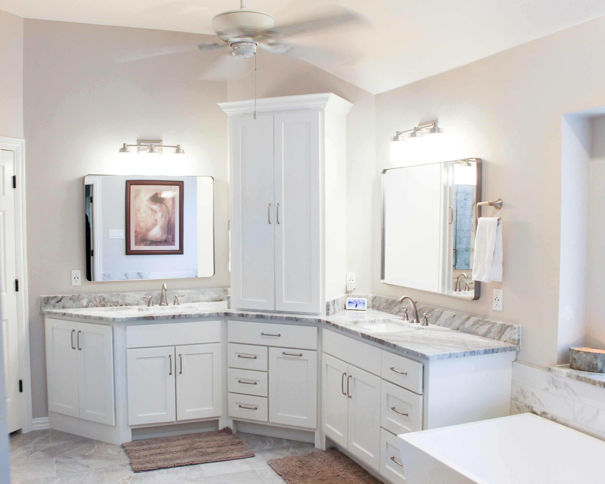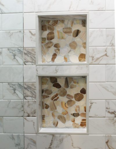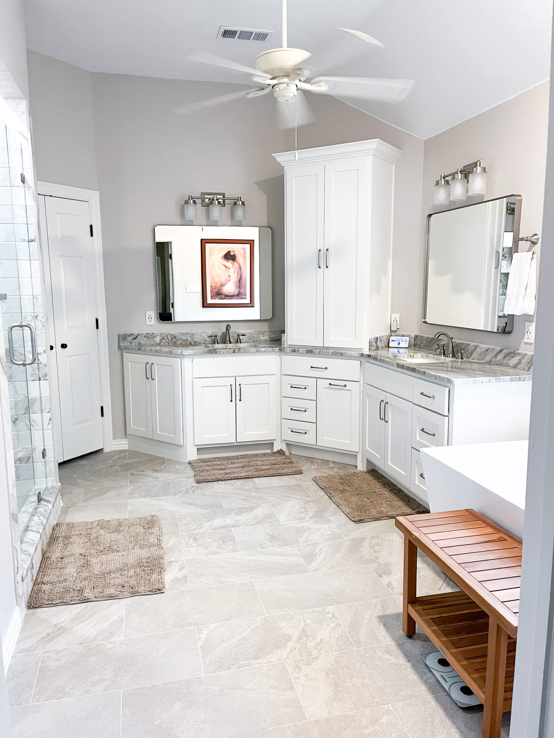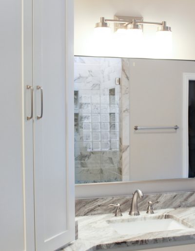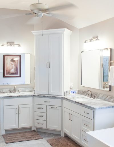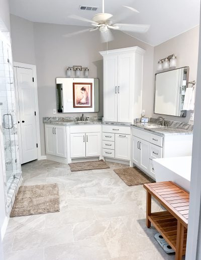 Our clients in Southlake had an outdated master bathroom. We replaced the vanities with custom-painted cabinets and granite countertops. The dated alcove tub was replaced with a modern freestanding one, and the shower was opened up to the room. The bold marble-look tile and the granite countertops added warmth to the space.