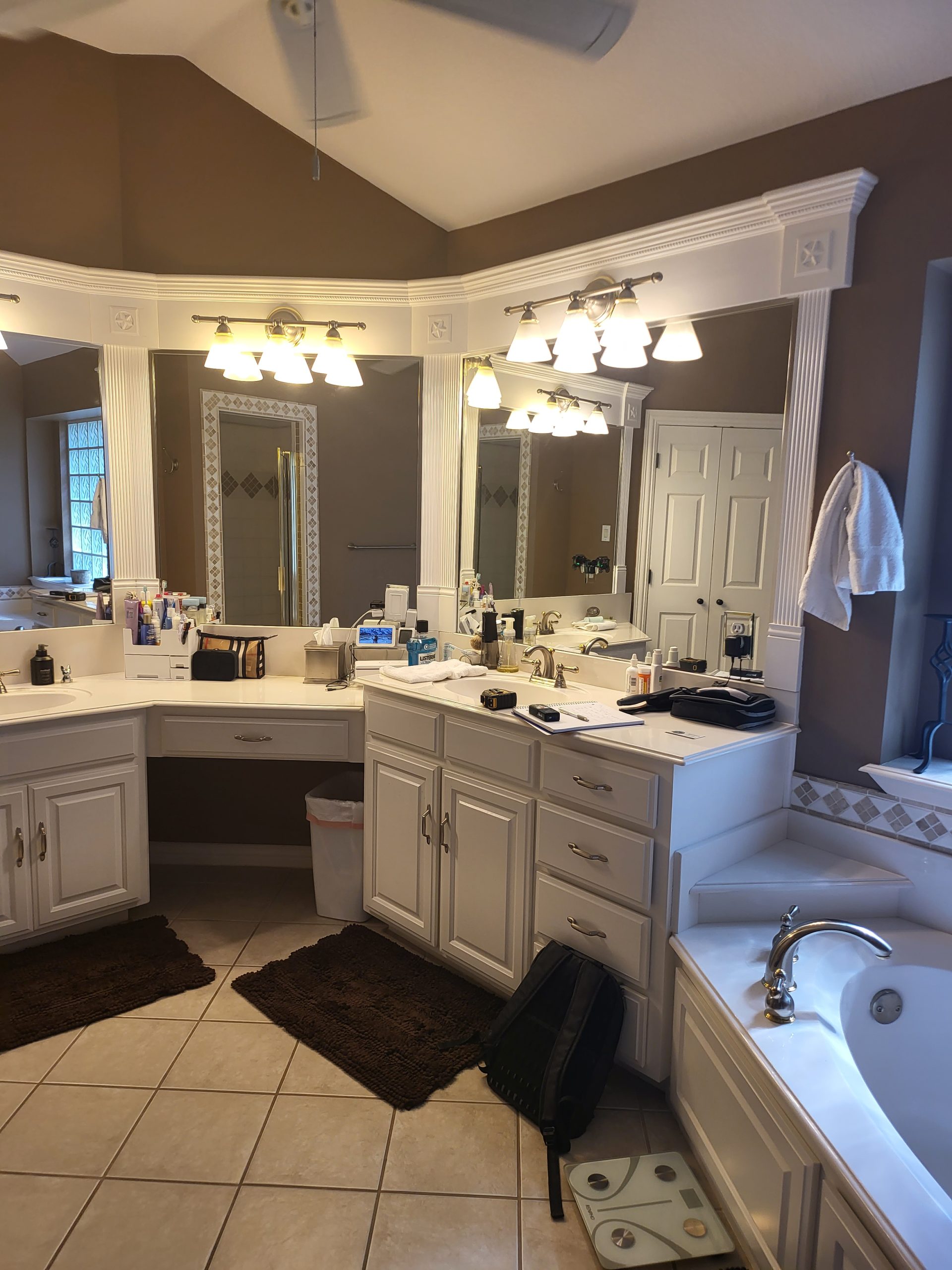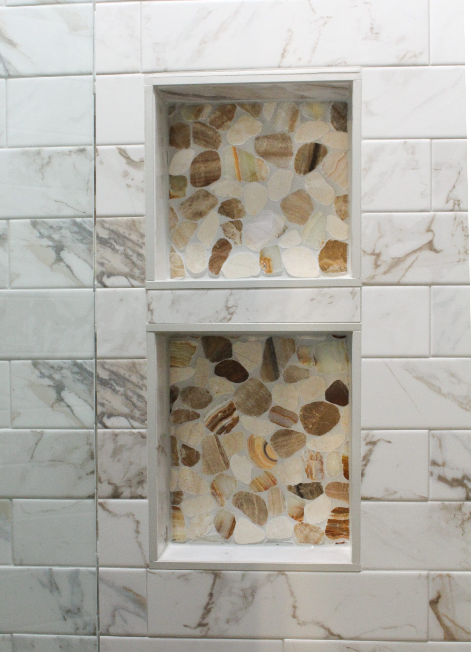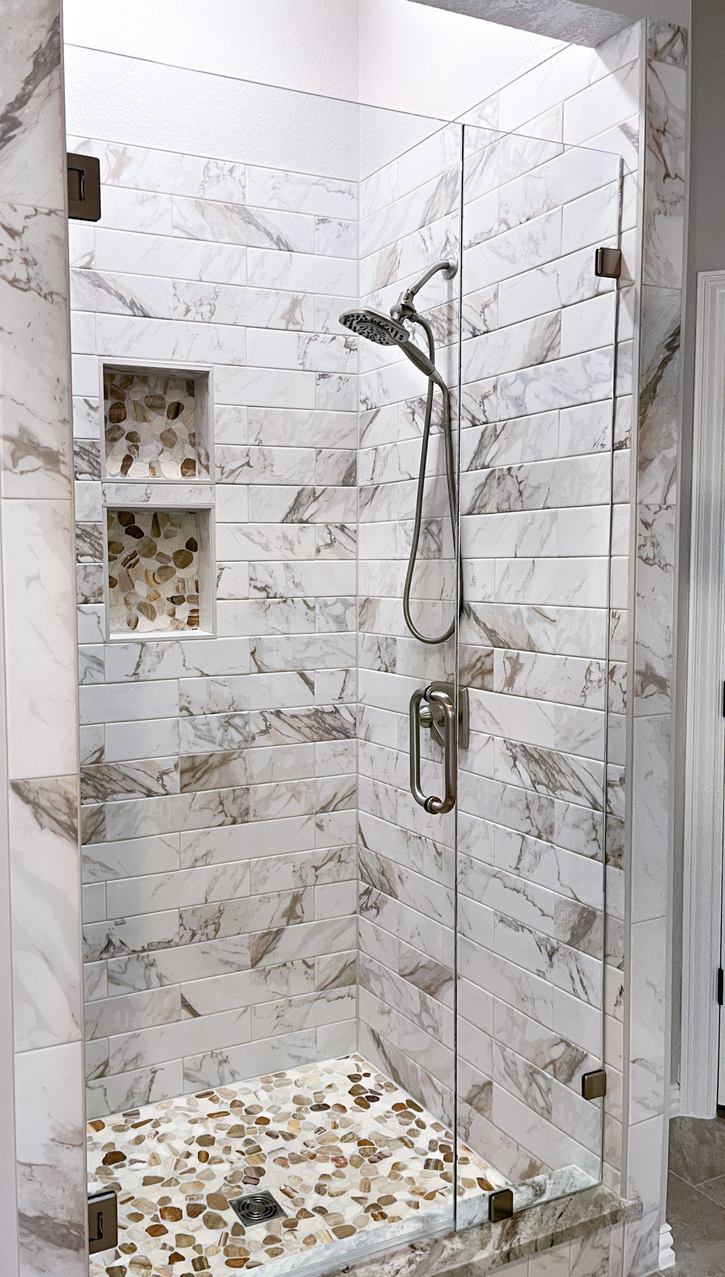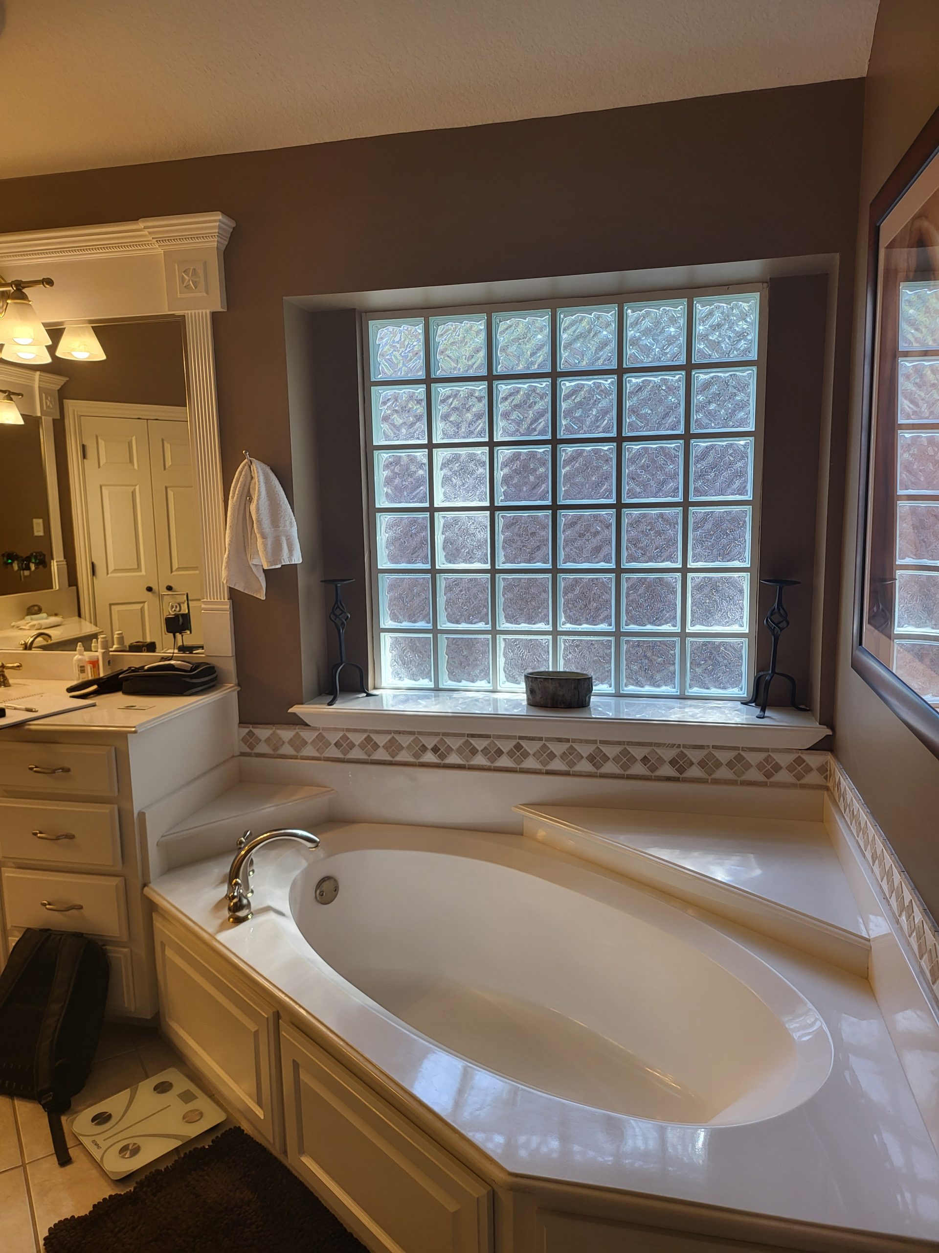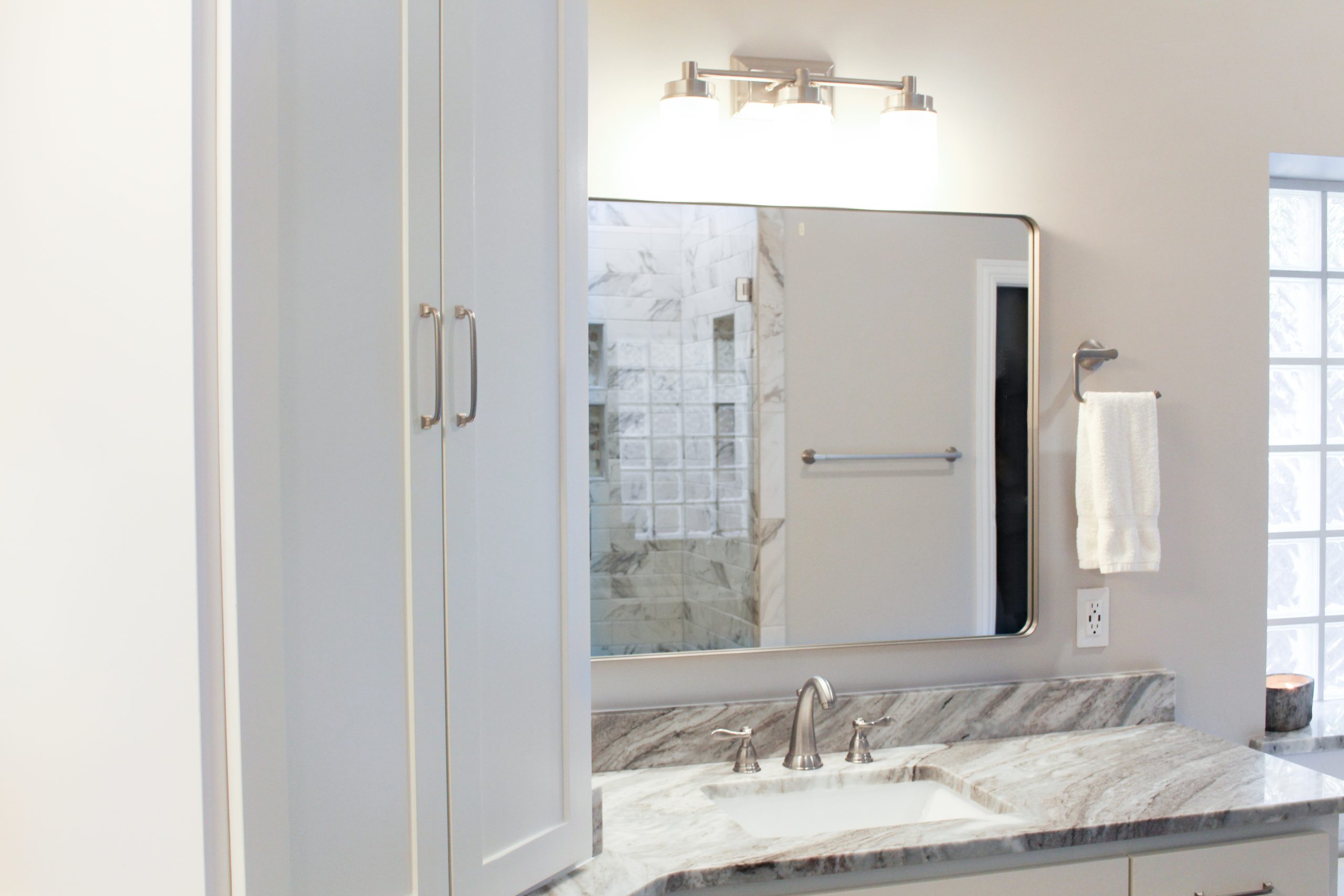 Our clients in Southlake had an outdated master bathroom. We replaced the vanities with custom-painted cabinets and granite countertops. The dated alcove tub was replaced with a modern freestanding one, and the shower was opened up to the room. The bold marble-look tile and the granite countertops added warmth to the space.